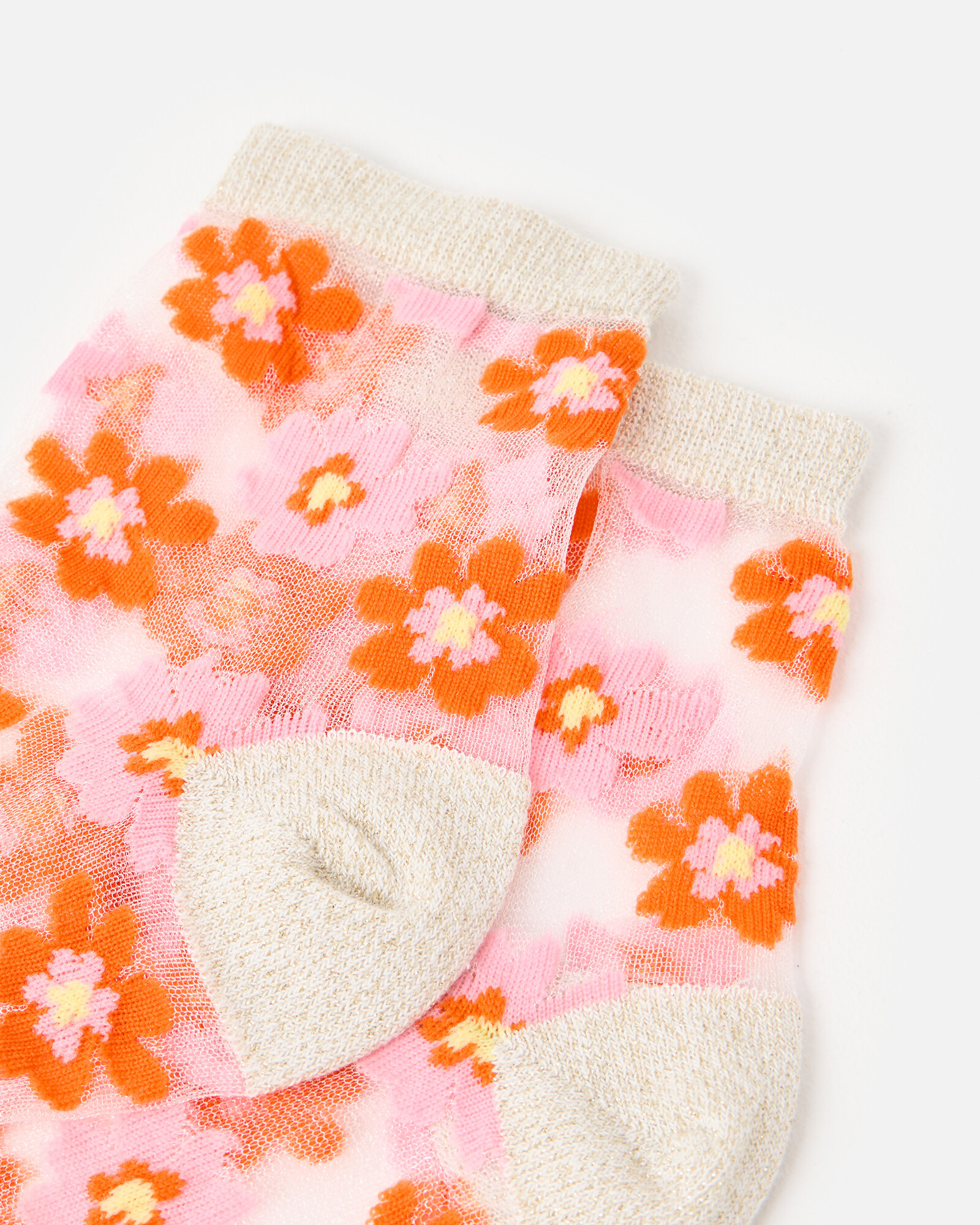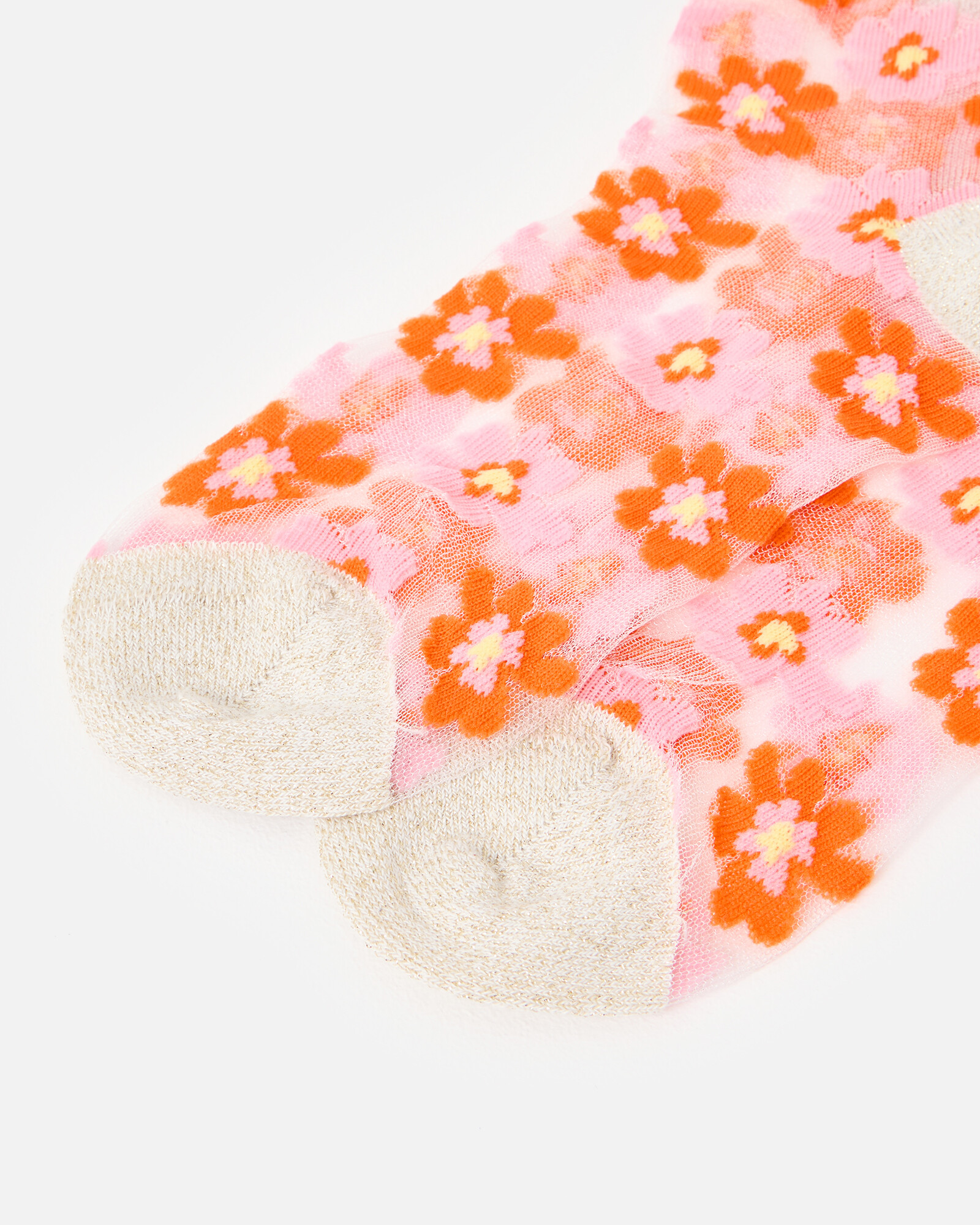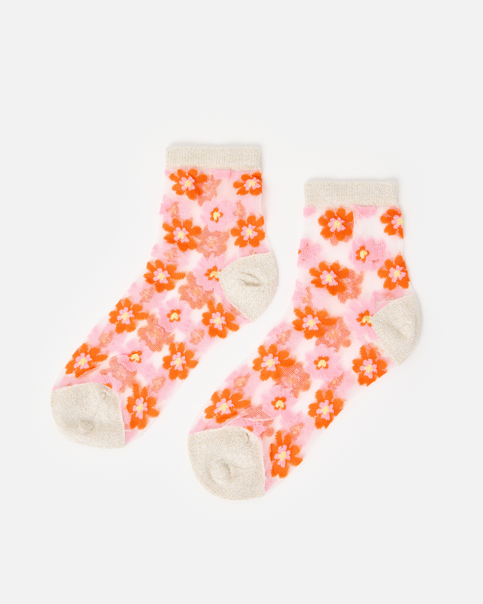 Sheer ankle socks knitted in a pink and orange floral pattern with cream sparkly trims.