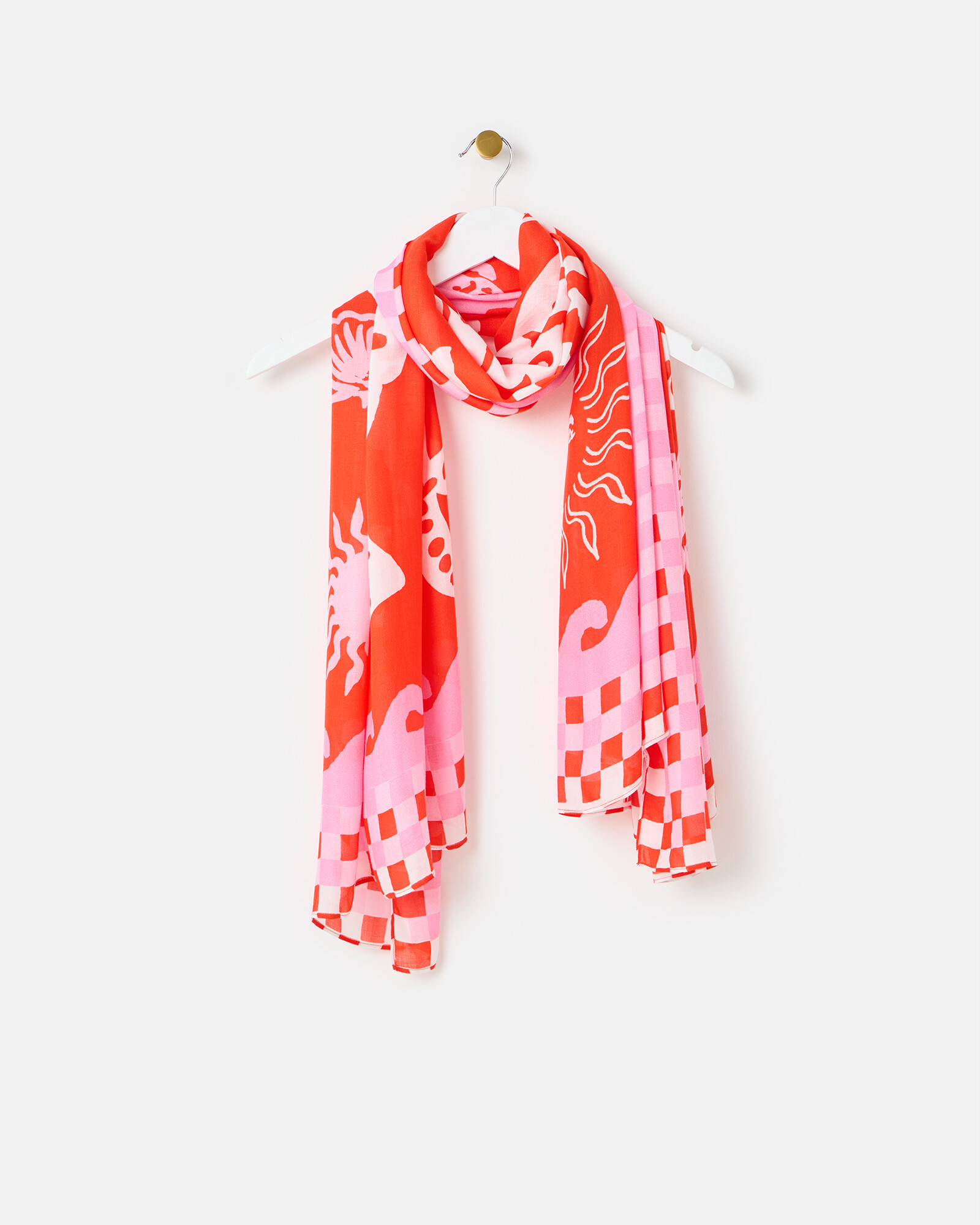 Ocean calling... Our red summer scarf features playful lobster, starfish and sun motifs, all designed in the OB creative studios, for a little seaside chic. Woven in a lightweight Lenzing™ Ecovero fabric and complemented with a pink chequerboard border, use as a light layer for breezy summer days, style as a shawl or sarong or tie on your bag strap for a stylish seasonal flourish.