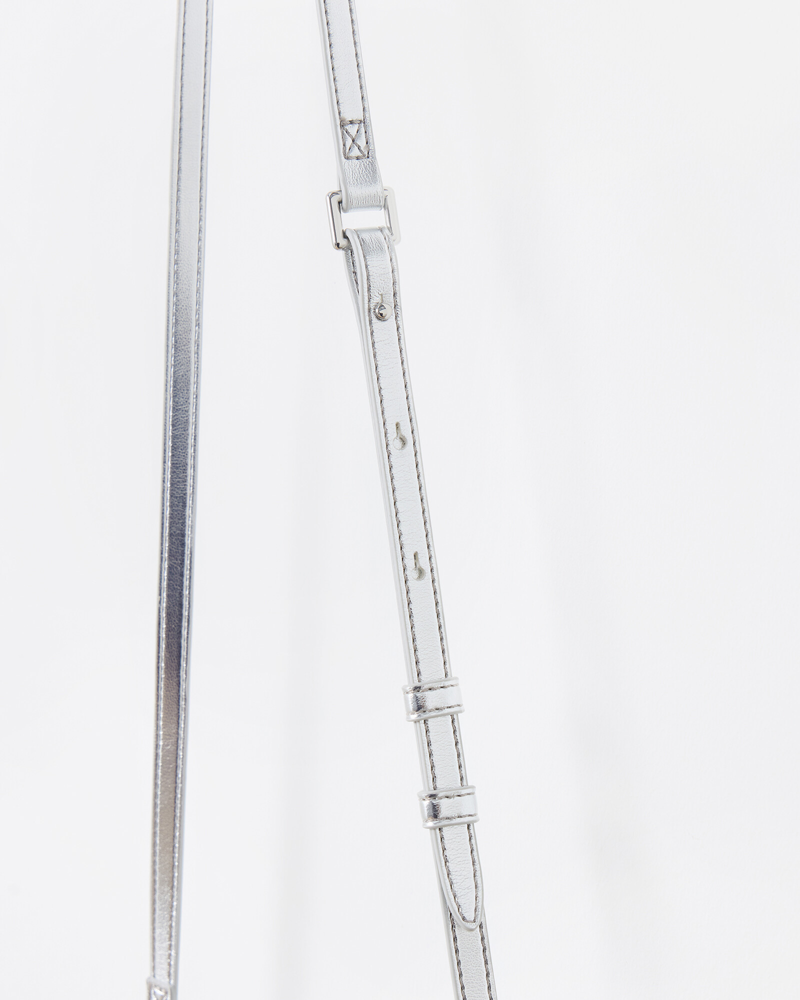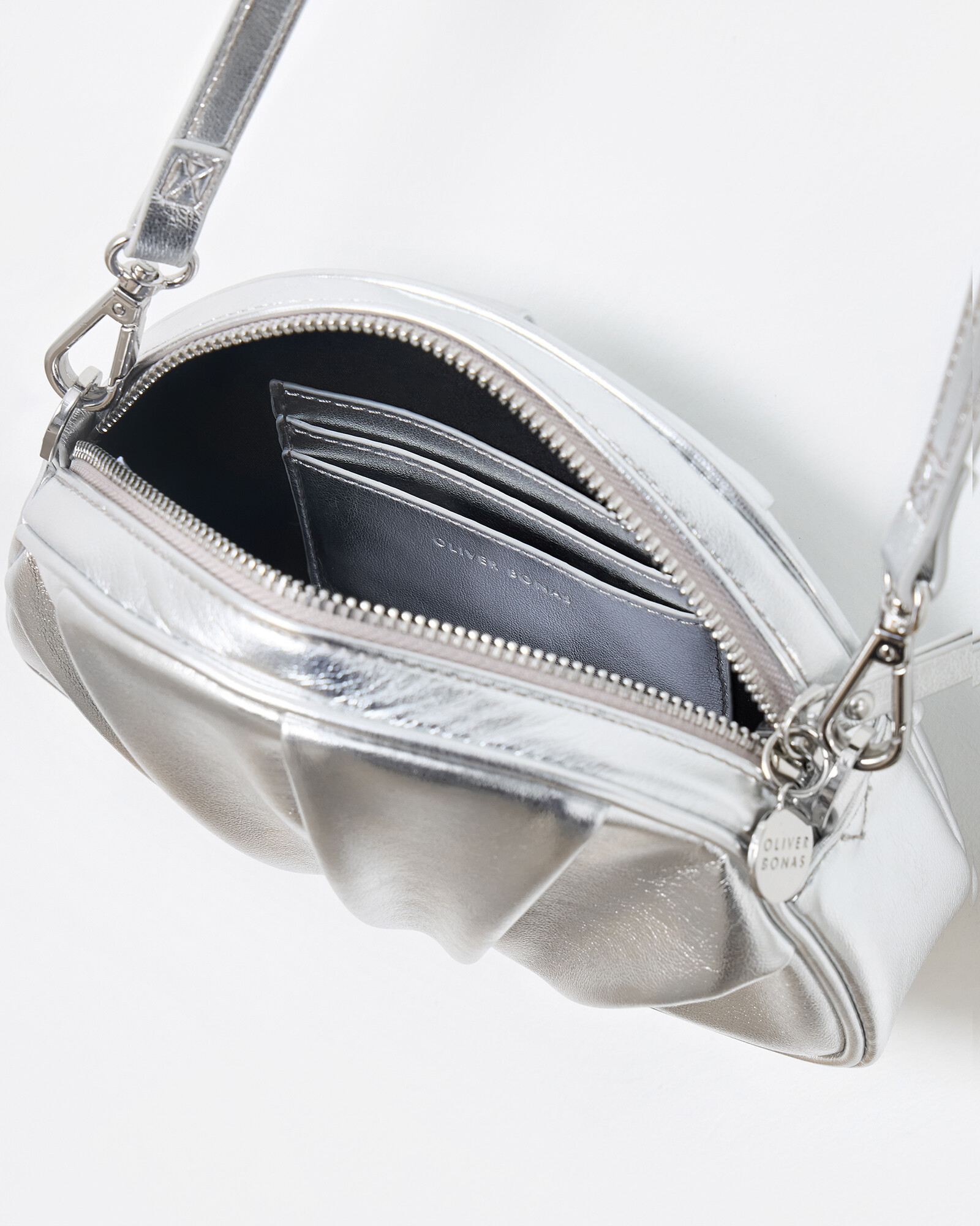 Silver croissant clutch bag with a pleated design, metallic finish and a slim, adjustable crossbody strap. Remove the strap to wear as a clutch bag, making it a perfect addition to your holiday outfits and wedding guest attire.