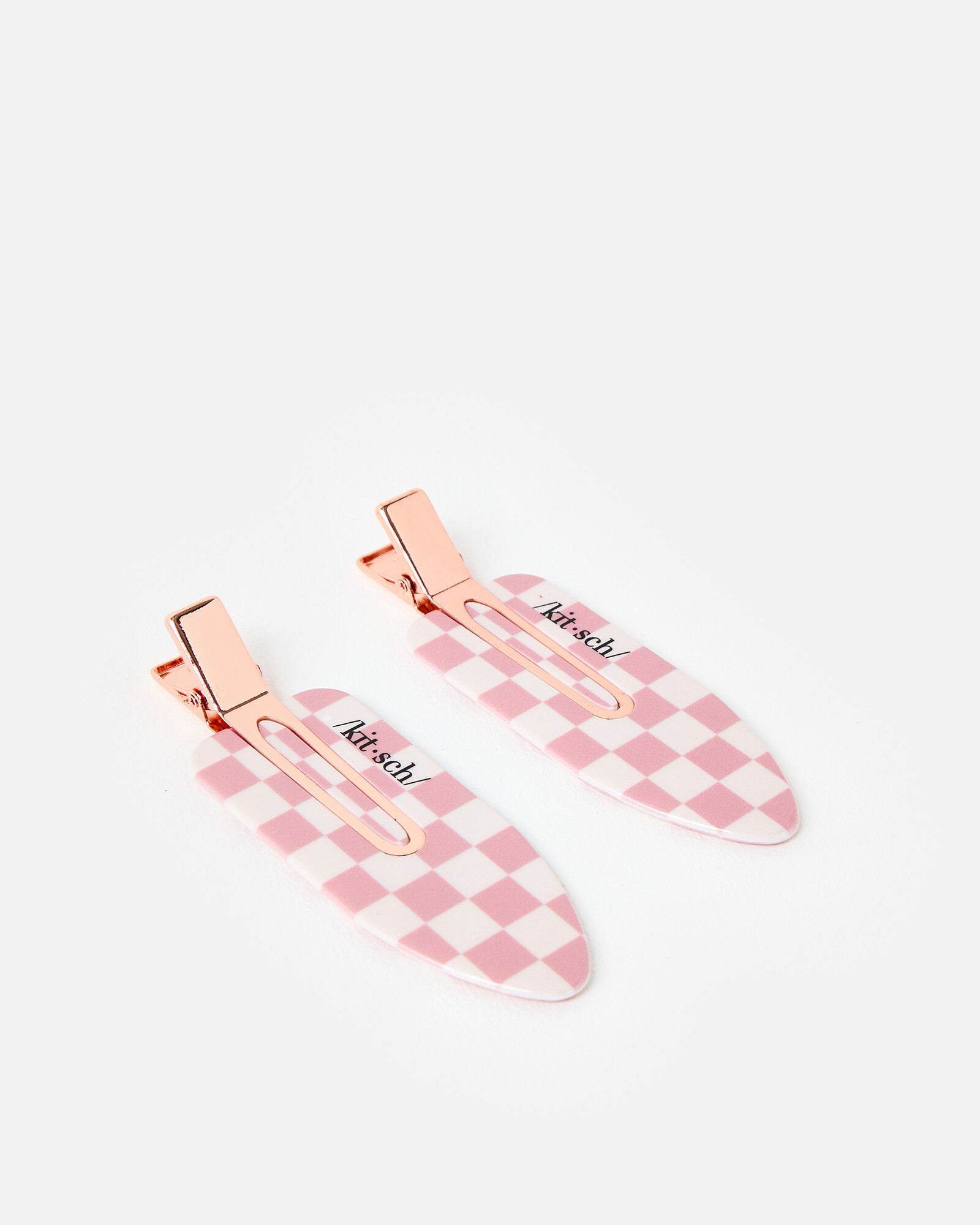 This duo of creaseless clips from Kitsch helps keep flyaways & bangs out of your face during makeup application. Made from recycled plastic in a terracotta pink and white checkerboard pattern, these clips are both kind on your hair and the environment. The XL size holds back even more hair than standard clips, and sets your style with dent-free removal.