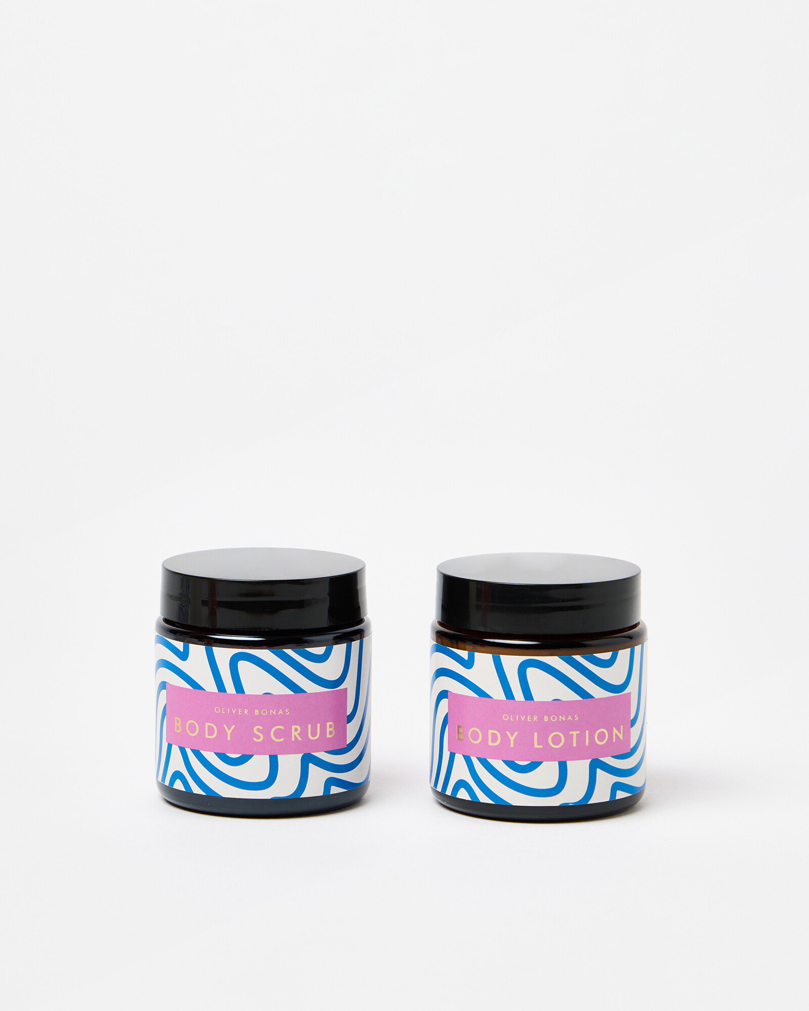 Body scrub and body lotion set scented with tuberose and sandalwood. Packaged in a gift box illustrated with a hand-drawn figure and bold graphic pattern designed in the OB creative studios.