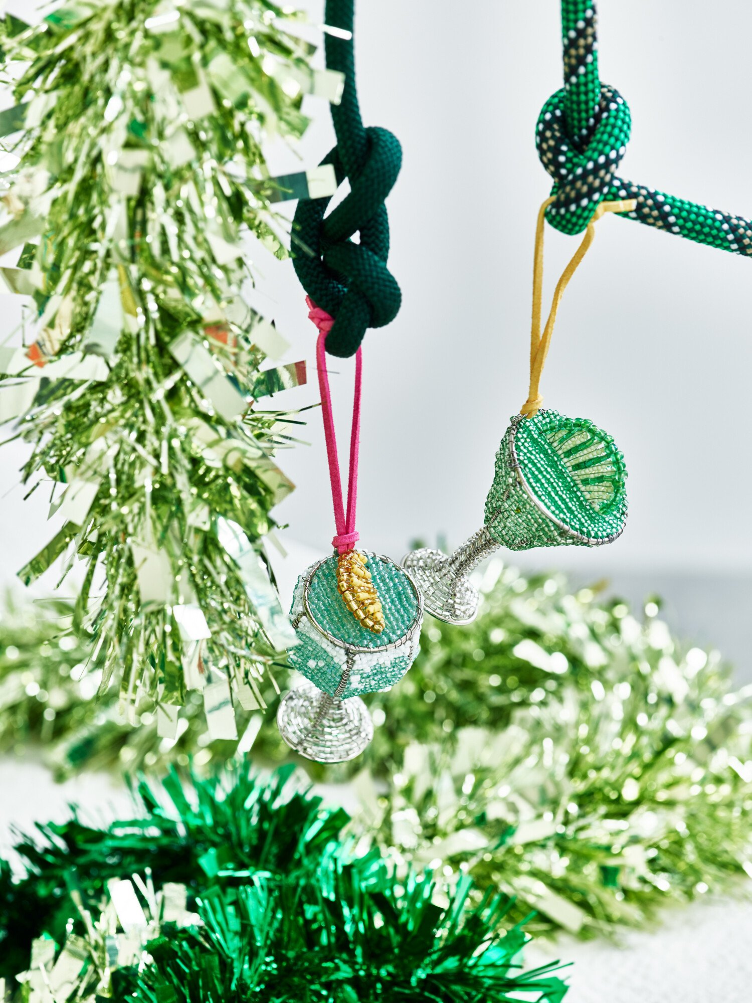 Green gin goblet Christmas decoration beaded by hand. A fun, playful addition to the tree.