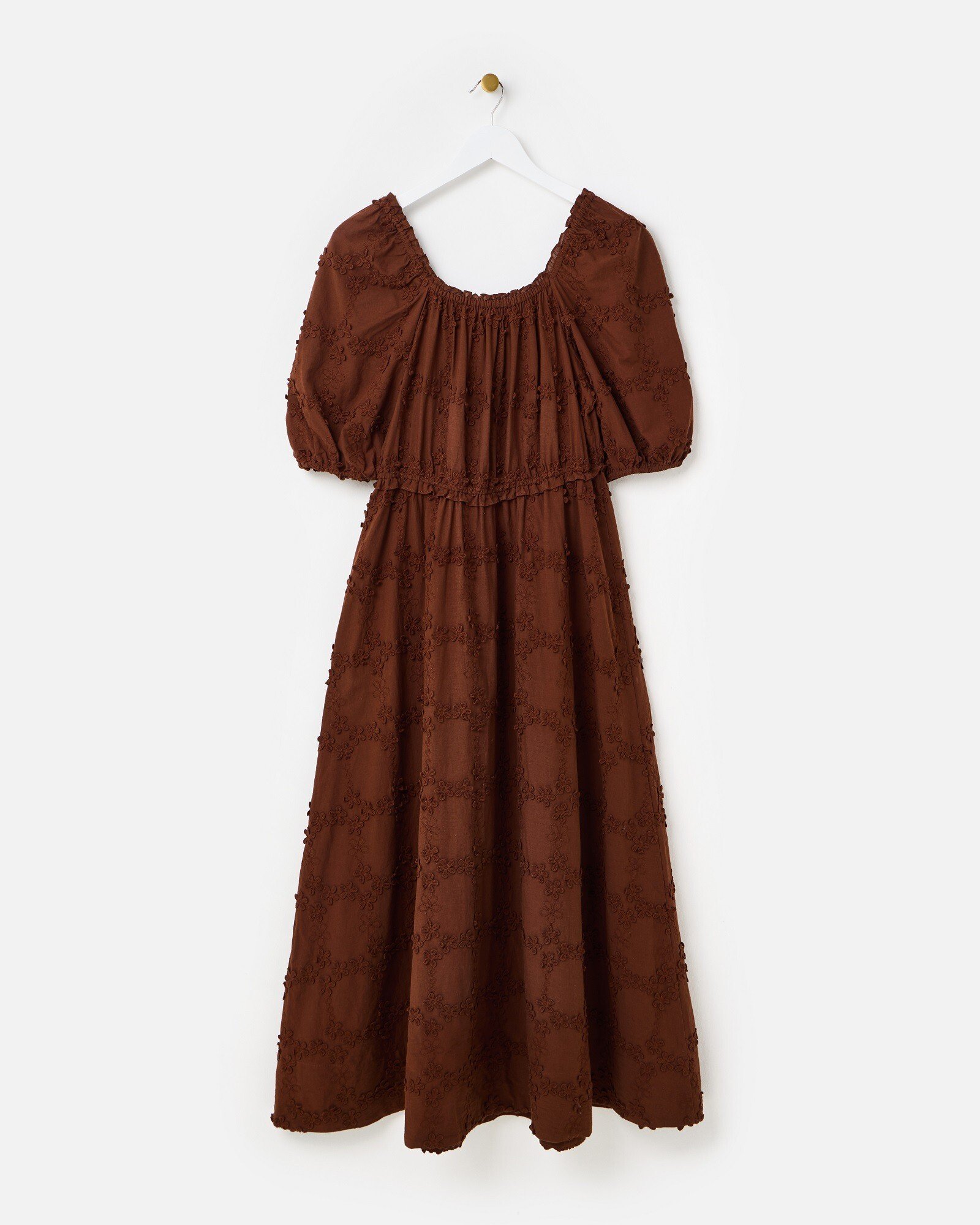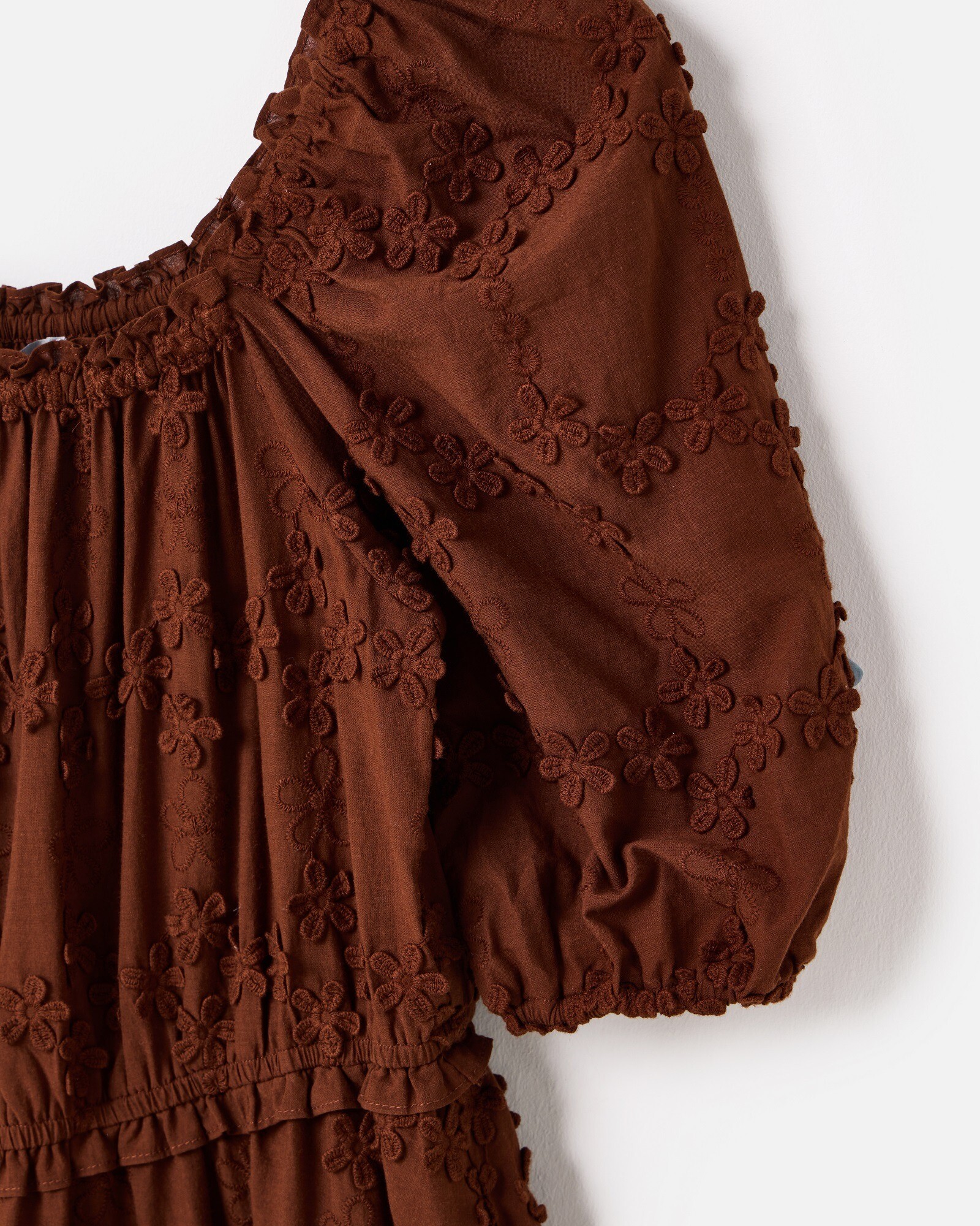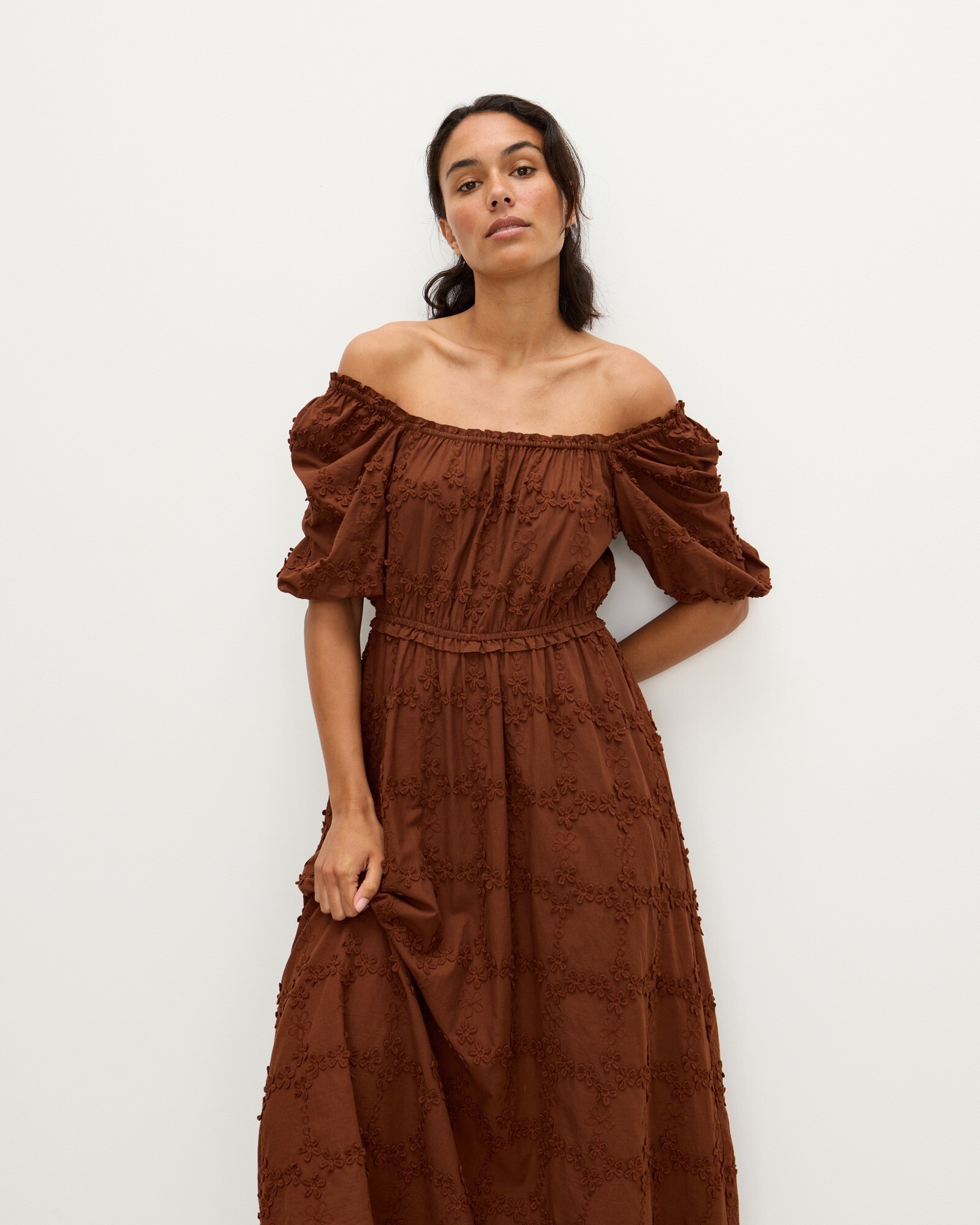 Chocolate Brown 3D Floral Textured Bardot Midi Dress