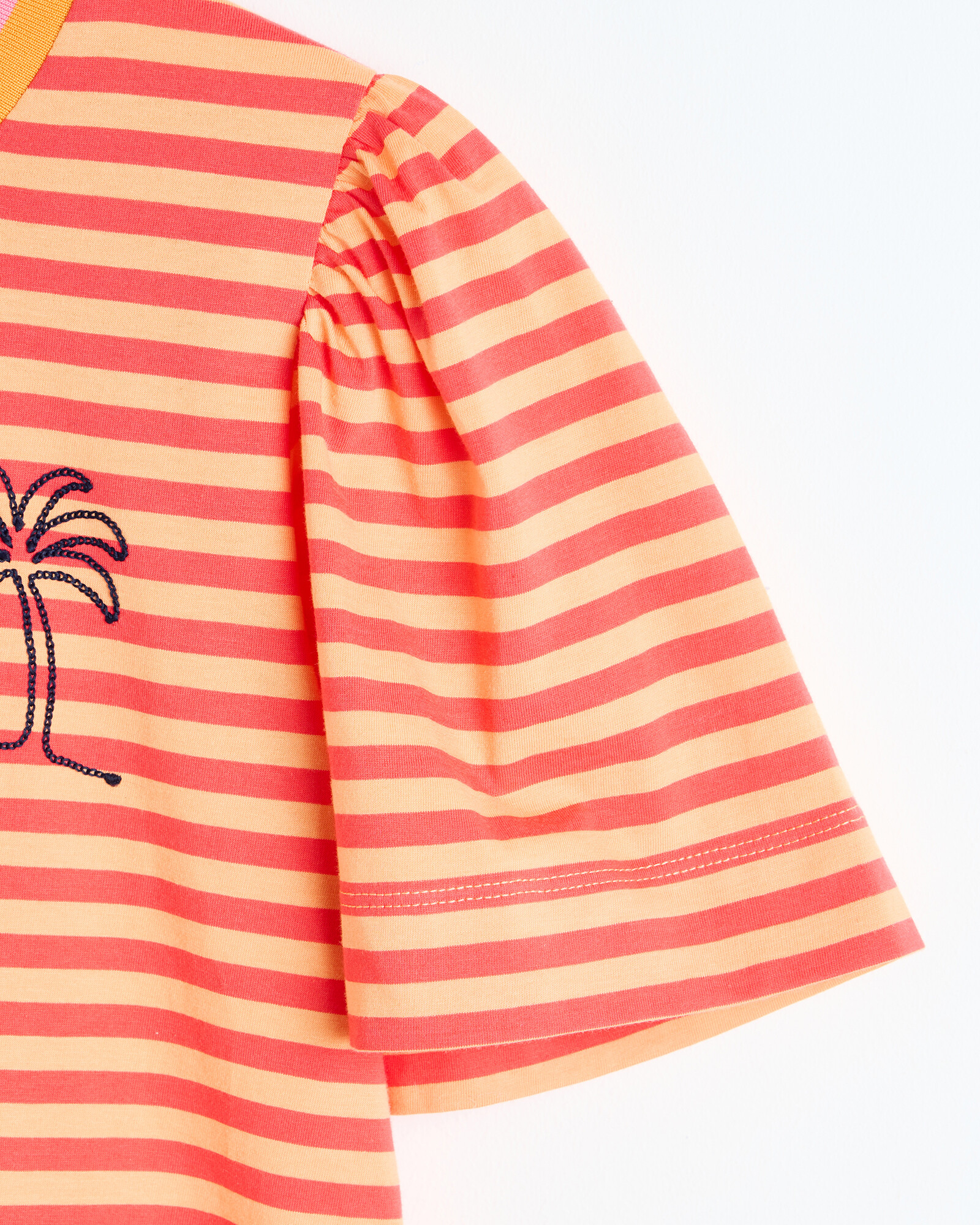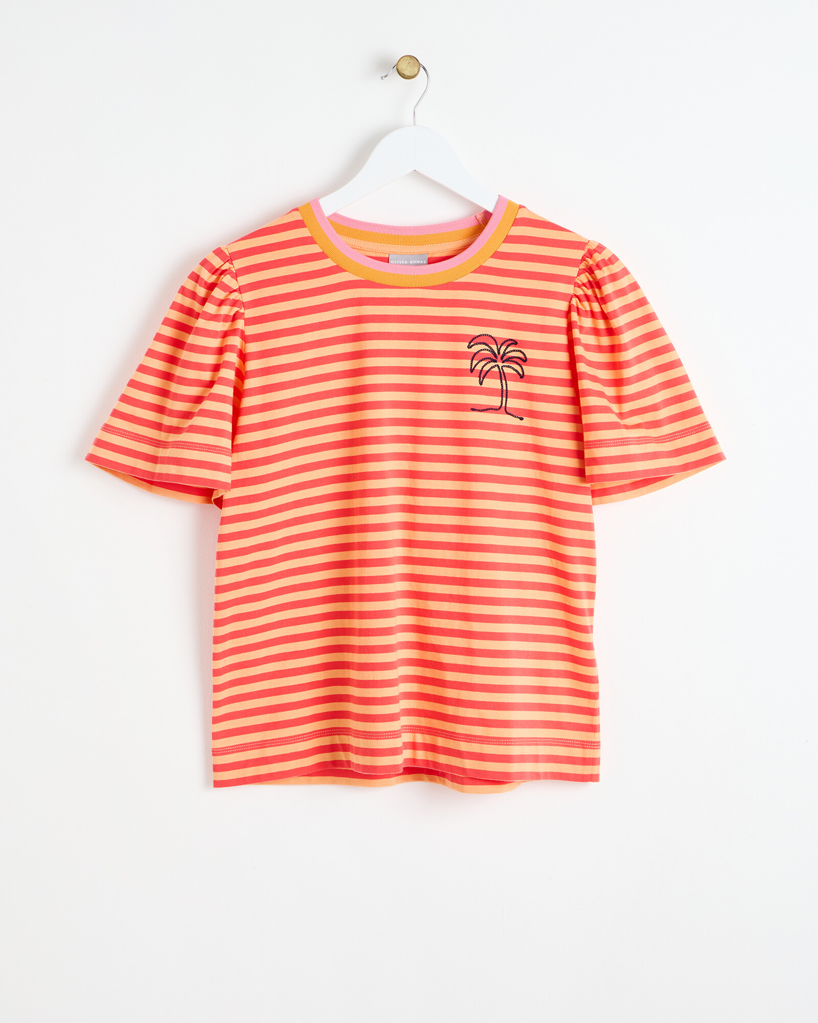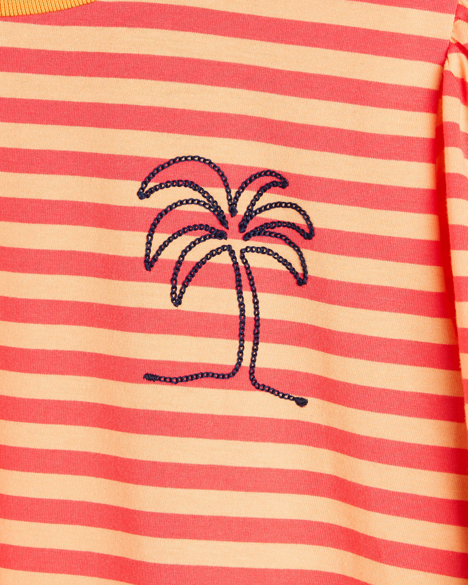 Cotton T-shirt with a tonal orange stripe, pleated sleeves and embroidered palm tree motif.