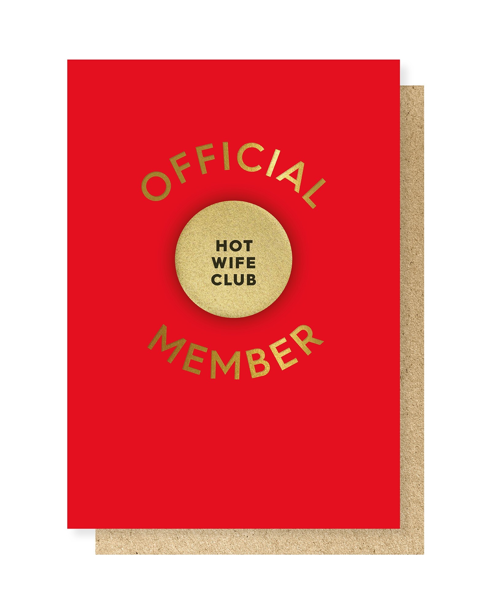 Red Valentine's Day card with gold foil text, a detachable 'hot wife club' badge and a brown kraft envelope.