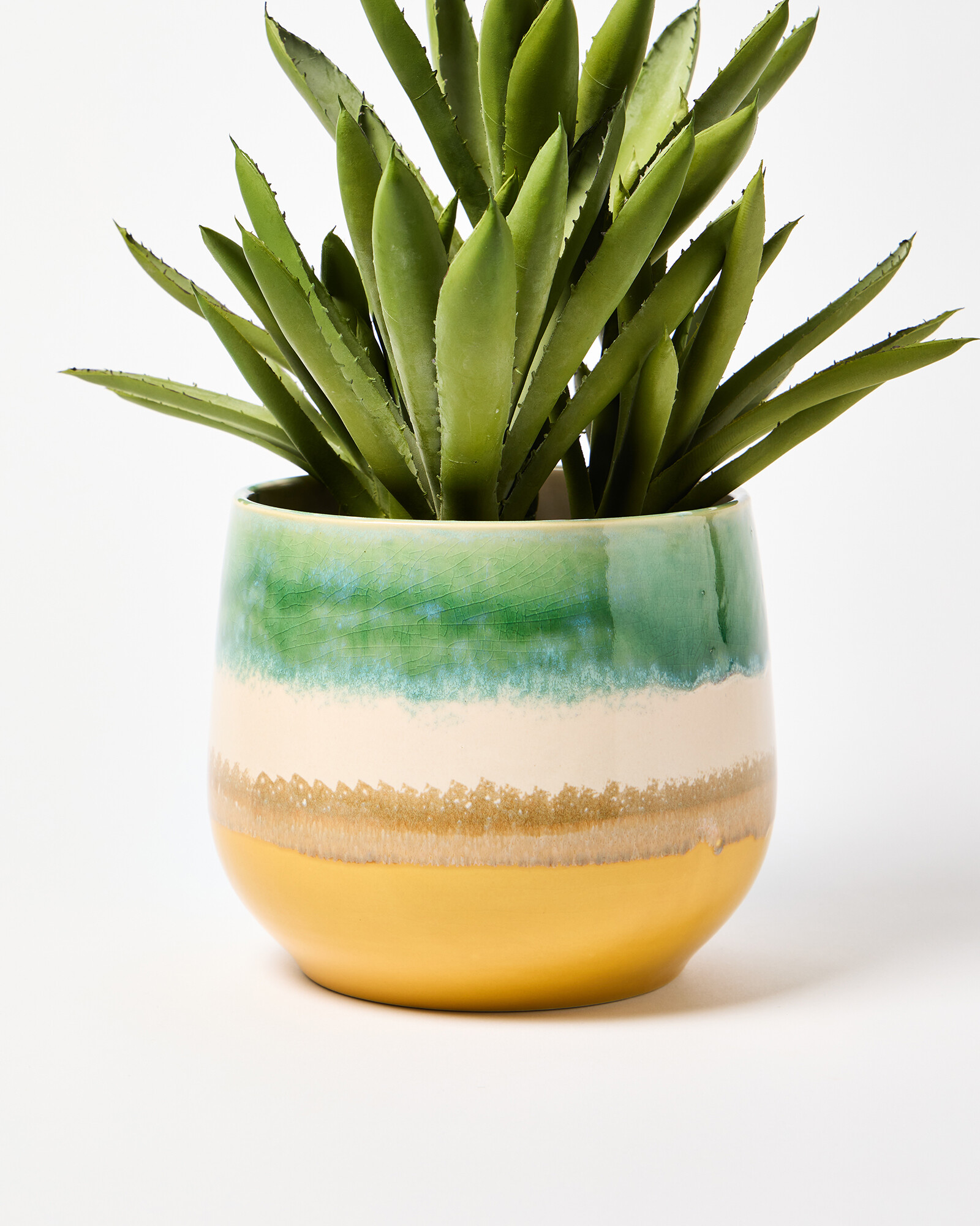 Ceramic plant pot with a green and yellow stripe pattern using a wax resit technique. A reactive glaze adds a subtle crackle and textured finish.