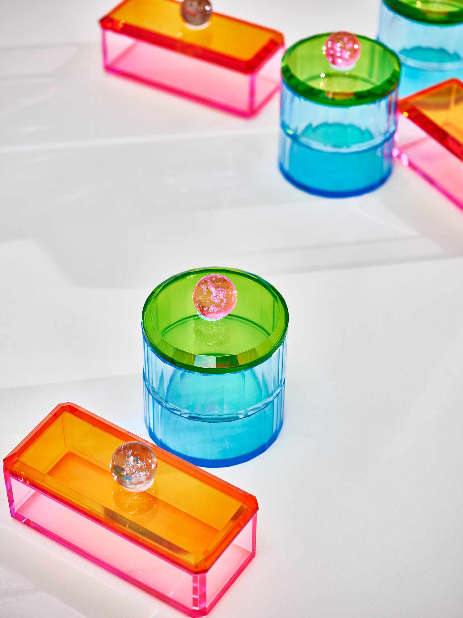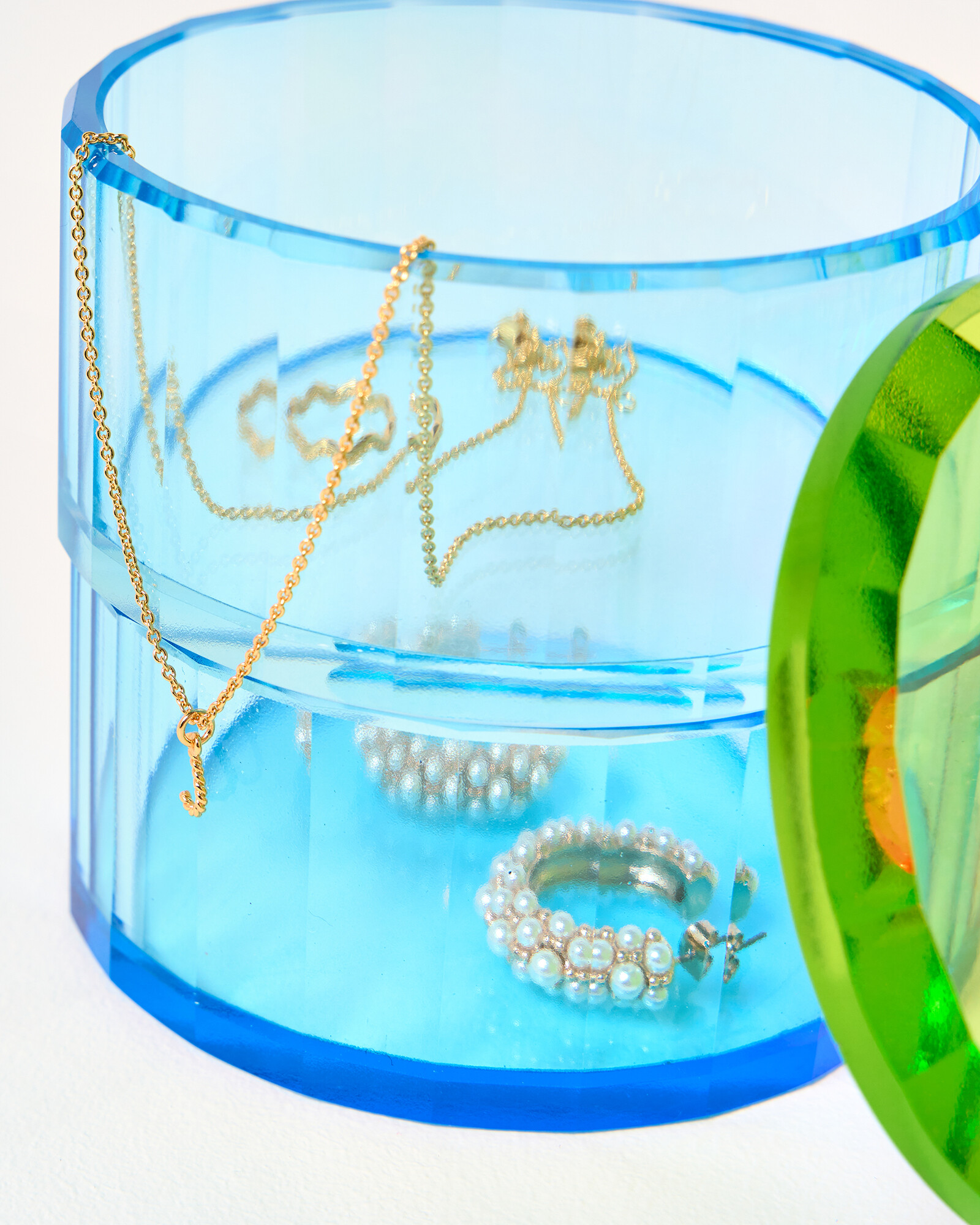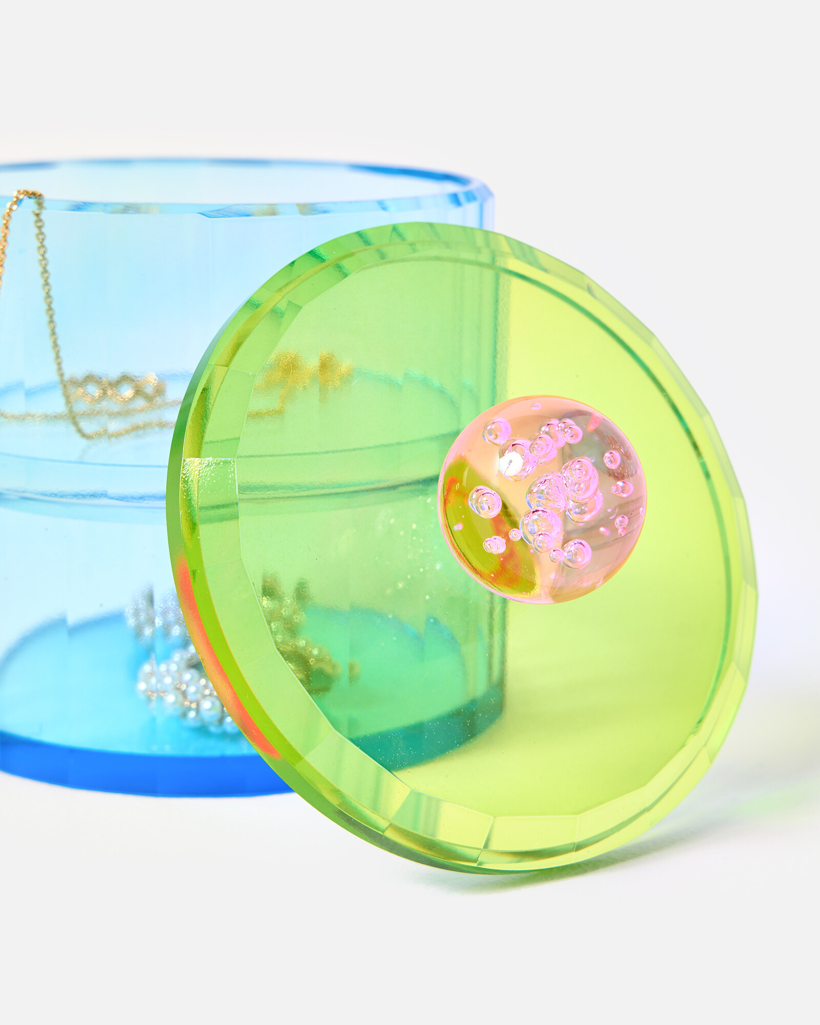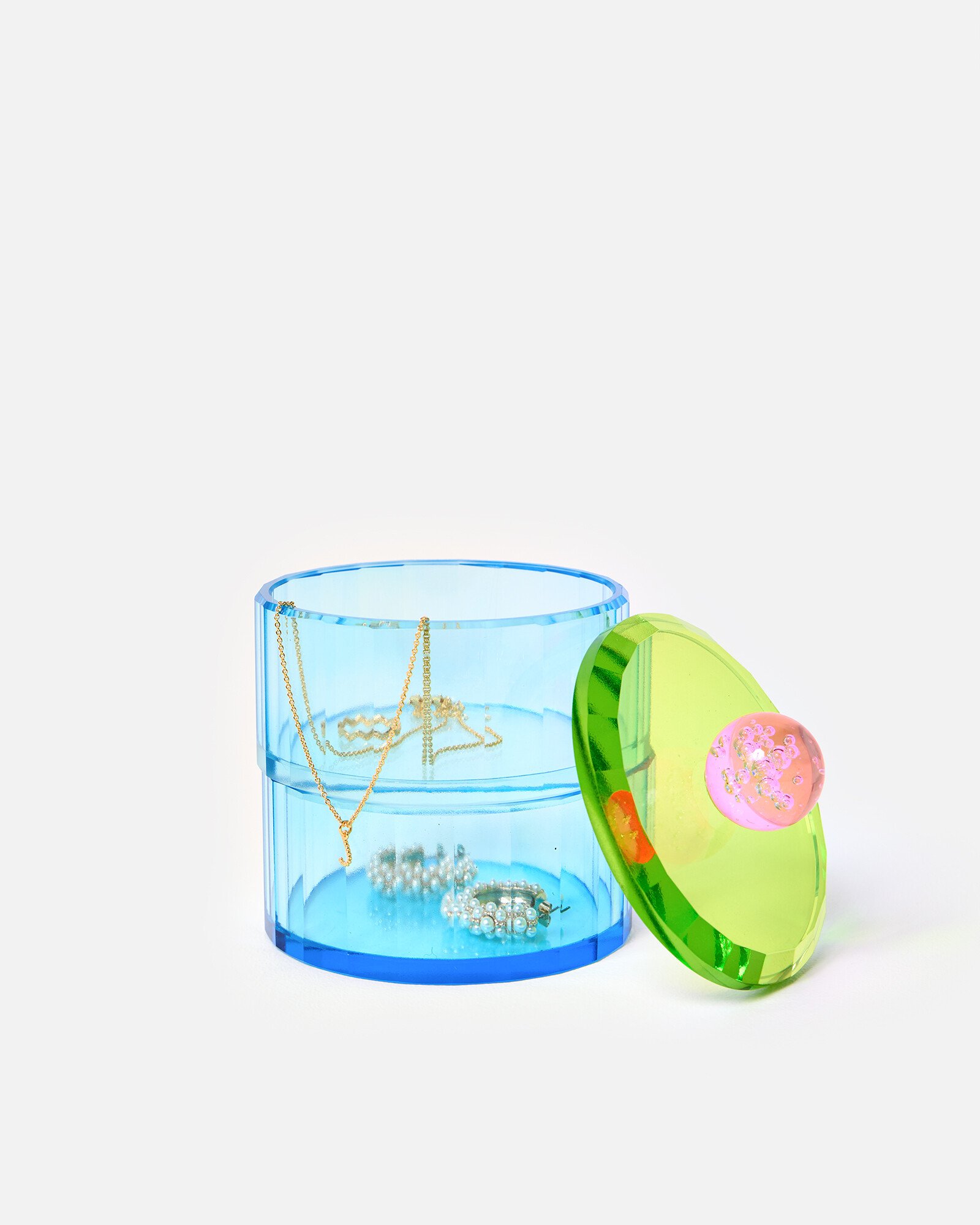 Two-tiered circular glass stacking storage pot, in a clean-cut design made from bright blue glass with a green lid and pink bobble top. Use to store jewellery and small accessories to keep organised and tidy.