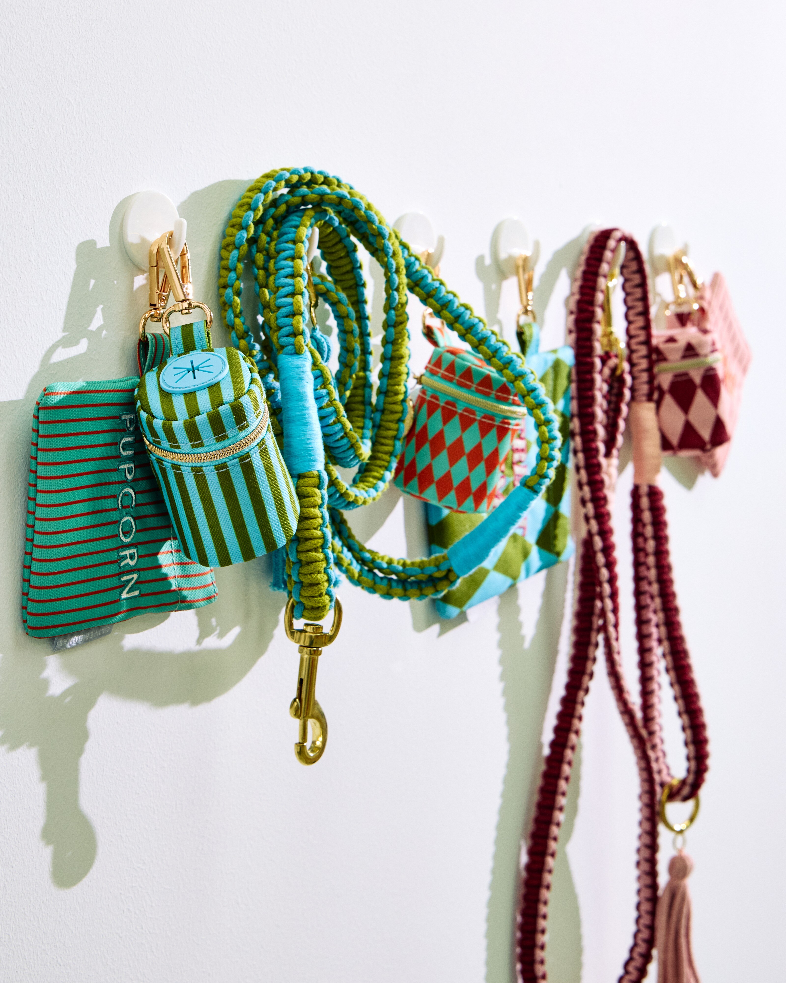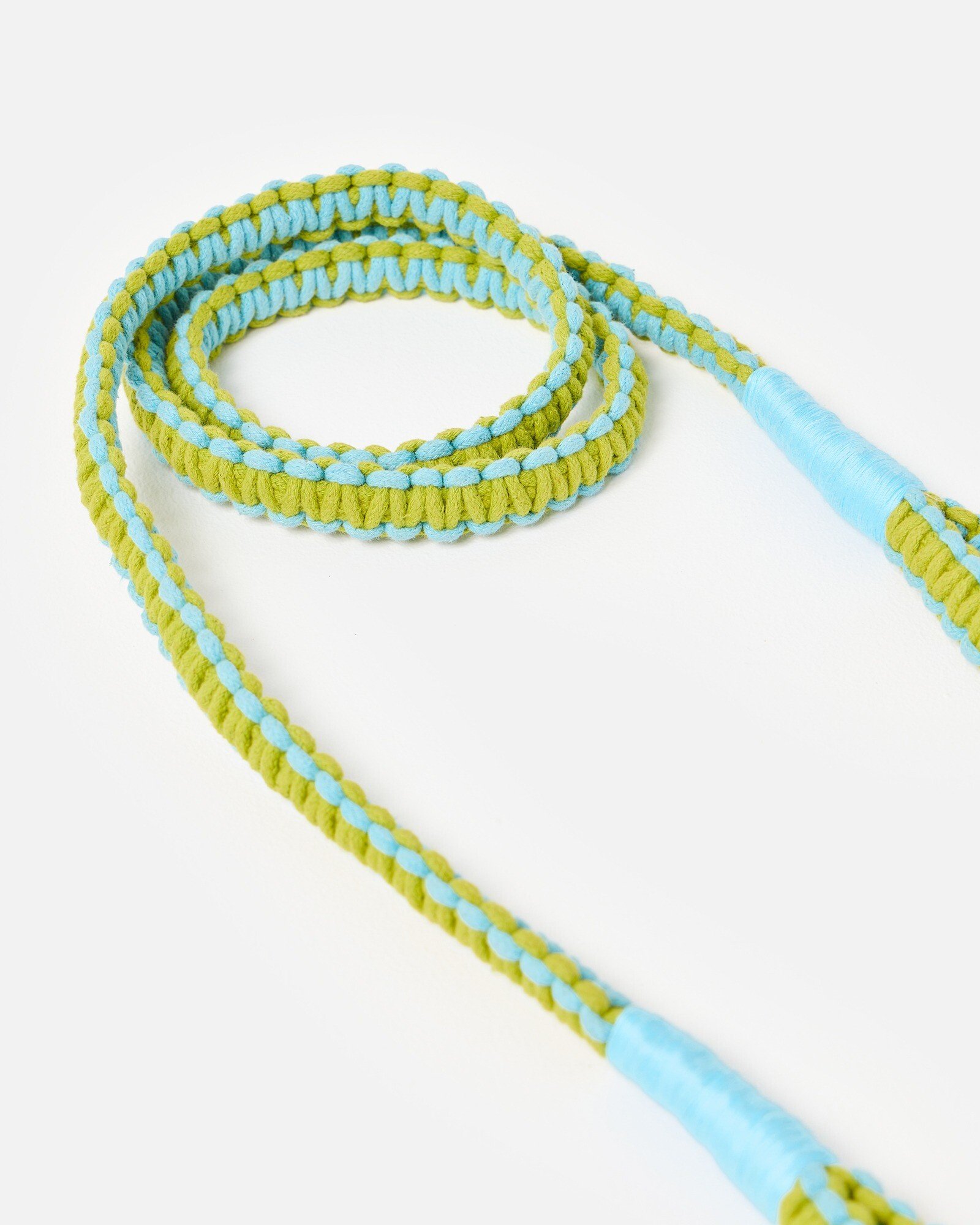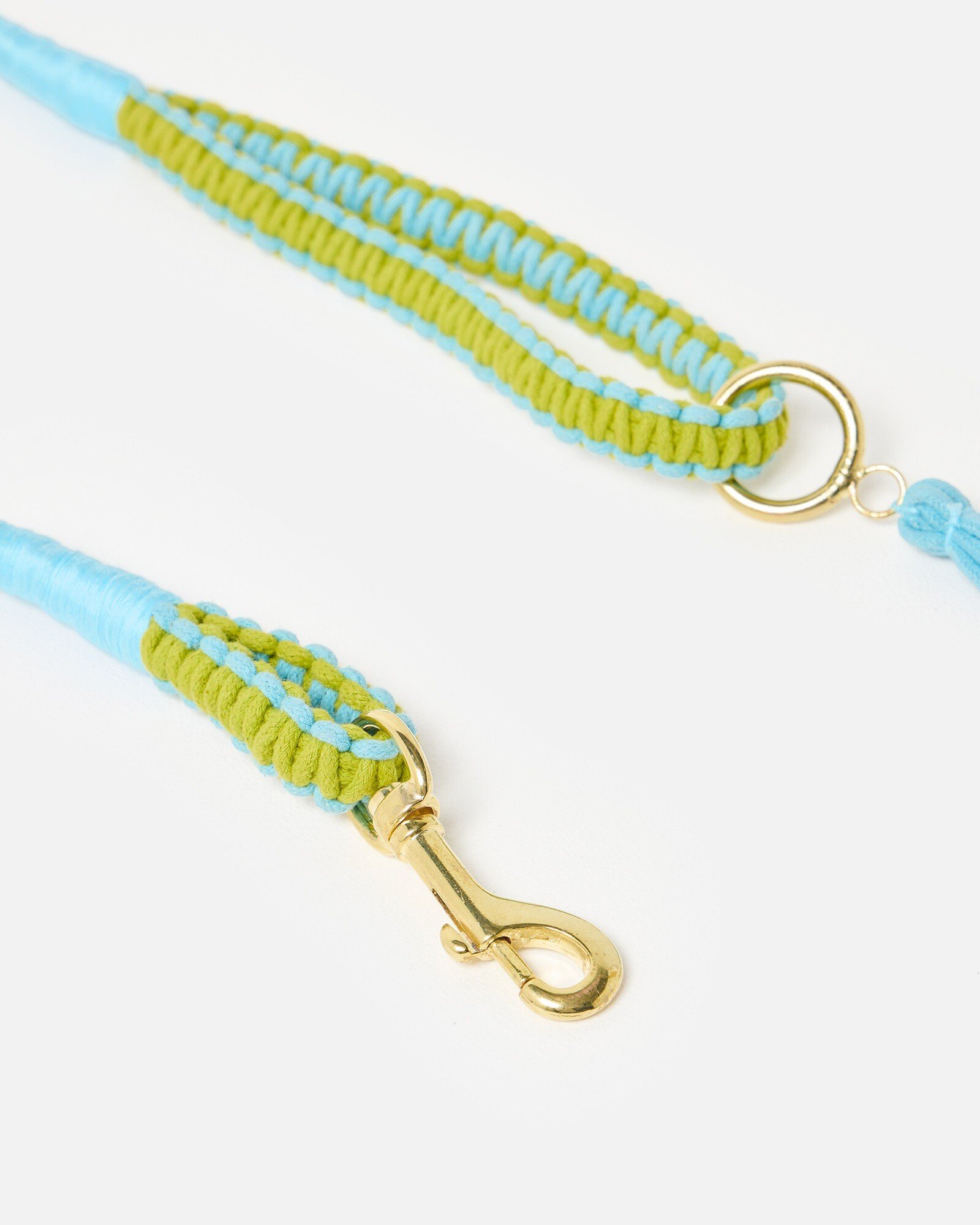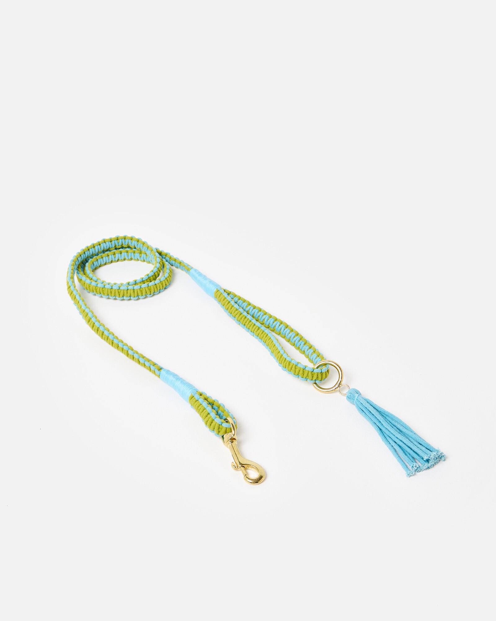 Handmade macramé dog lead made from a knotted green and blue rope, finished with a golden clasp, looped handle and light blue tassel detail. Single length only.