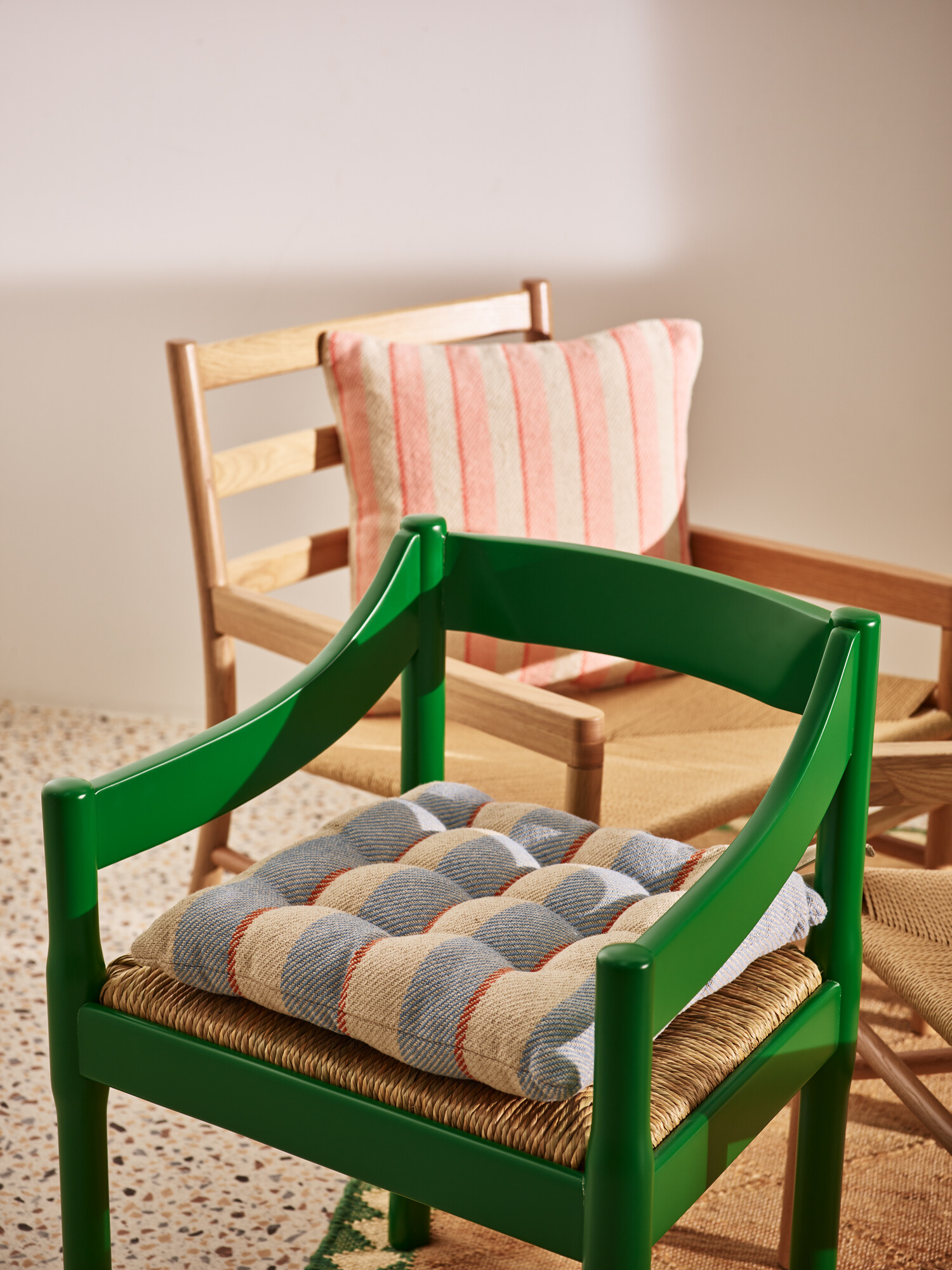 In a textural natural cotton fabric, this 40x40cm woven seat cushion features a blue, cream and orange stripe pattern with natural ribbon ties to secure to the back of a chair. Perfect for outdoor use on garden seating, or for added comfort on dining chairs. We recommend storing indoors when not in use to protect from the elements.