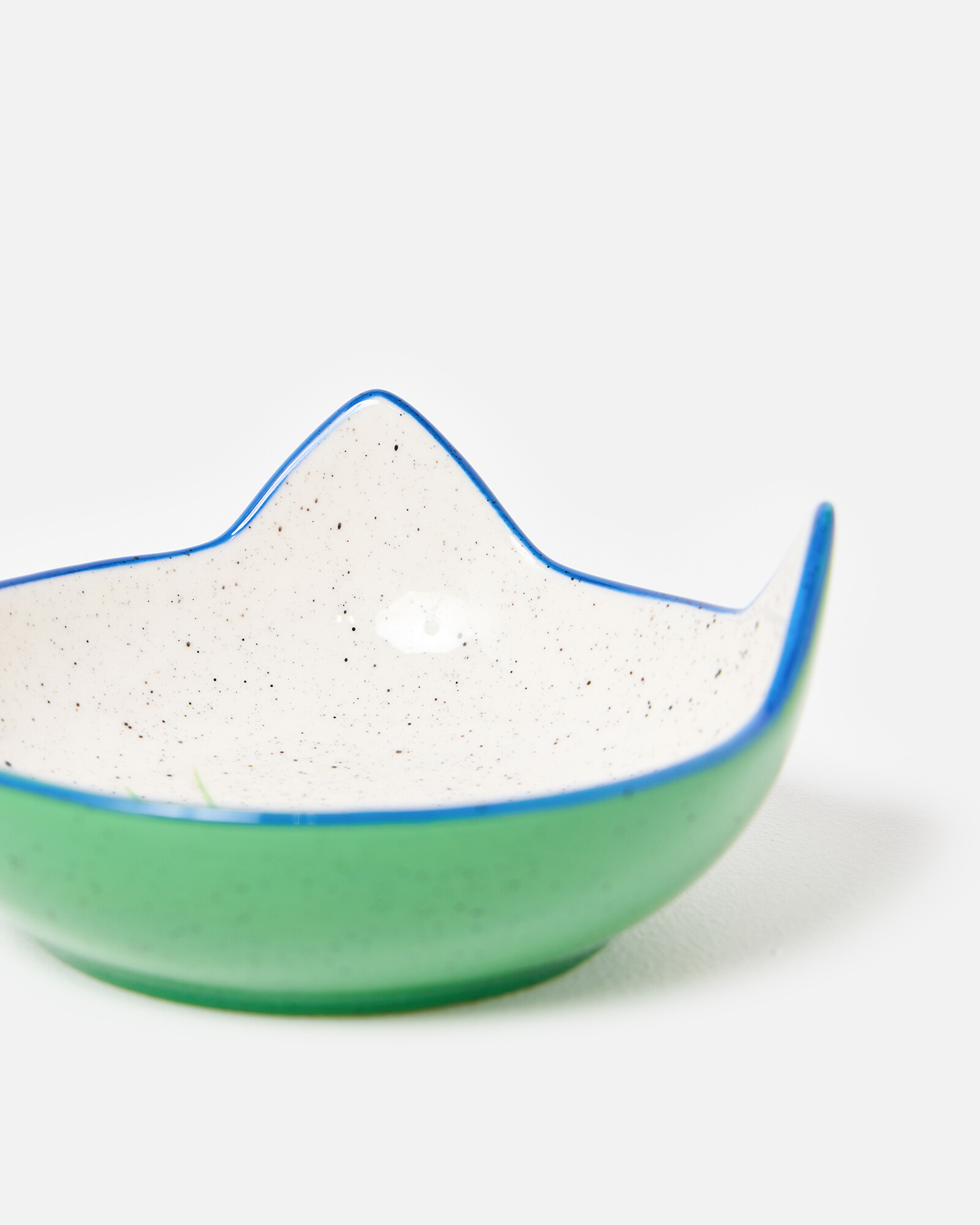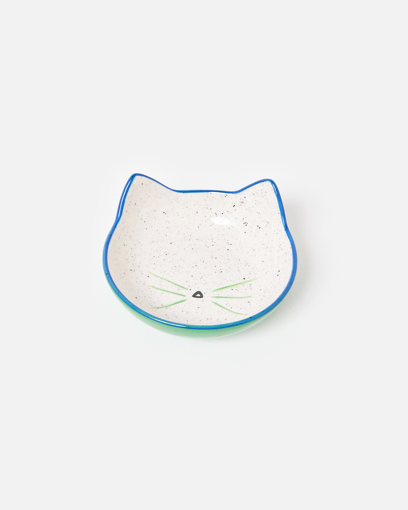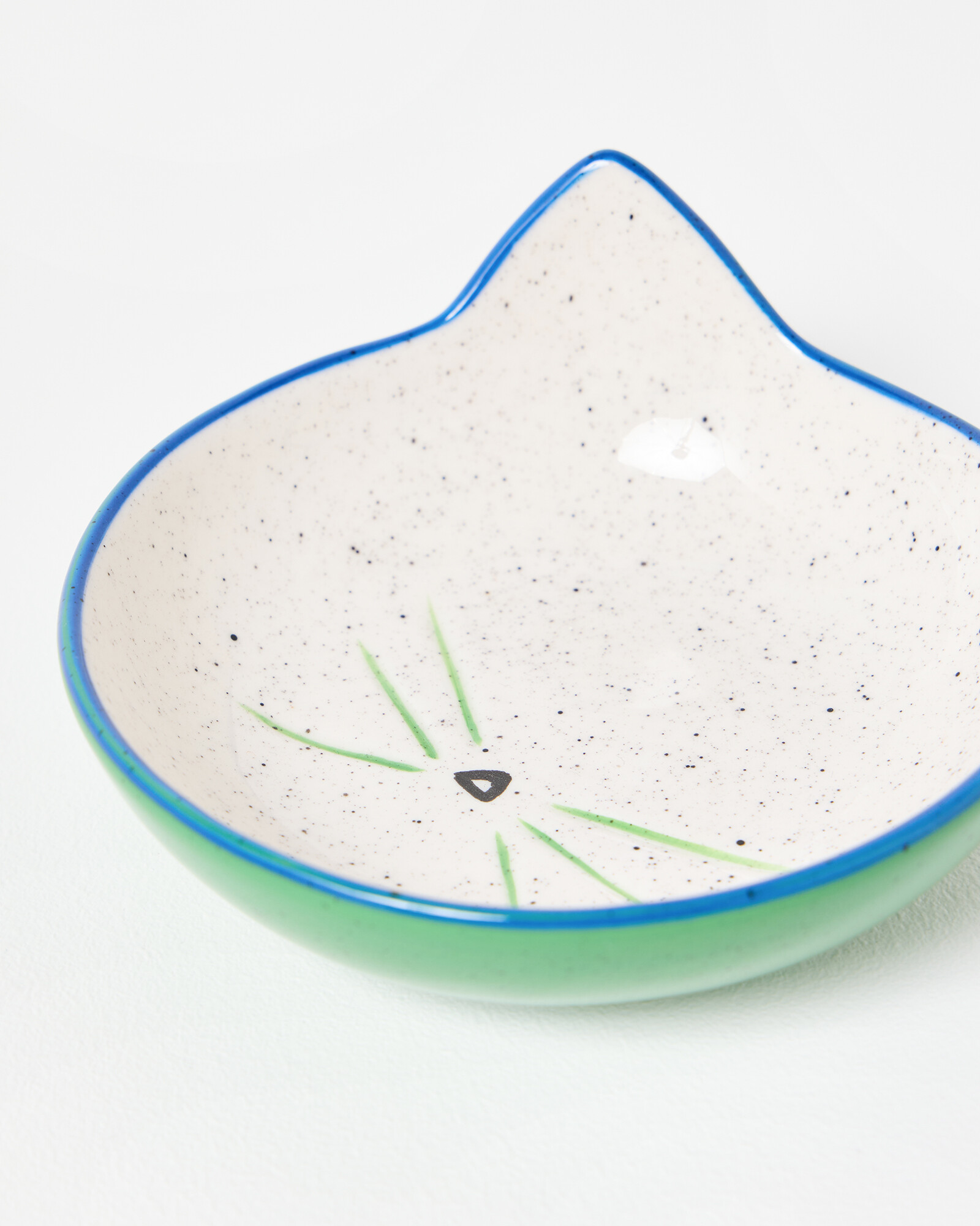 Small ceramic pet bowl in a cat-shaped profile, finished with a white, speckle glaze inside and a small nose and whiskers. With a contrasting blue rim and green outer, this playful pet bowl is perfect for cat lovers.