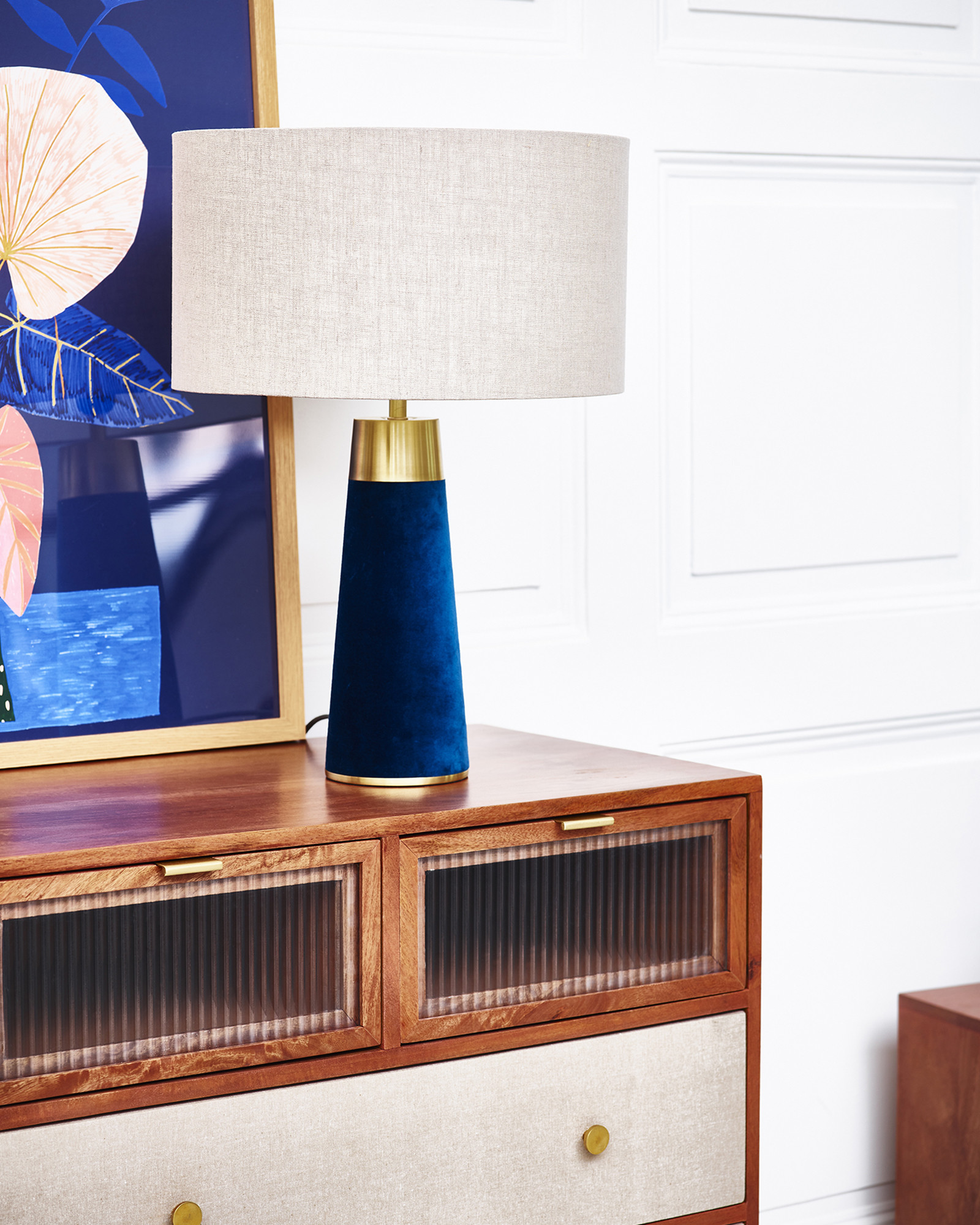 Give your lighting a tactile update with the sophisticated design of the Ero Blue Velvet Table Lamp. Designed in a round drum silhouette, this table lamp base is covered in a soft blue velvet and a contrasting cream shade for an opulent addition to your side table. With an E27 bulb holder, this table lamp is completed with high-impact polystyrene and a black rocker switch on a grey cotton-covered lead and luxe gold toned details. Please note, bulb is not included.