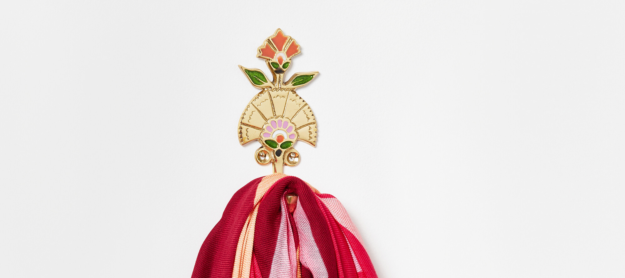 Colourful enamel details break up the gold metal of this floral wall hook, with engraved markings and hand-painted inlays.