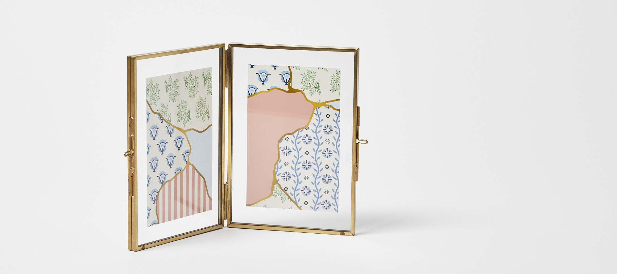 Mix your materials with our handcrafted antique-look, gold and glass double portrait frame with bespoke vintage-inspired geo print frame inserts. Ideal for displaying mementos or your favourite photos, mix and match this 6x4" duo with pieces from our Glass & Gold Range, and complete the look by styling with natural wood, washed out neons, mixed metallic and wool home accessories and furniture.