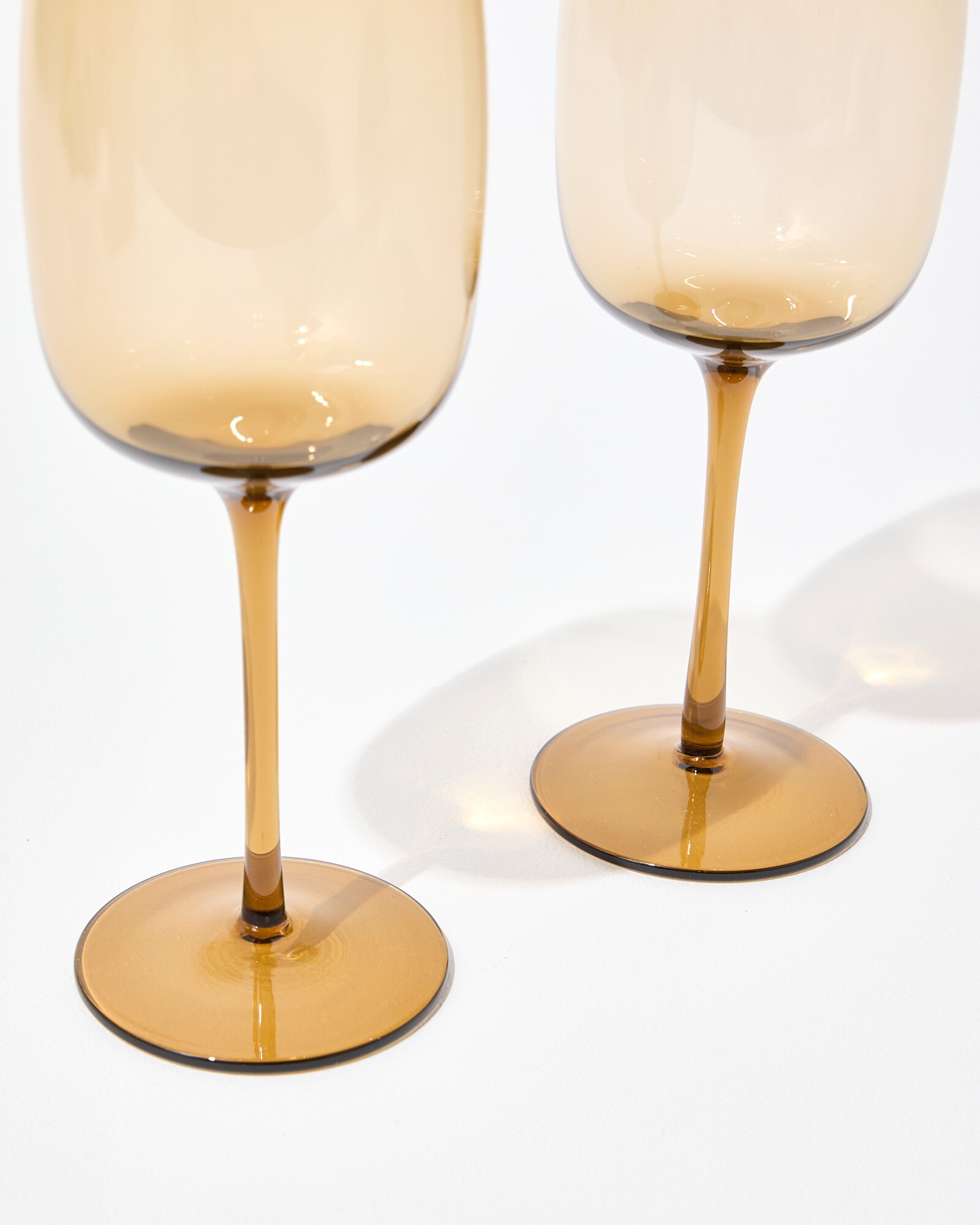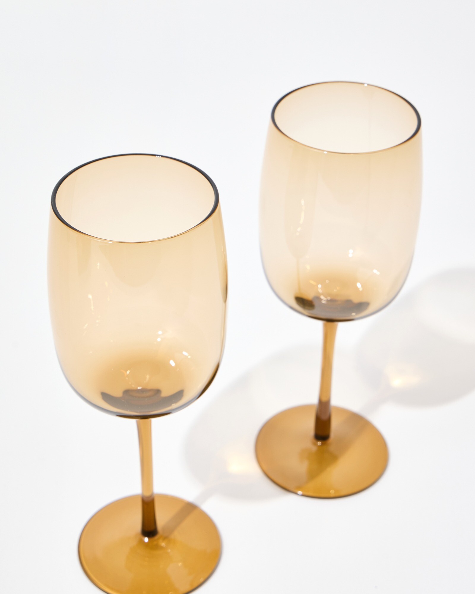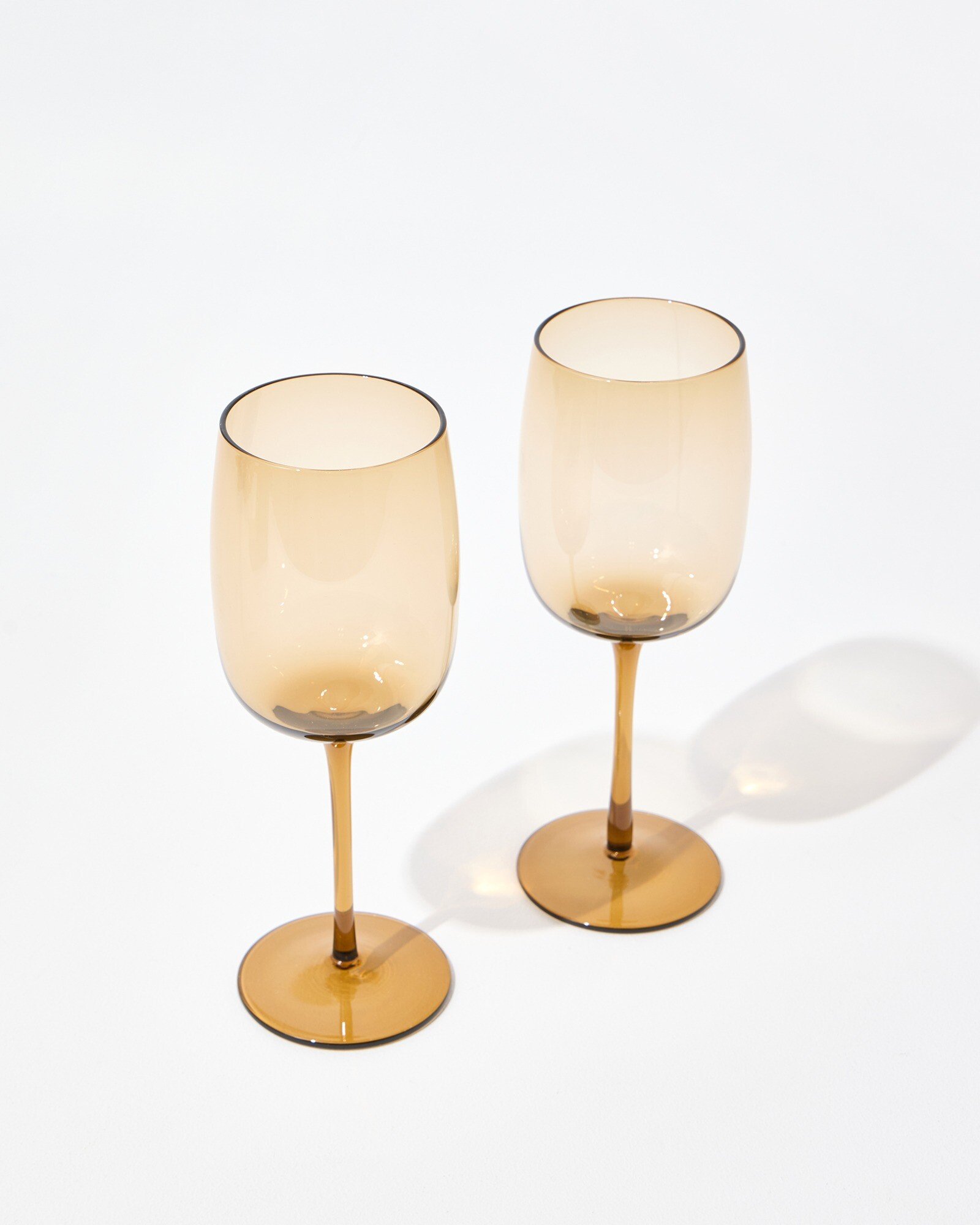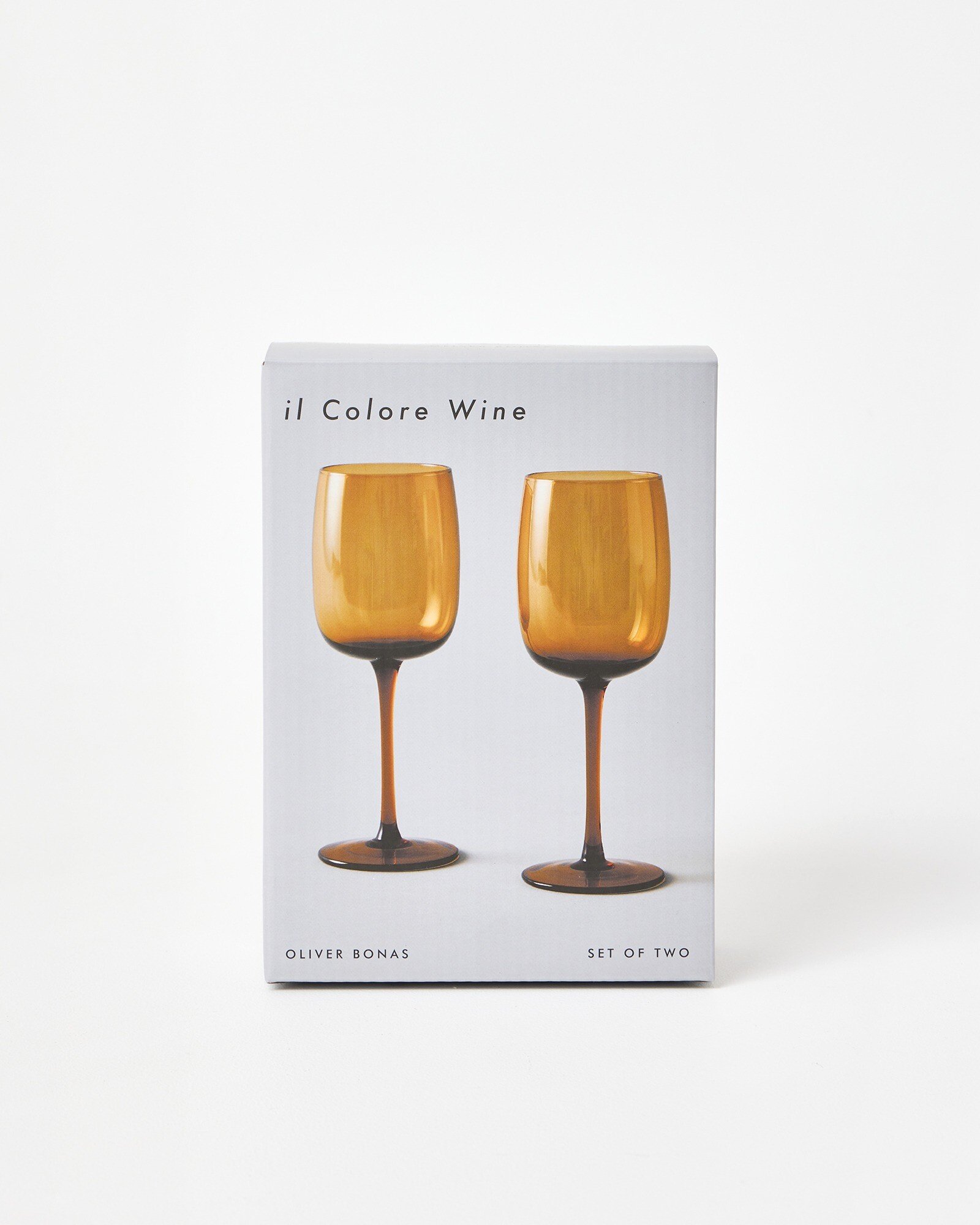 Set of two contemporary wine glasses in a smooth brown coloured glass, with soft curves, a large bowl and slim stem. Pair these elegant wine glasses with the il Colore Champagne and Cocktail Glasses for a cohesive table setting, ideal for summer parties and hosting for a special occasion. Arriving in a custom gift box, they make a considered celebratory gift, whether for a new job, new home or as a special thank you.