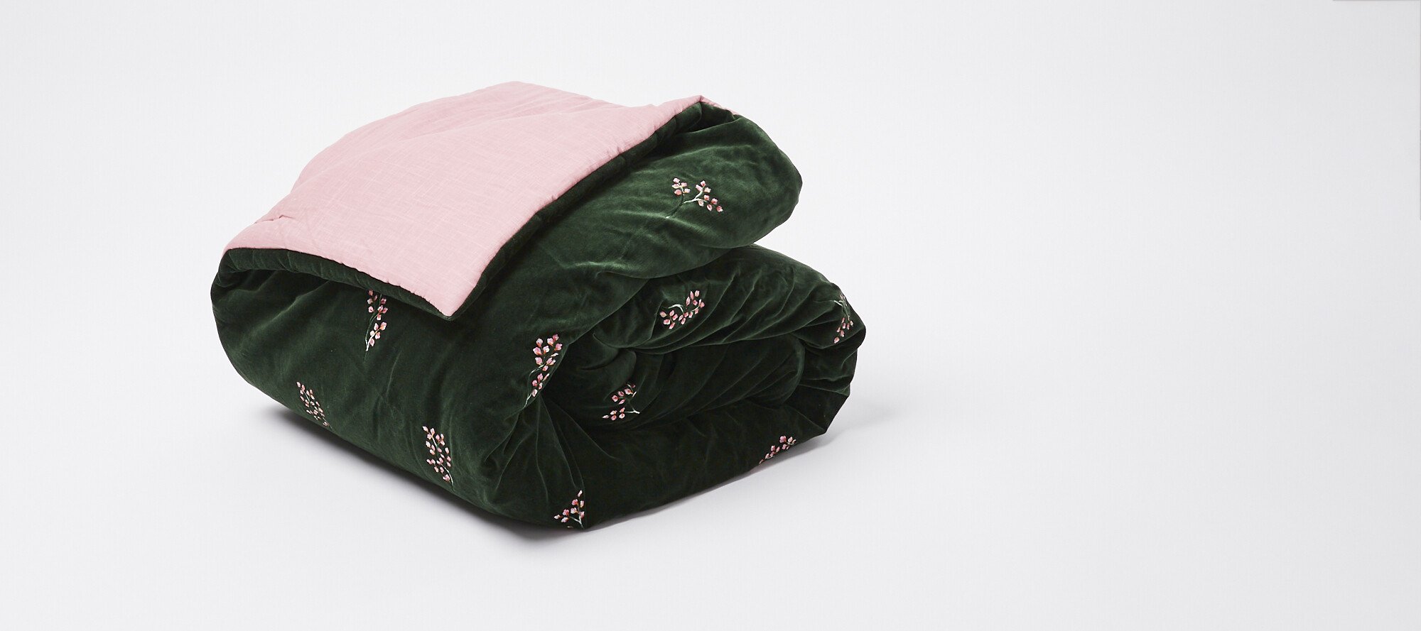 Add a tactile touch to your bedding with the Issey Embroidered Bedspread. This double-sided quilt pairs an embroidered flower print on a deep green fabric with a rose pink back.