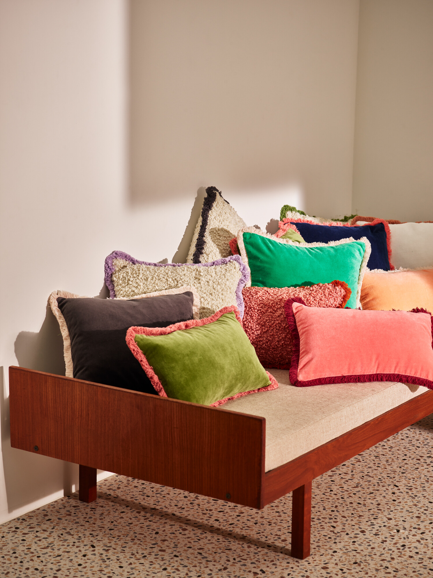 Add tactility to your home with the Issey Rectangular Cushion Cover in soft pink velvet with red fringing. Add a separate cushion inner to complete the look.
