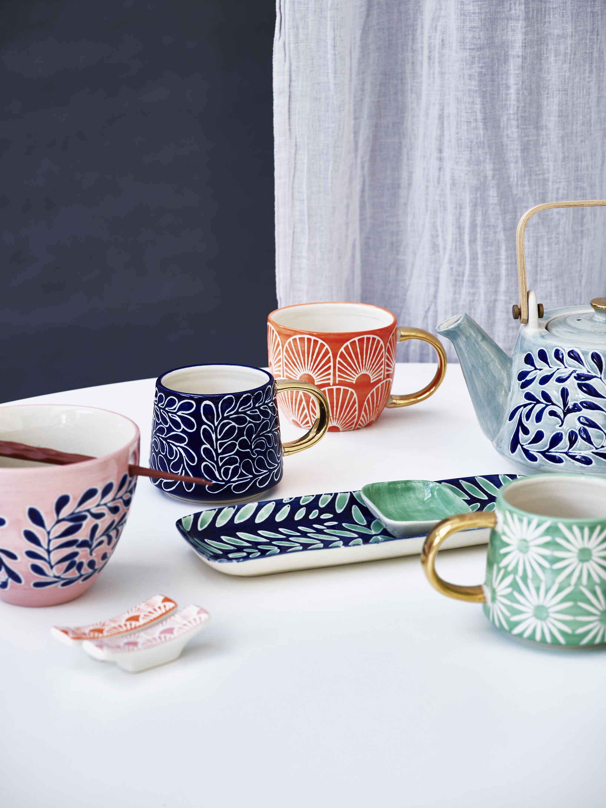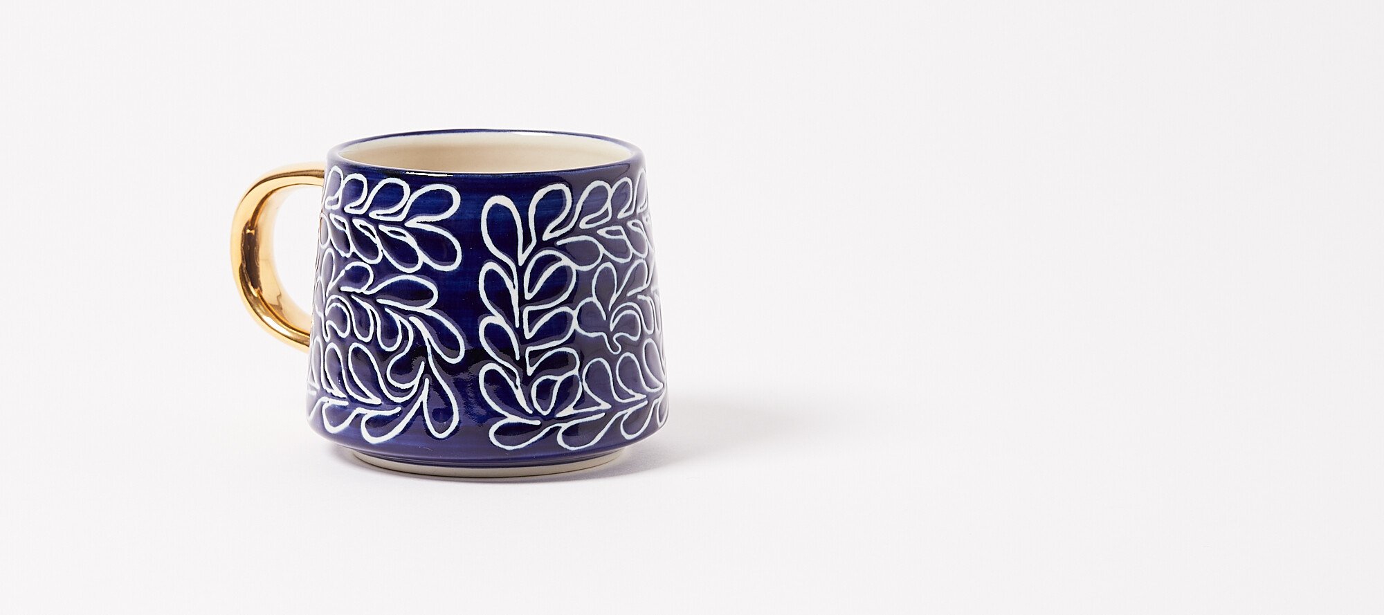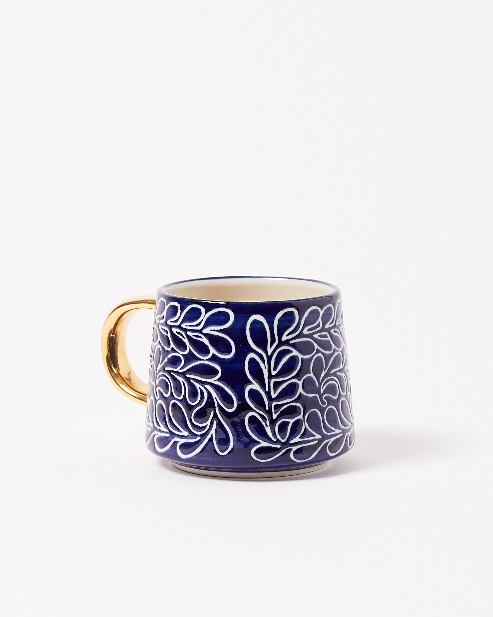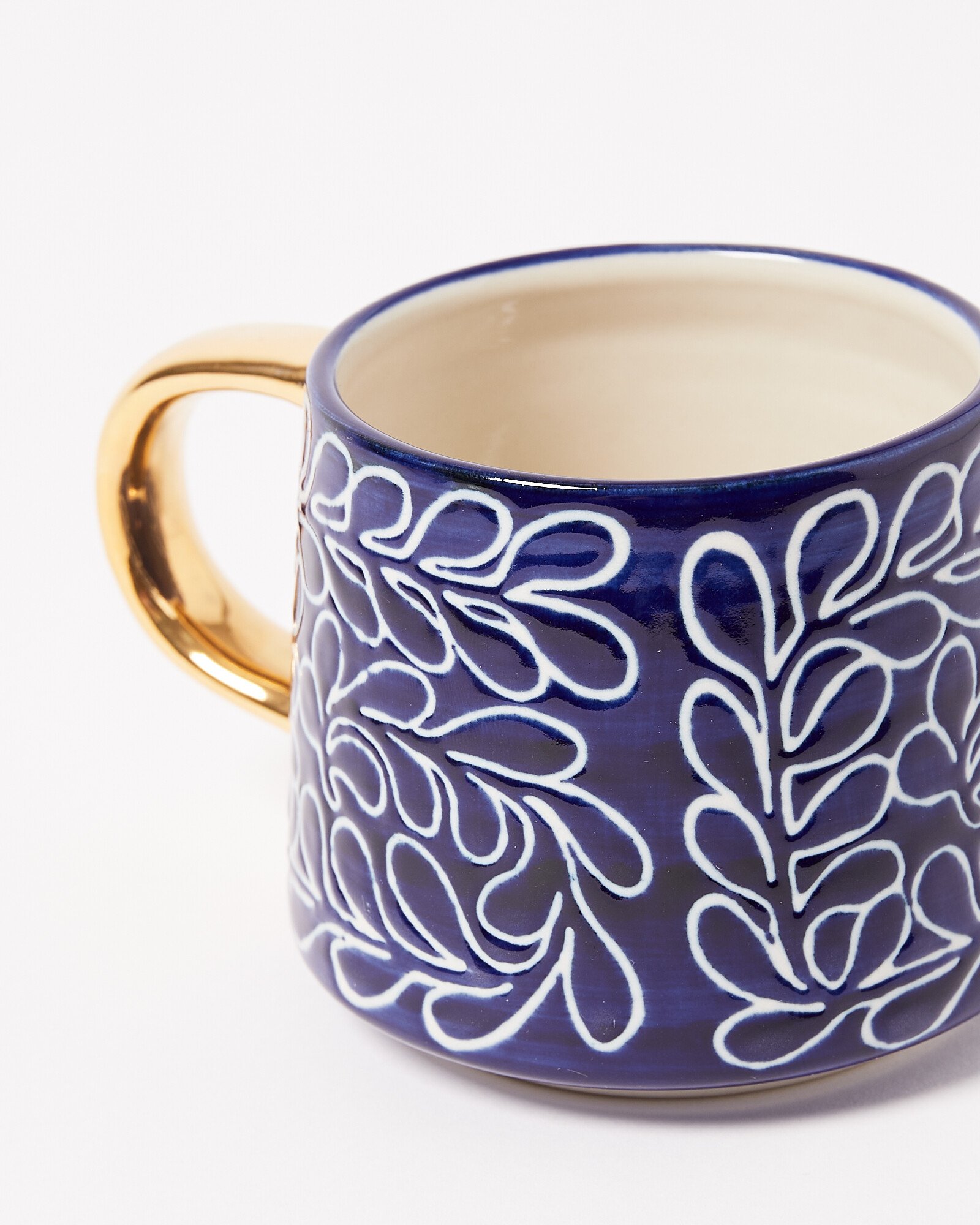 Sip your afternoon tea from this deep blue mug, decorated with a leaf-inspired pattern and finished with a sleek gold toned handle.