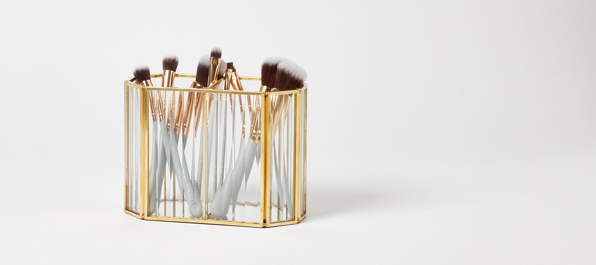 Keep your storage solutions chic with the Loire Gold & Glass Hexagon Brush Pot. In an octagonal silhouette, this two-part brush pot features ribbed glass panels, framed with gold metal edging for a stylish addition to your dressing table.