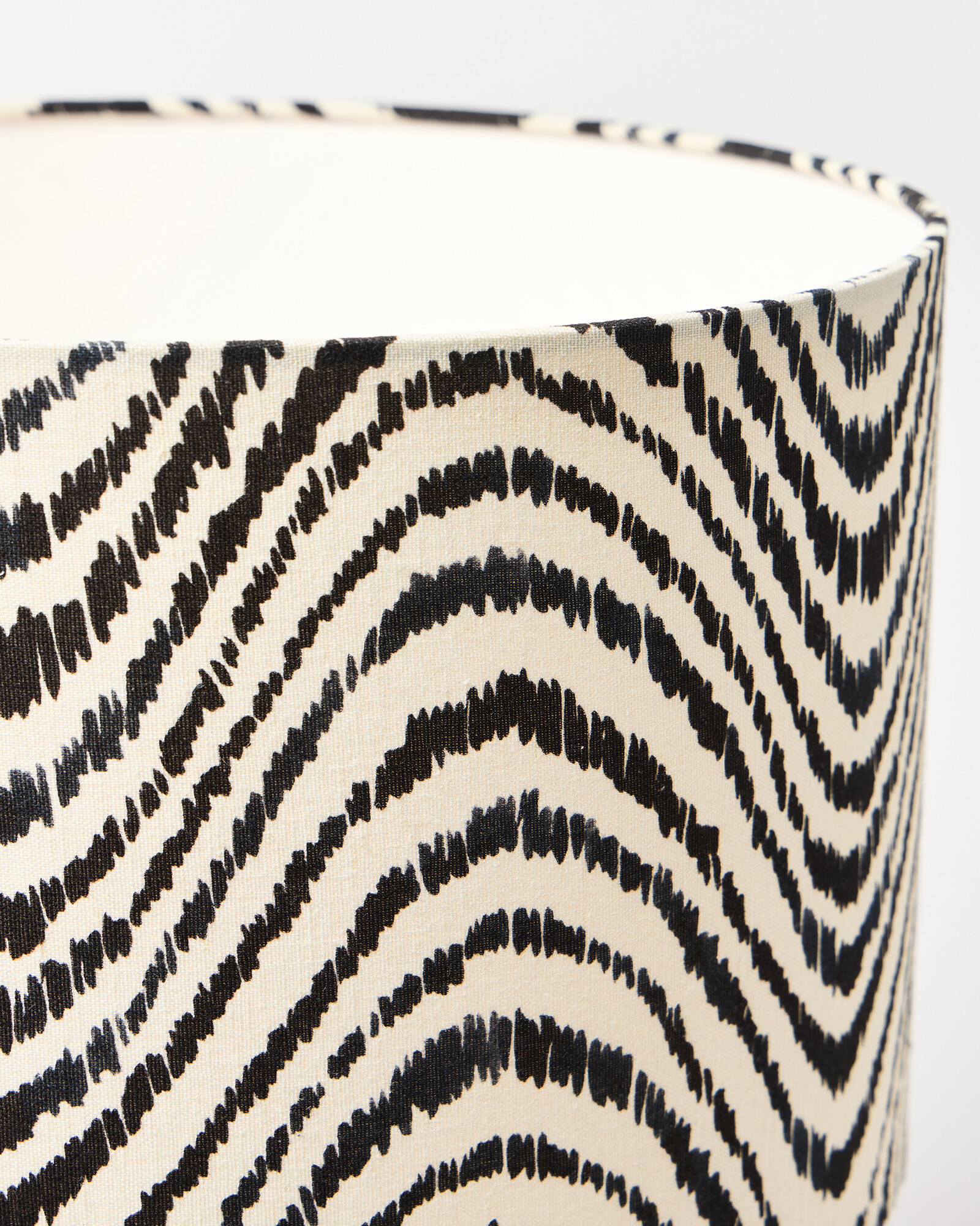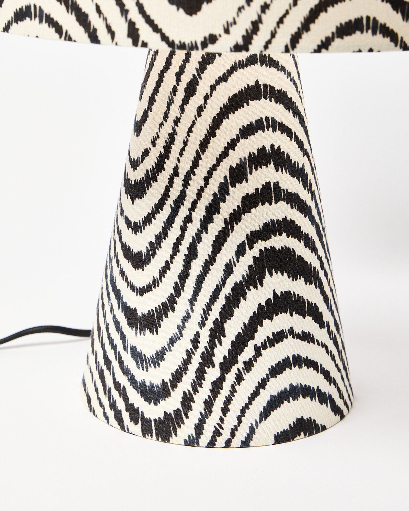 Fabric table lamp printed with a wavy pattern designed in the OB creative studios. Adapting the prints digitally gives them a fresh monochrome colour palette, complemented by the structural shape and cotton-covered cord.