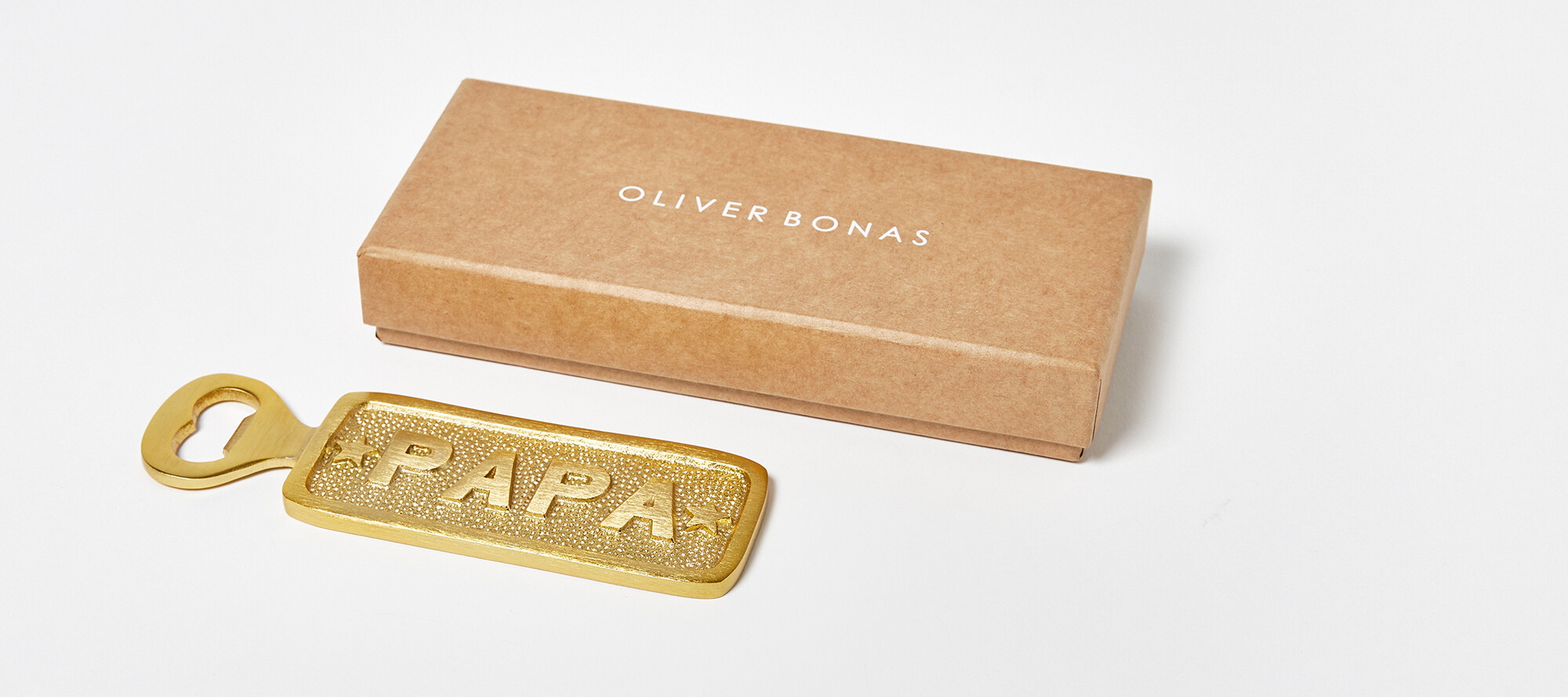 In an understated gift box, this golden bottle opener has an engraved surface and star motifs.