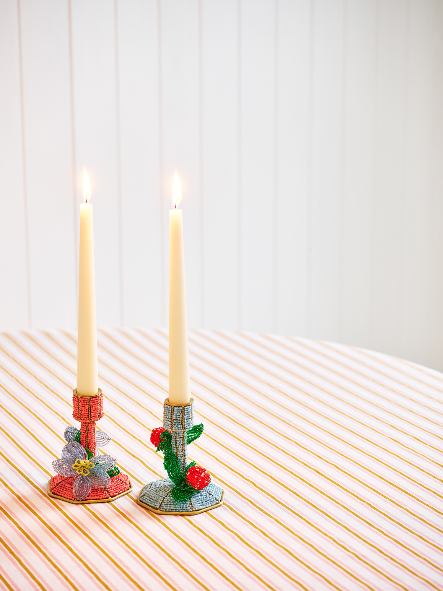 In a beautifully detailed design, this candle holder features strawberry and leaf details created from intricate beading, complete with golden metalware.