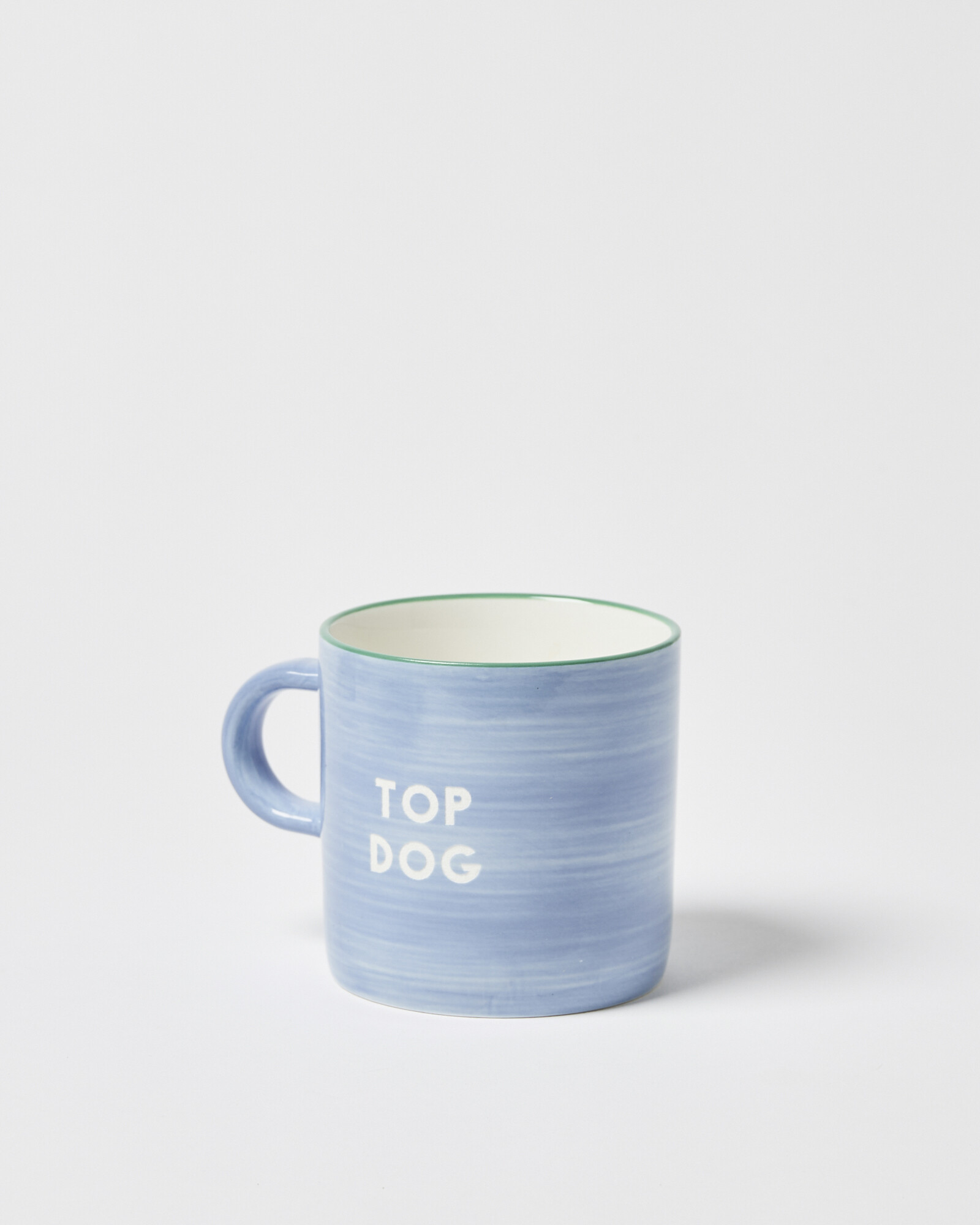 Top dog mug with a blue hand painted surface, green trim and sandblasted text.