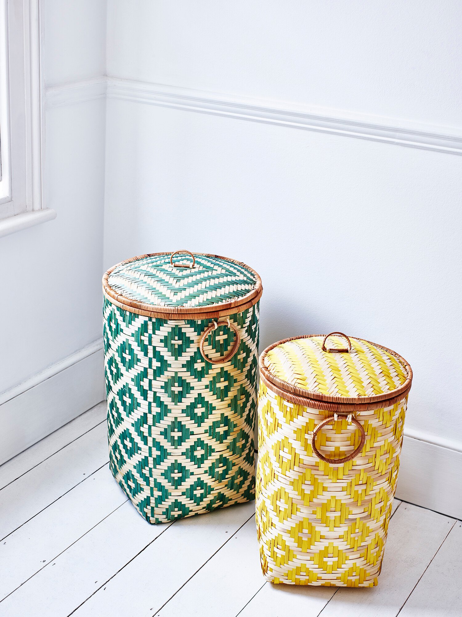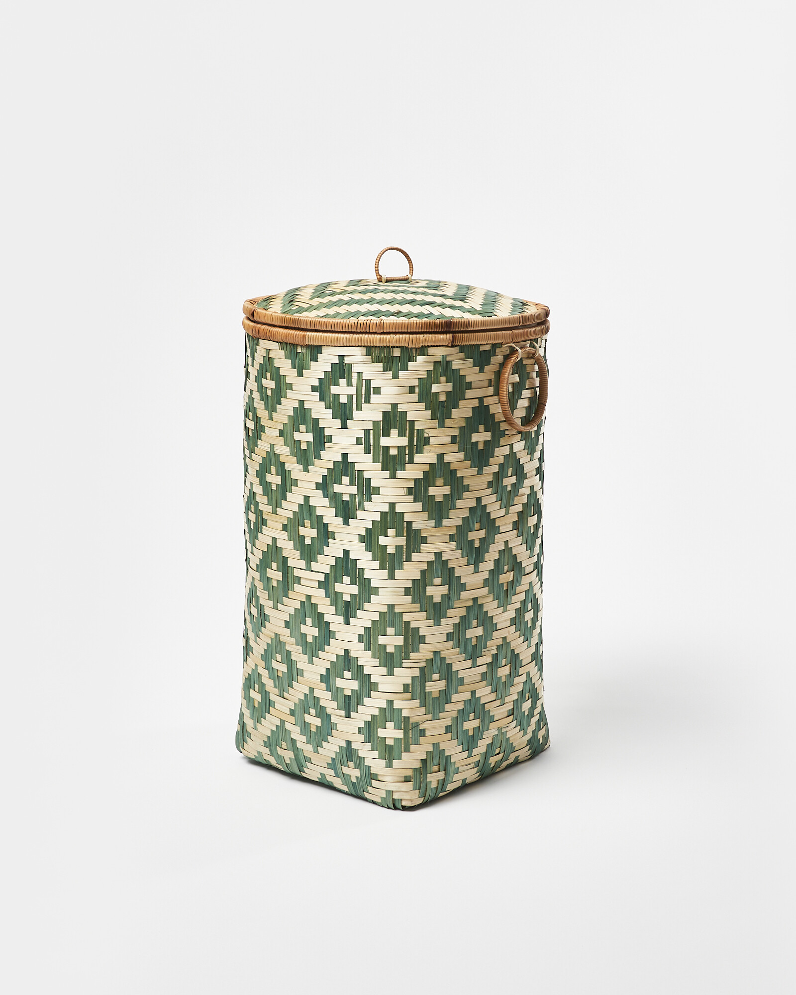 The Woven Green Bamboo Round Laundry Basket is woven from natural bamboo into a rounded shape. This style combines natural-toned bamboo with a diamond green pattern that wraps around the body of the basket, and is finished with two round handles and a lid.