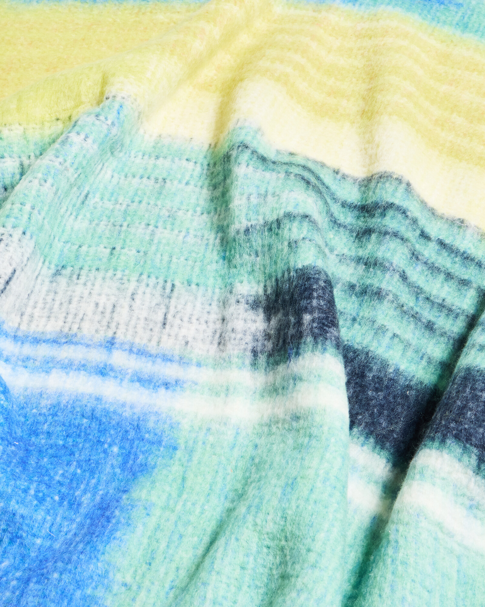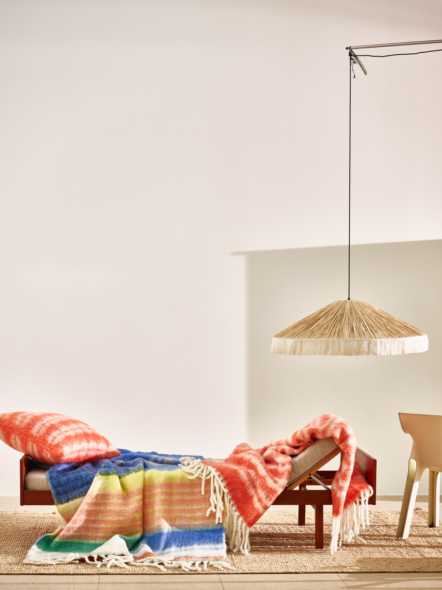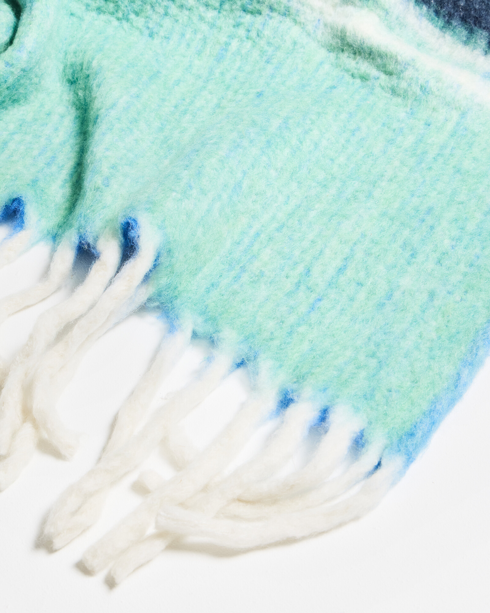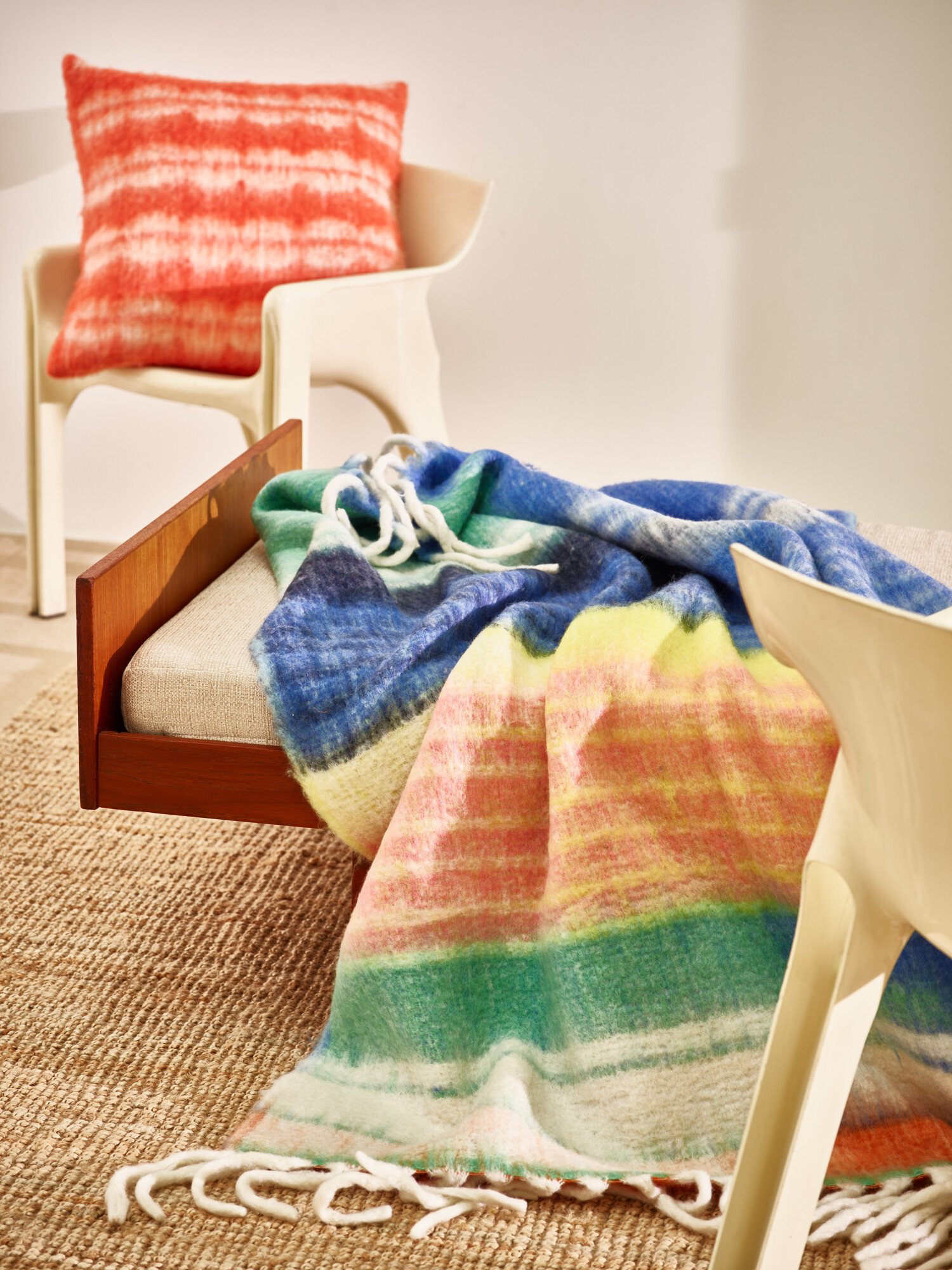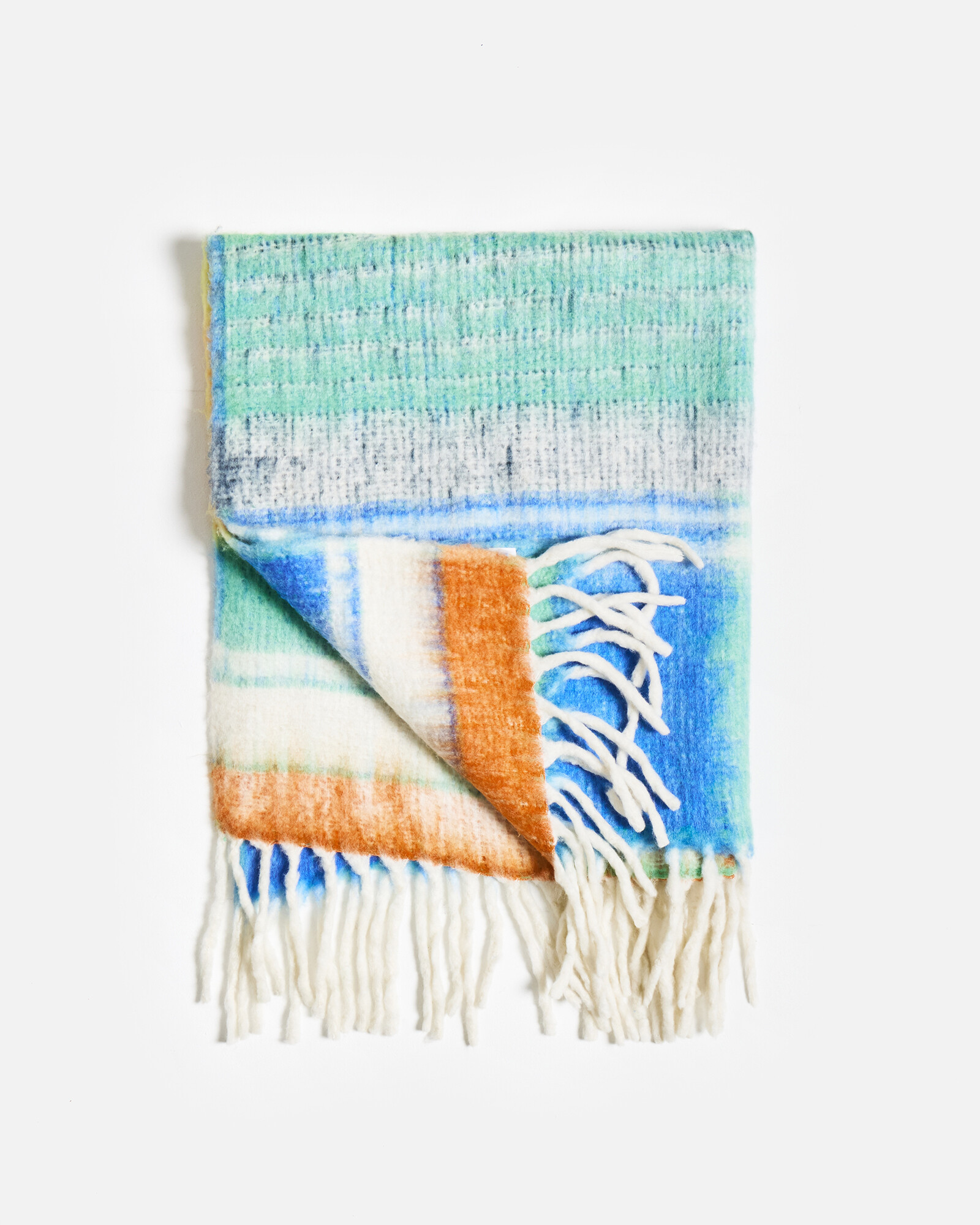 Multicoloured striped throw in a soft woven fabric, with long white tassels at each end. Features blue, yellow, green and orange hues, with stripes that vary in both width and length to create an artisanal feel.