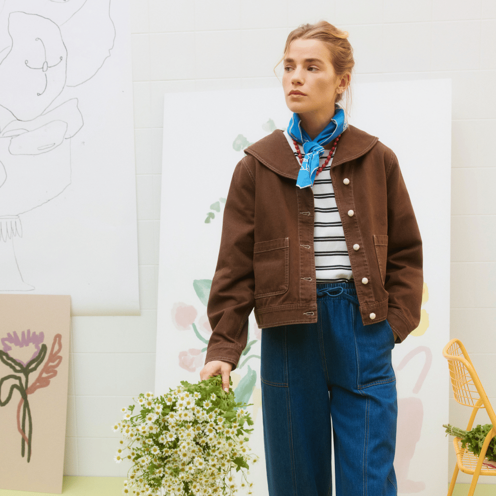 We loved styling this chocolate-brown jacket for our spring campaign shoot,’ says Lynda. 'The sailor collar gives it a more elevated feel to its traditional predecessor, subtly working in this season’s nautical nod. Pair with accessories in a similar colour palette for a sophisticated tonal look, adding a casually knotted triangle scarf for extra style points.’
