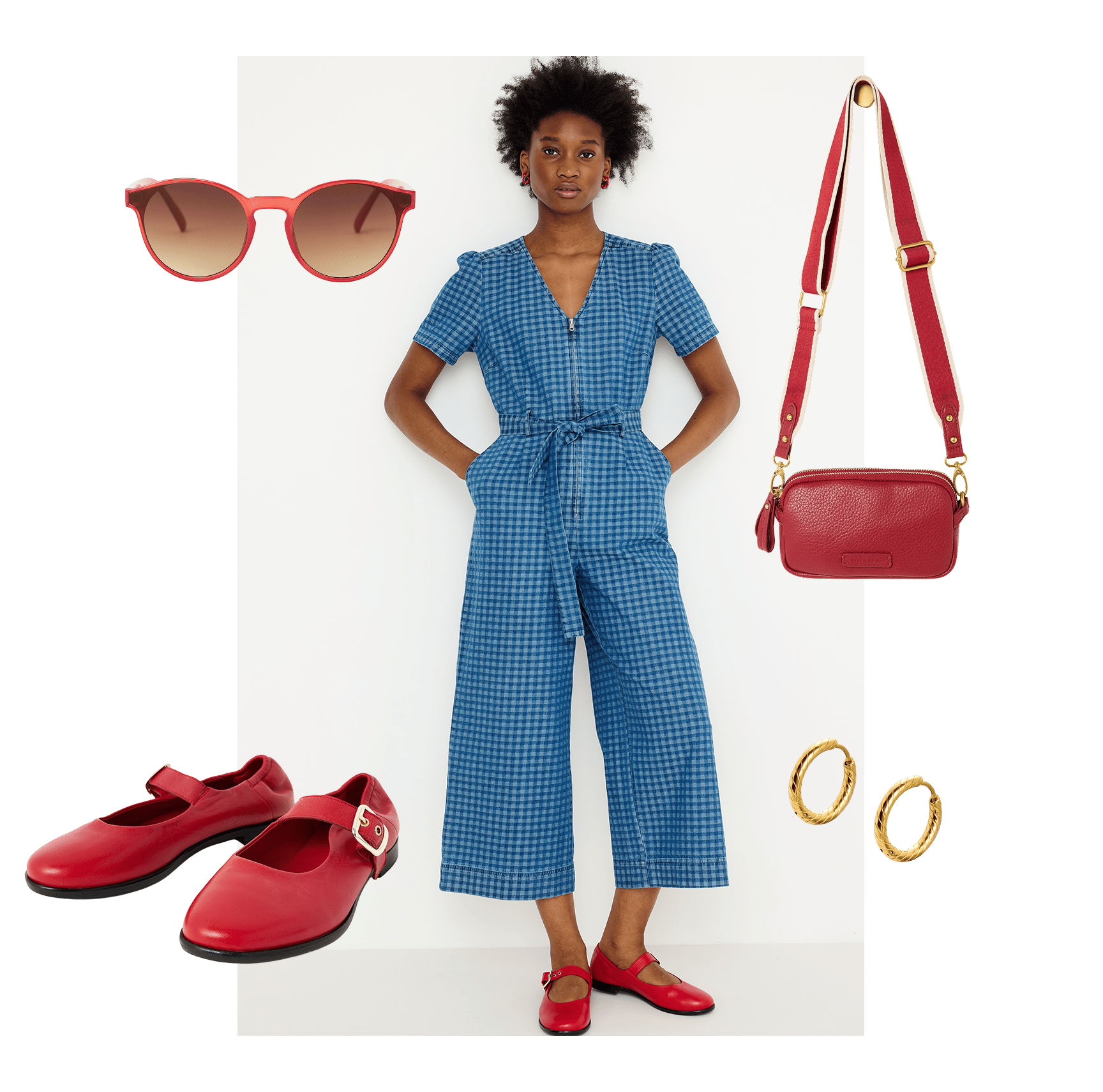 We all know how versatile jumpsuits can be, offering a one-and-done outfit alternative to your trusty jeans-and-top combo. ‘The great thing about a jumpsuit is how accessories can totally change the look depending on the occasion,’ says OB Fashion Stylist Lynda Spence. ‘Go casual with trainers or pumps for springtime, take it out for drinks with a heel or toughen it up with a chunky boot while the weather is still warming up.’ Finish with a bright red bag and pumps for a colour-pop finish.