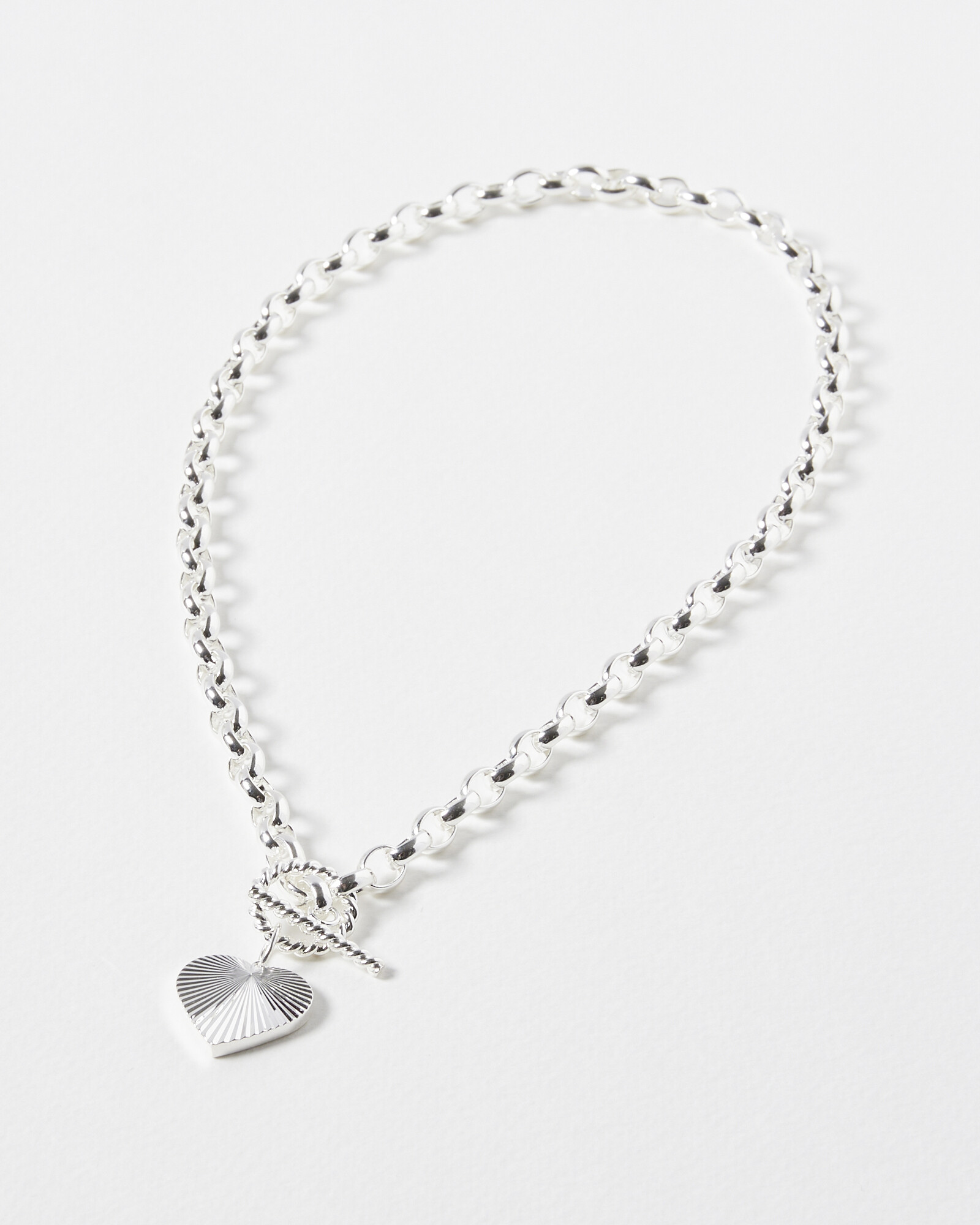 With a chunky chain profile, this silver plated pendant necklace features an engraved heart charm and twisted bar detail for a statement addition to your neckline.