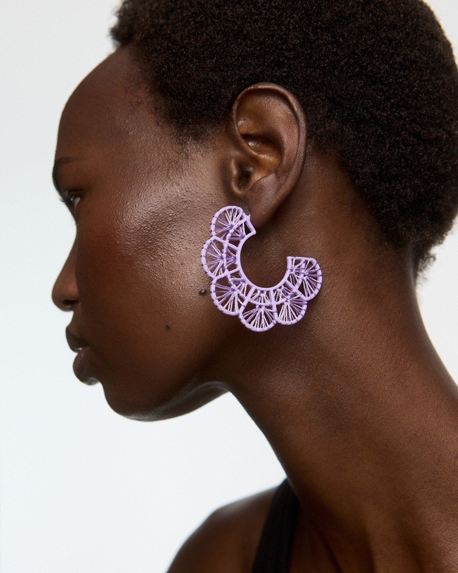 Large hoop earrings in a wide, scalloped profile interwoven with purple thread for a textural, lace effect. With a butterfly back for easy wear, these versatile purple hoop earrings can be worn year-round with holiday looks and party outfits for stand out styling.