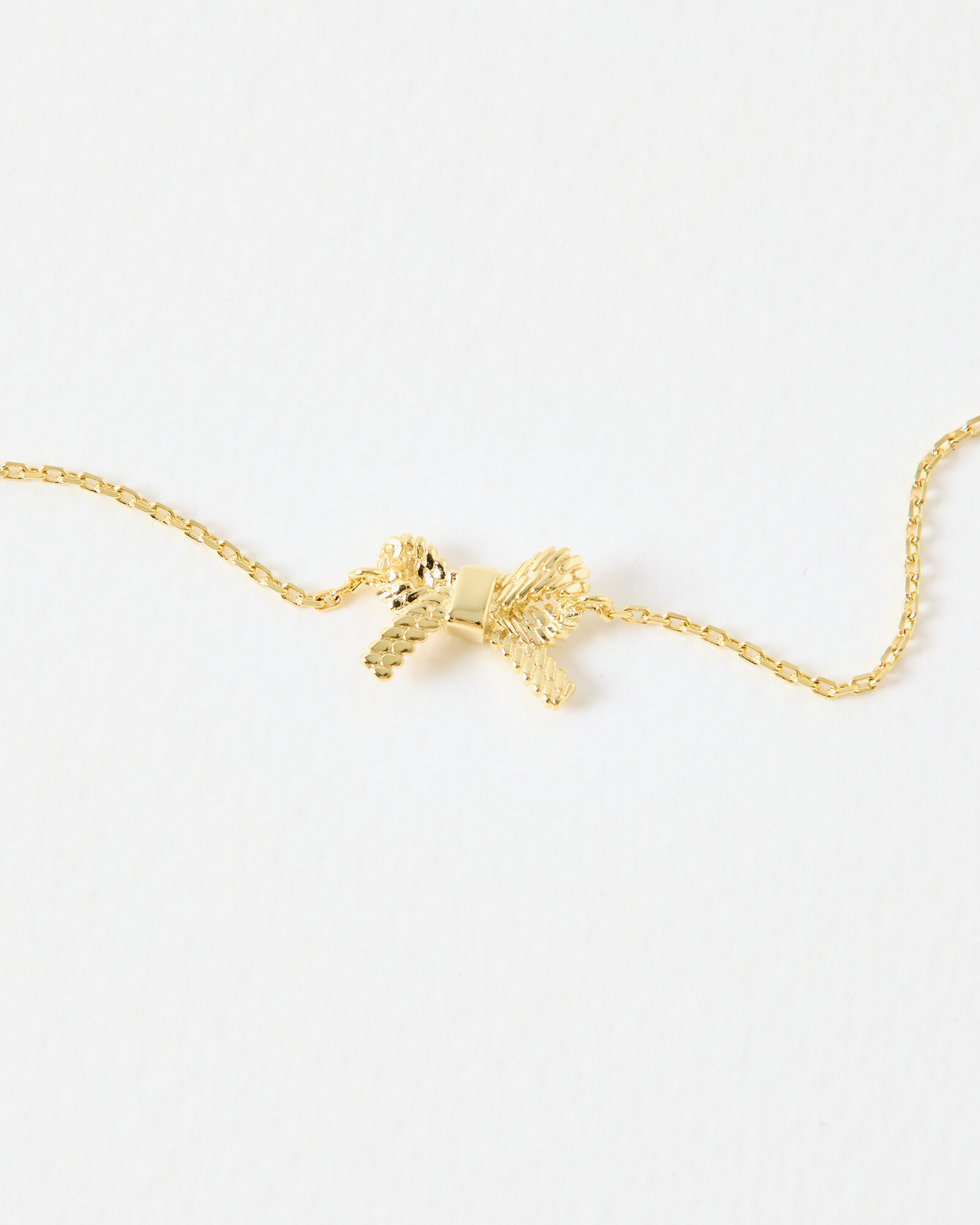 Gold plated chain bracelet with a fine rolo chain, and bow shaped charm with a rope texture finish. Style with the matching Bria Bow Stud Earrings and Bria Bow Necklace to complete the set.