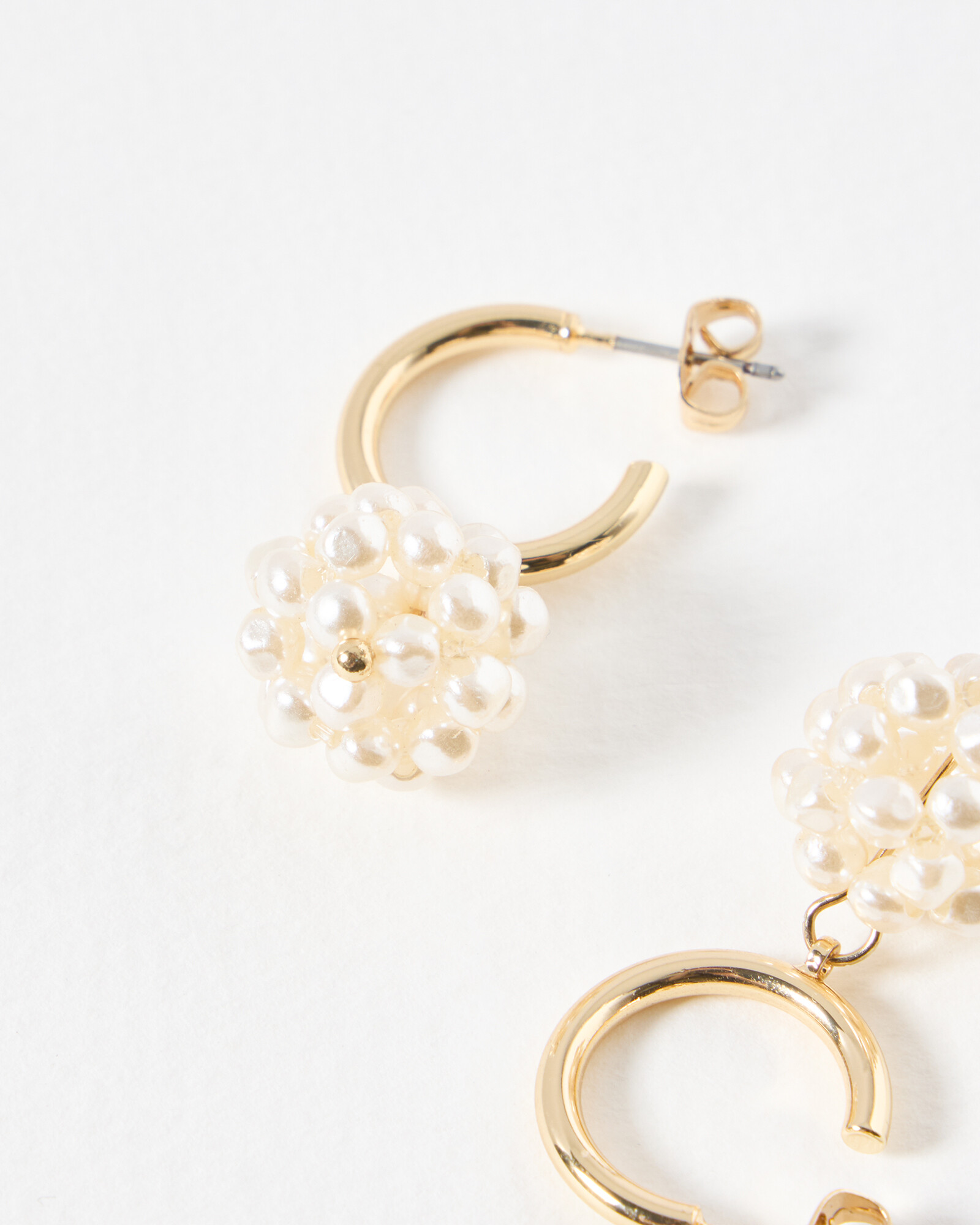 Classic shaped huggie hoop earrings in a gold toned metal, with butterfly backs and a large faux-pearl cluster drop charm.