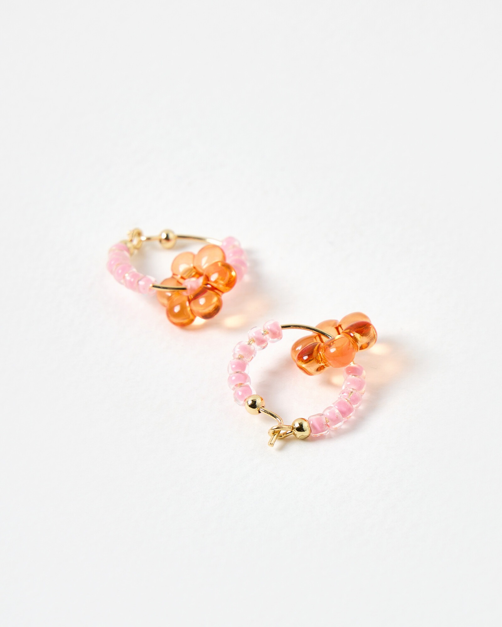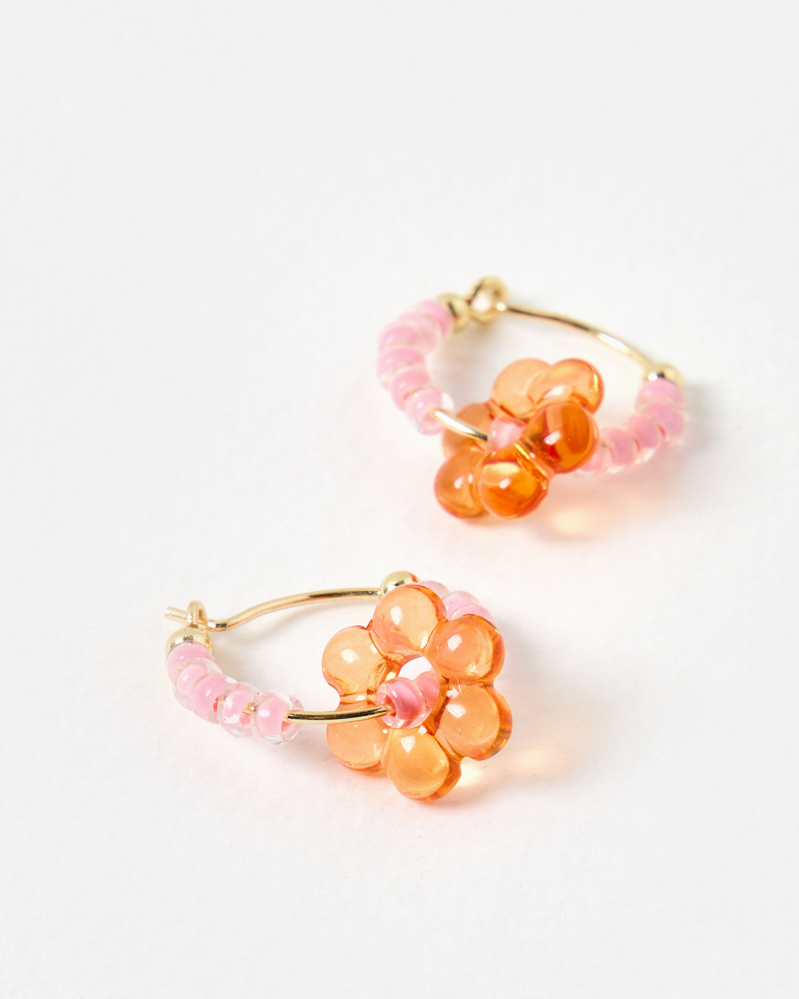 Beaded hoop earrings made from a gold toned wire threaded with semi-opaque pink beads, and a large orange flower detail. Finished with a loop and hook closure, style these orange flower earrings with a matching necklace and accessories to tie into your summer holiday outfits with a playful pop.