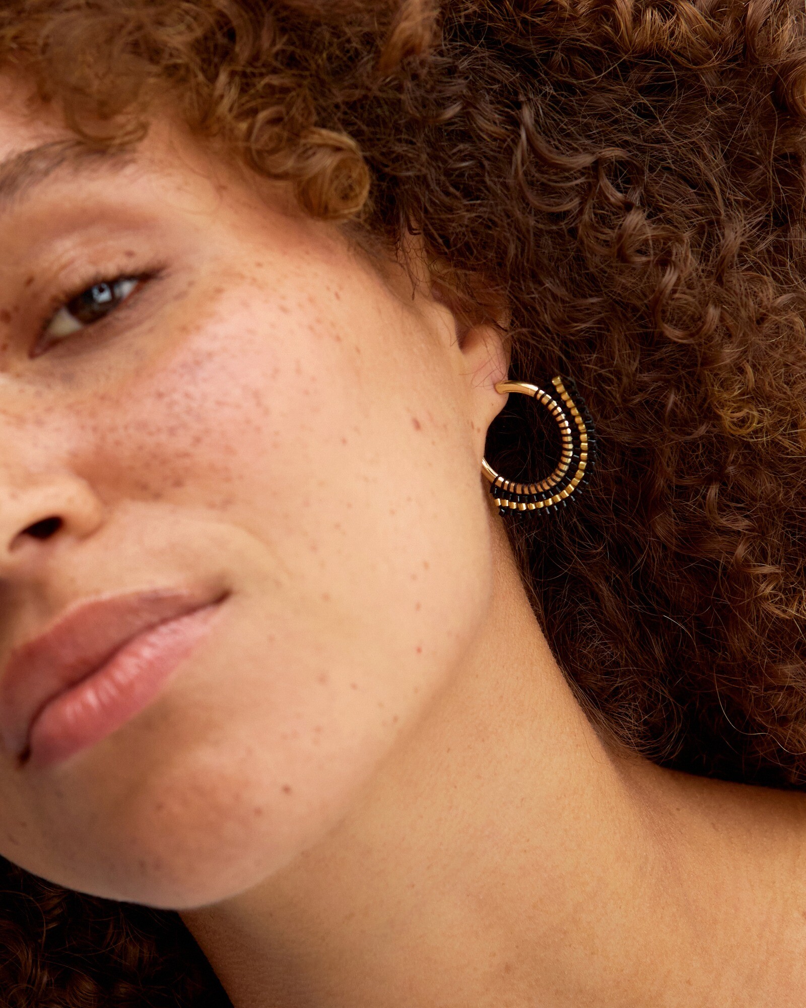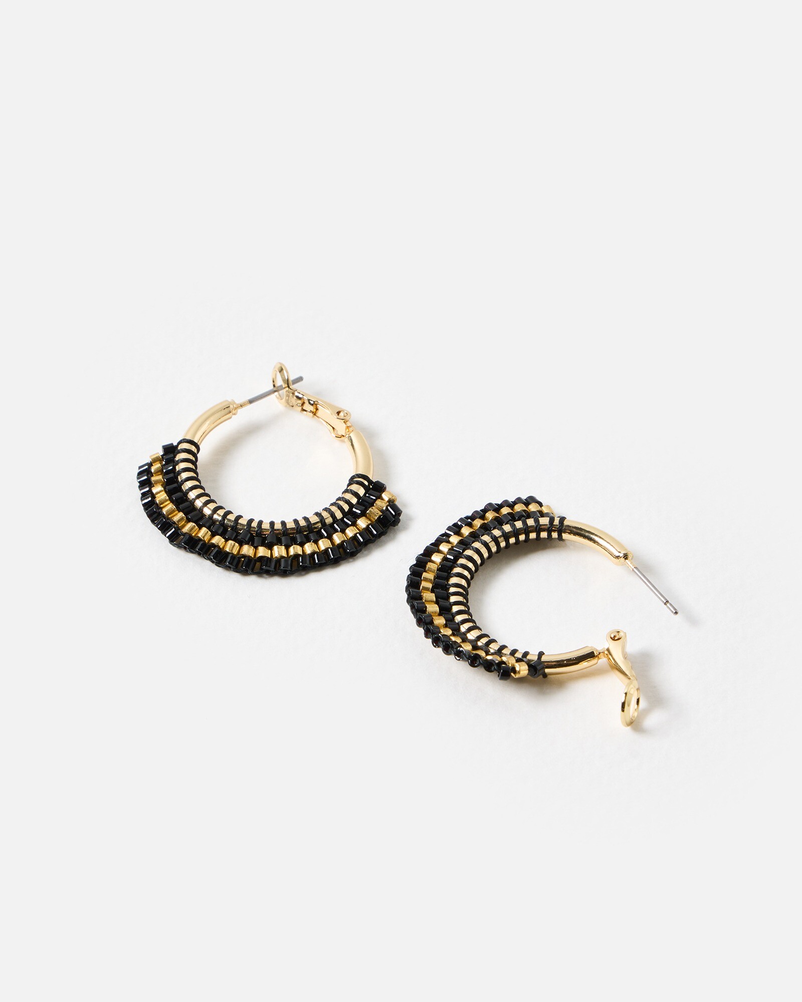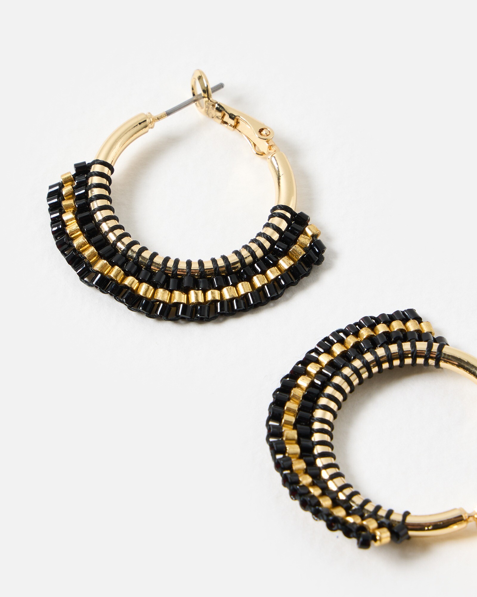 Large beaded hoop earrings in a gold tone metal, featuring black and gold bead details along the curve of the hoop for a textural finish. With a clicker closure and shiny surface, style these gold hoop earrings with evening outfits and holiday looks for a touch of colour and elegance.