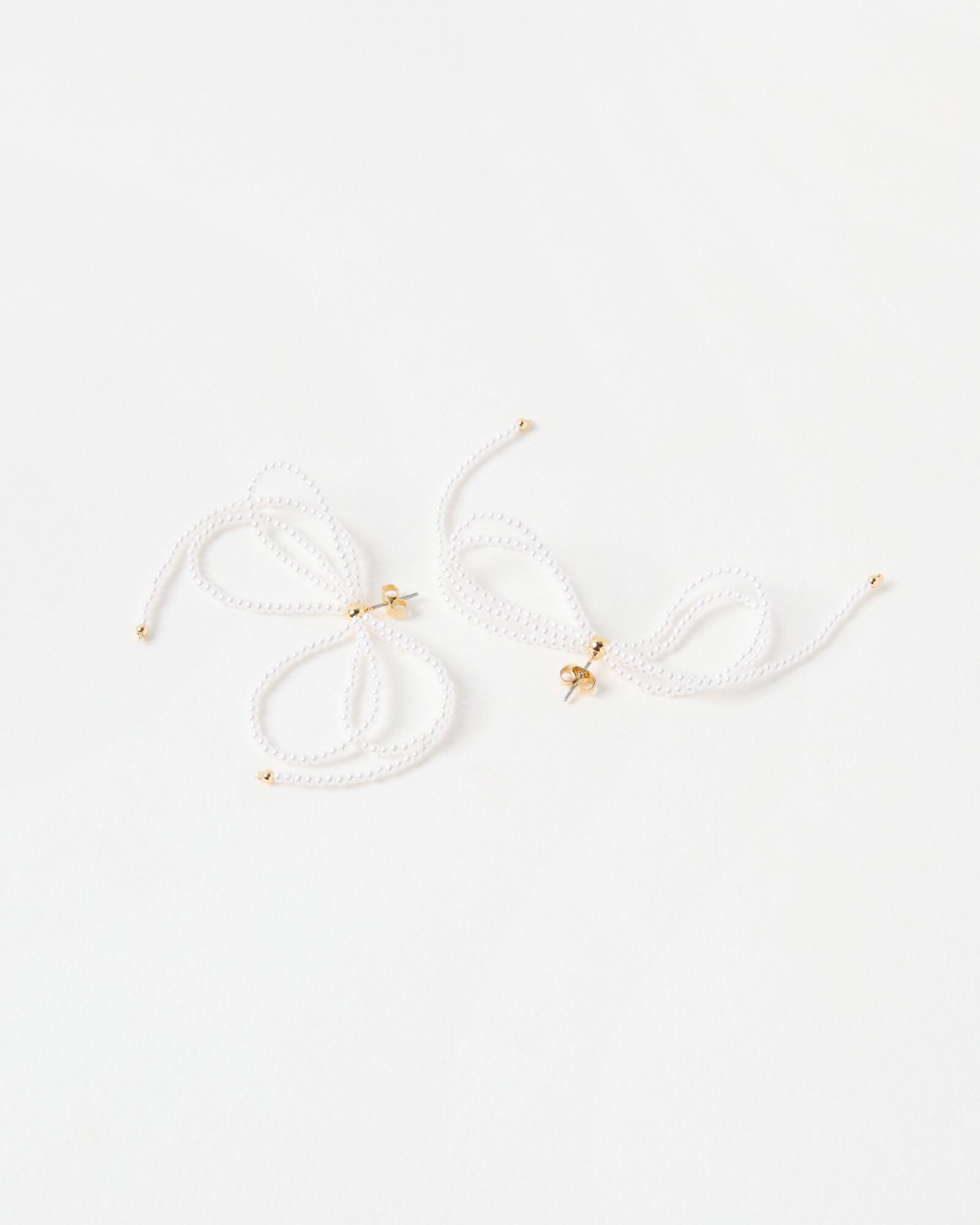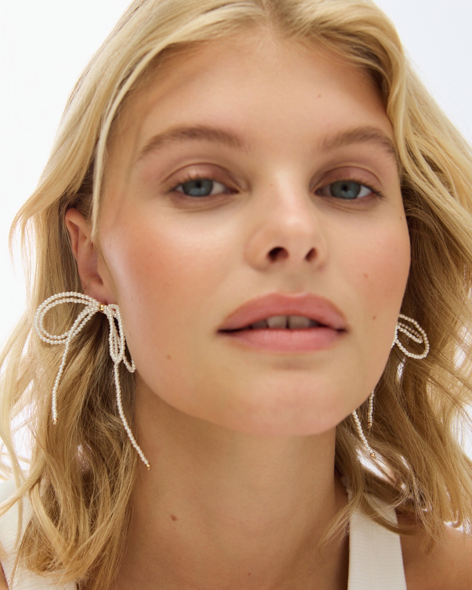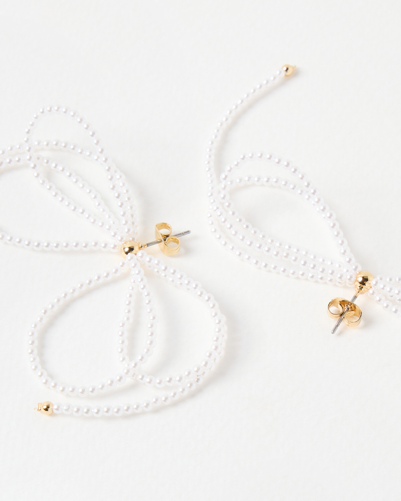 Large bow earrings formed with strands of faux-pearls secured to a butterfly back by a central, gold toned bead. Style alongside a matching bow necklace and accessories for a stylish wedding guest and summer event-ready look.