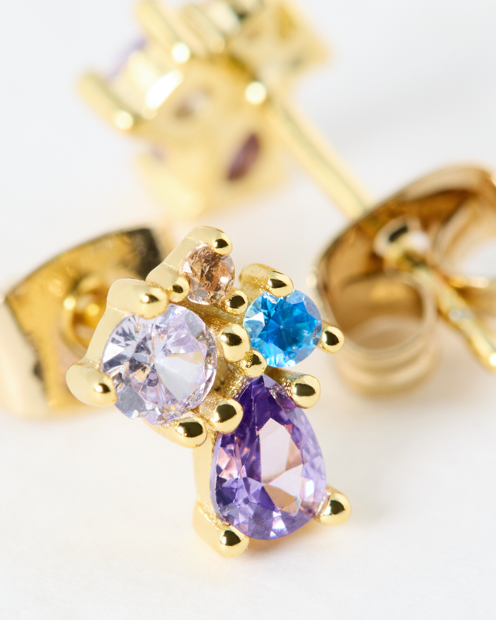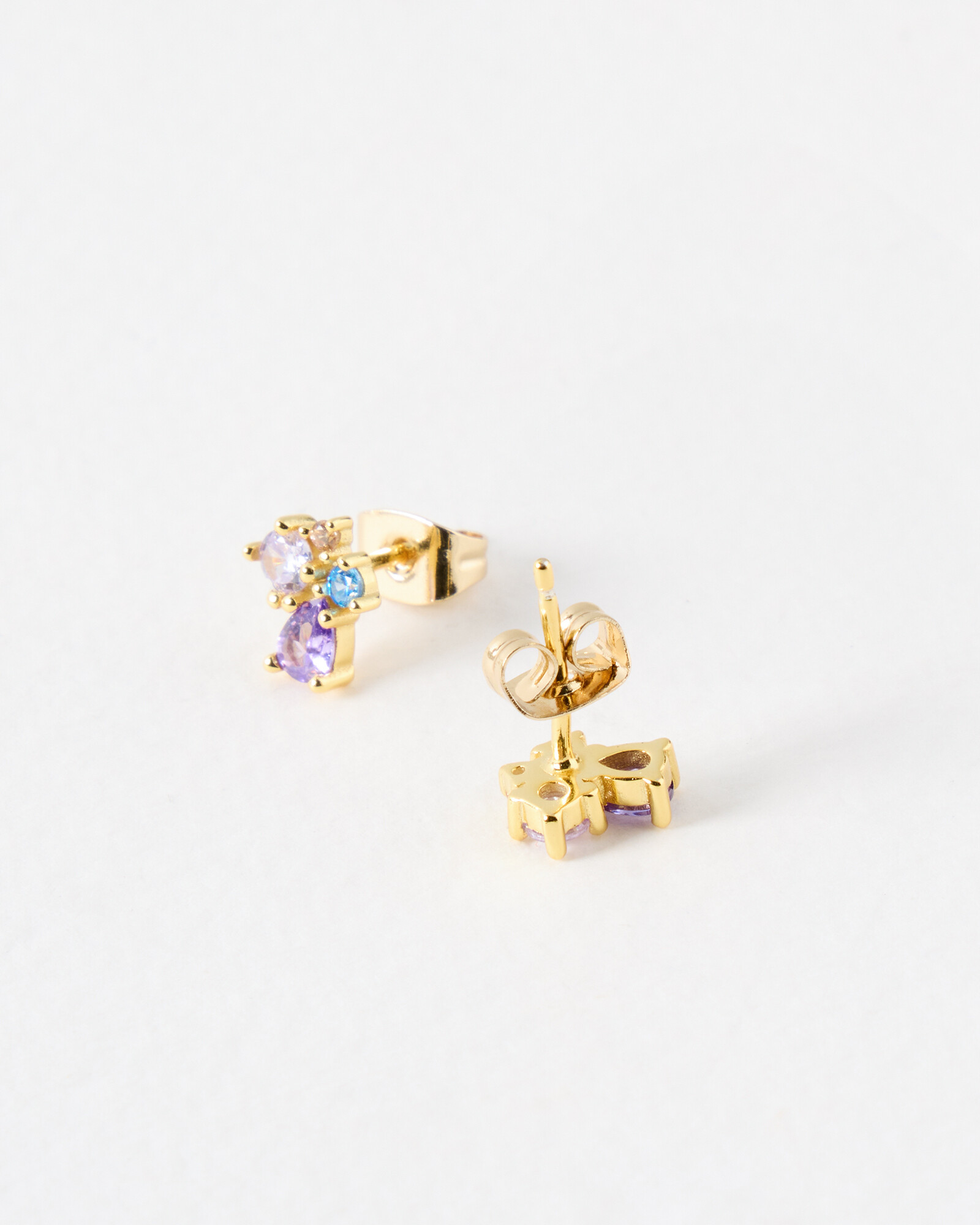 Pair of gold toned stud earrings with a multicoloured stone cluster, featuring small blue, purple and clear stones. Style as part of an earring stack or wear solo for a subtle, elegant look. Colour match with other jewellery pieces and accessories for complimentary styling.