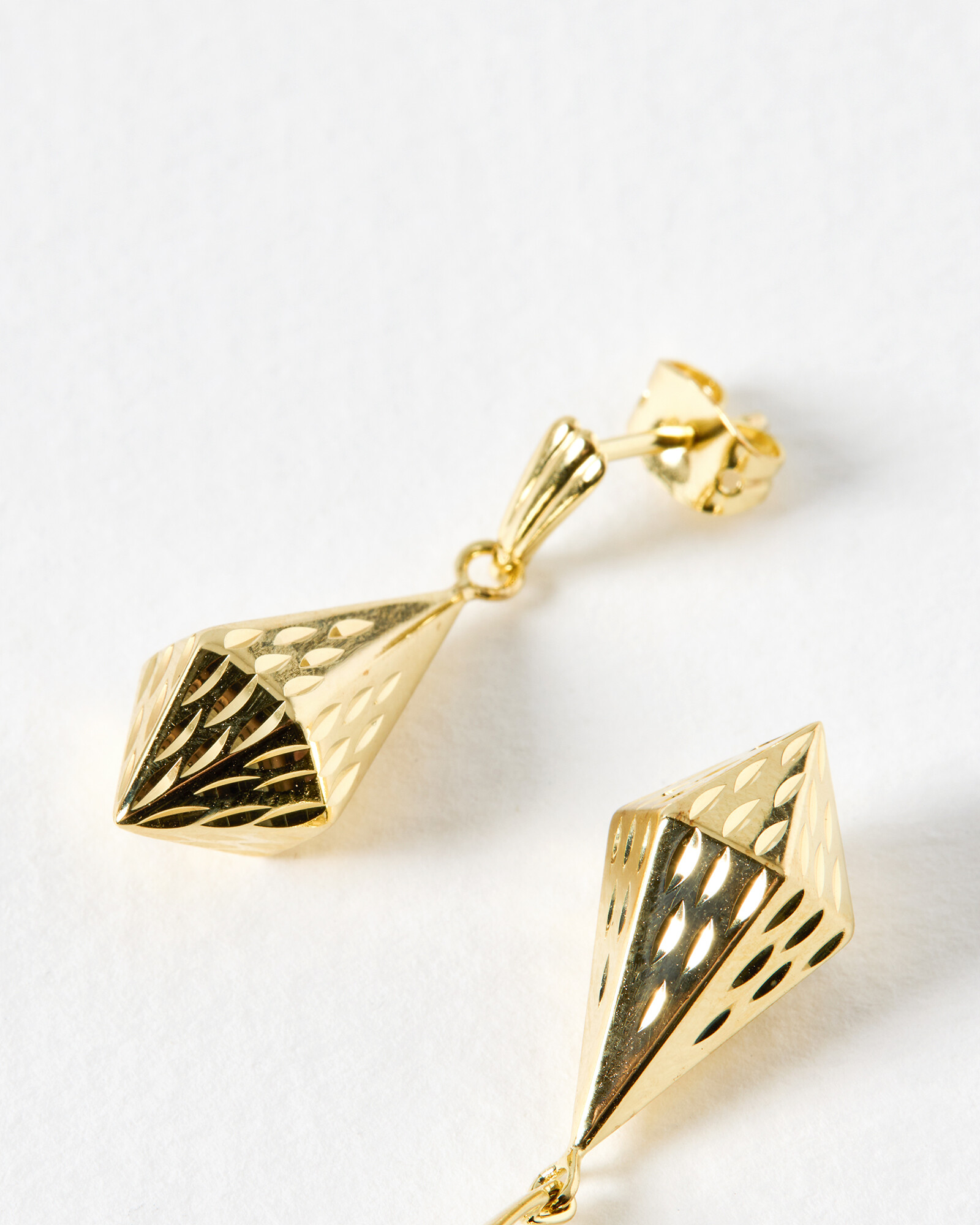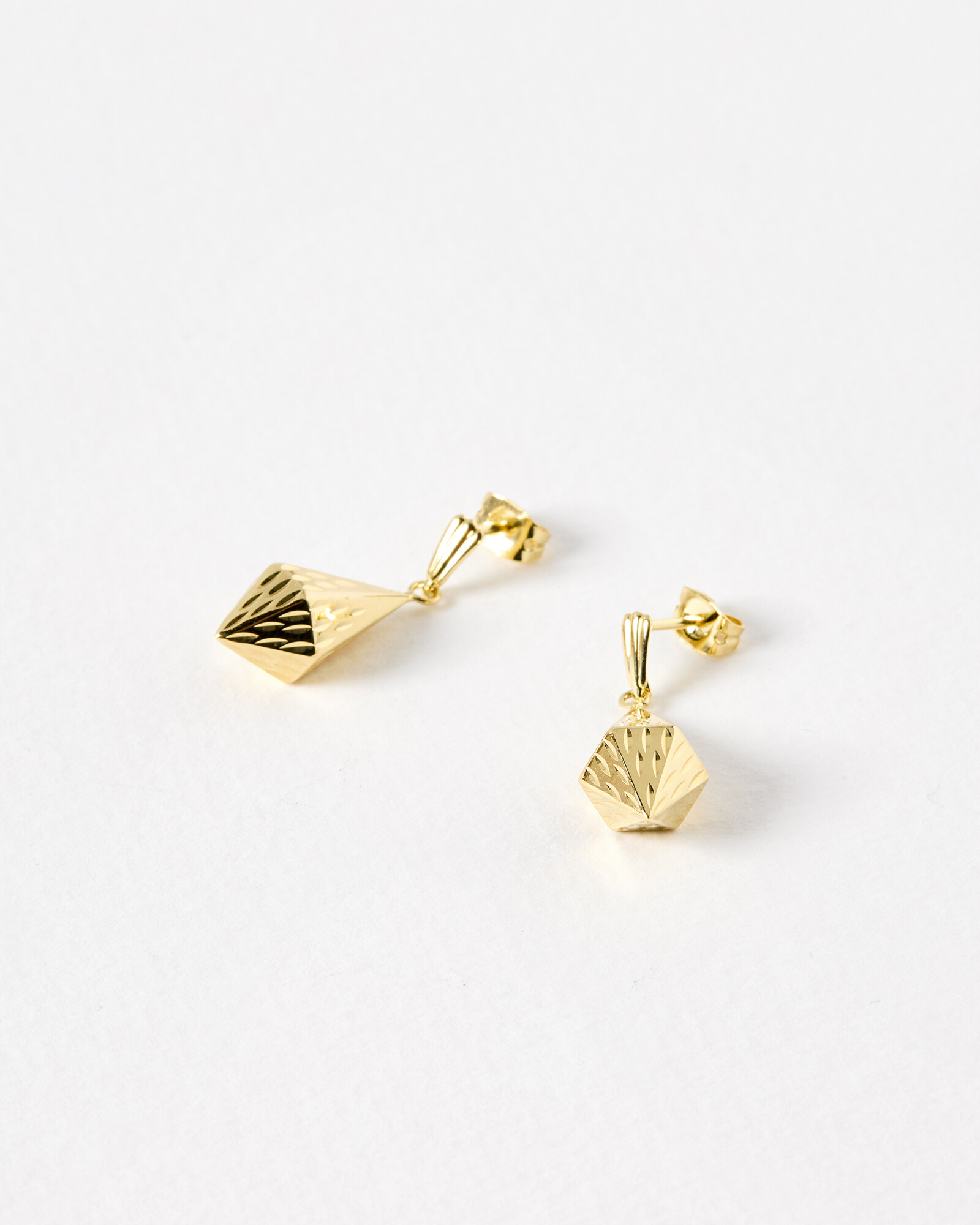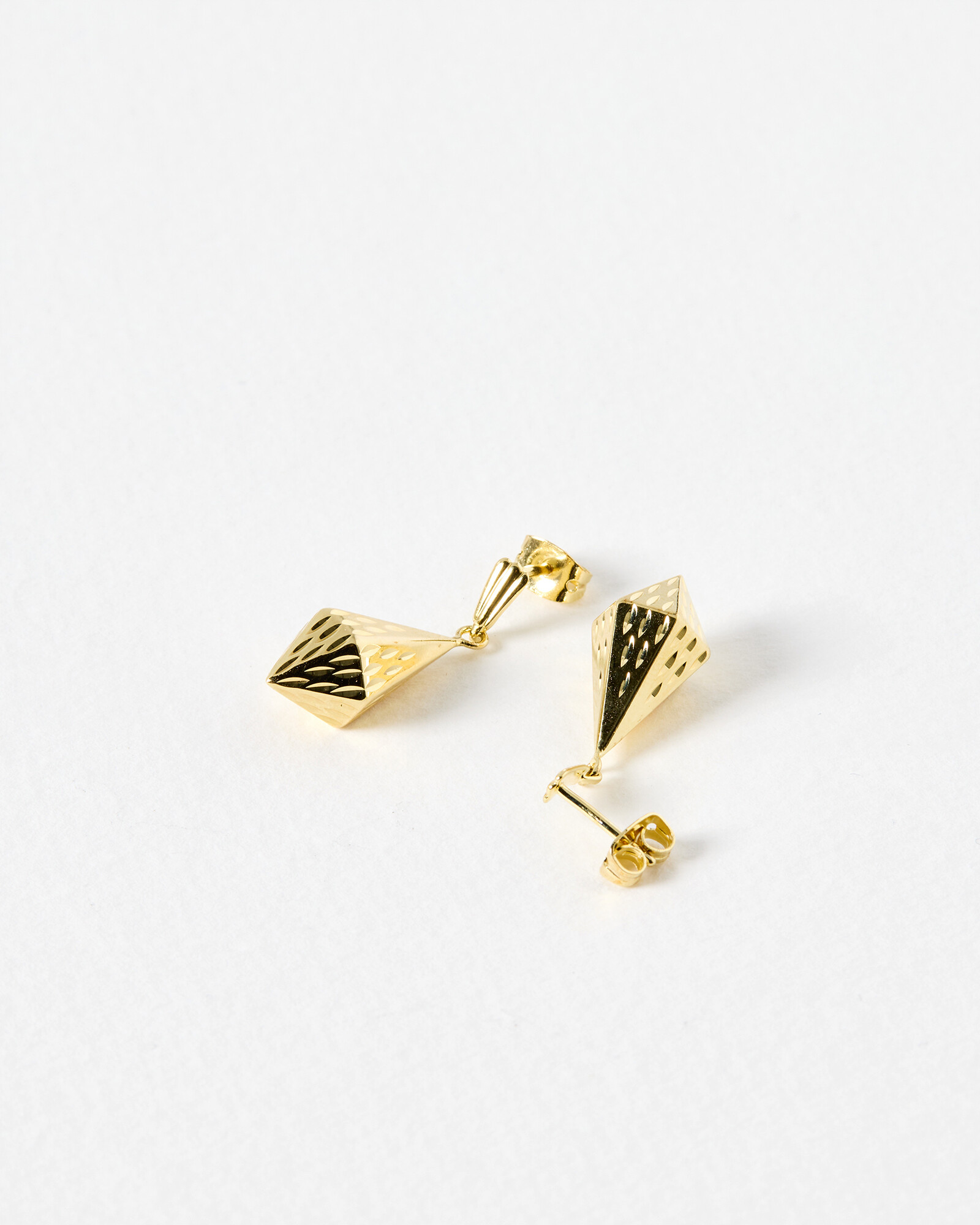 Engraved gold plated statement stud earrings, with a large diamond shaped drop featuring a carved surface for added textural effect.
