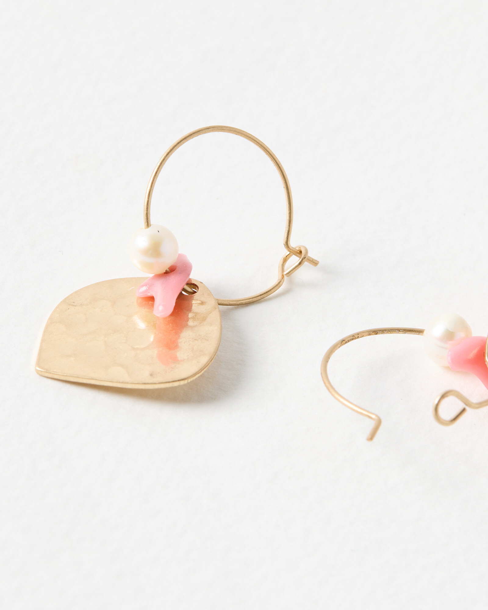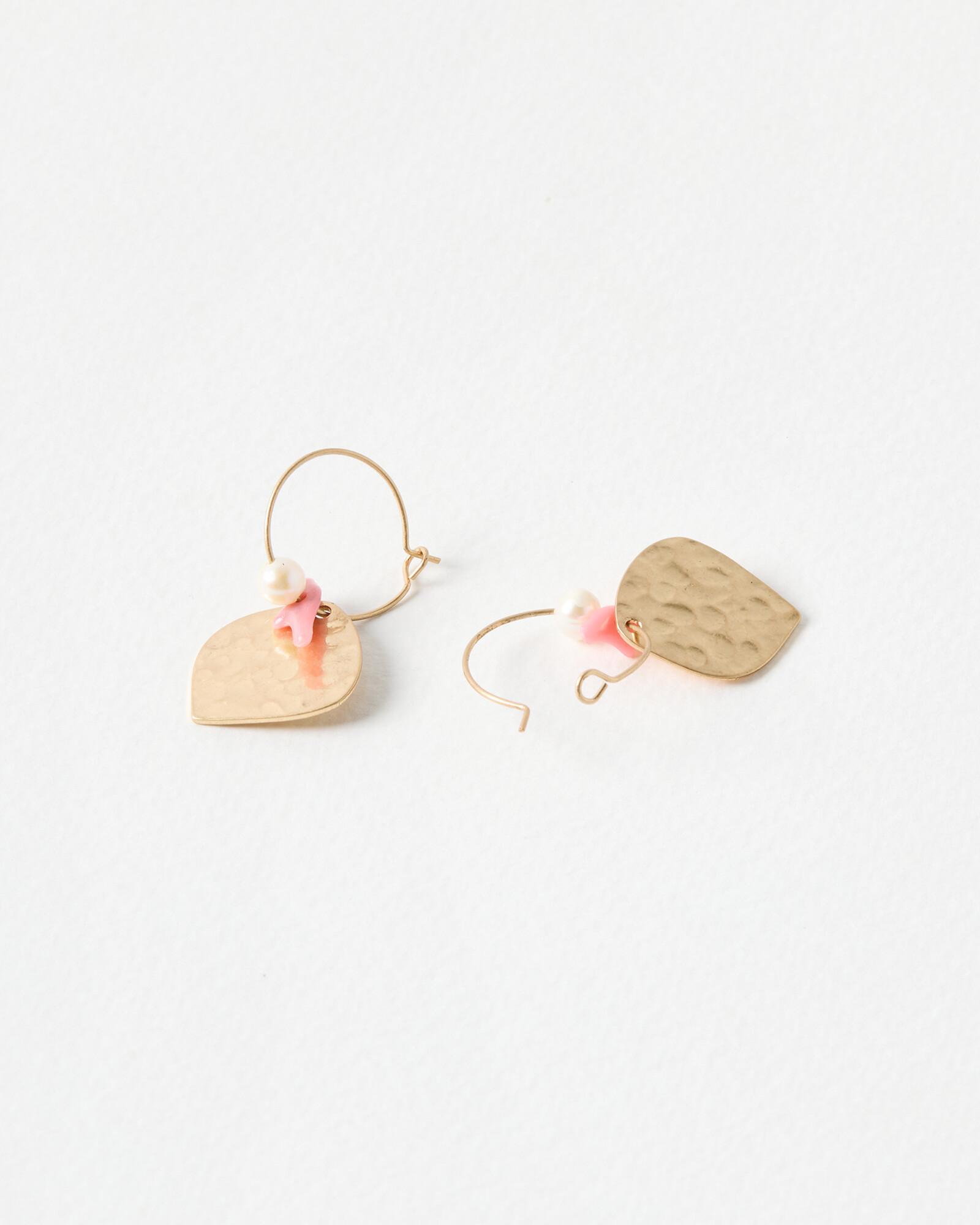 Gold toned wire hoop earrings featuring multiple charm drops, including a faux pearl bead, an abstract pink charm and a large, gold toned leaf with a hammered surface texture. Add texture and colour to your festival looks, pair with the matching Fern Layered Necklace, and combine with other colourful jewellery and accessories for summer-ready styling.