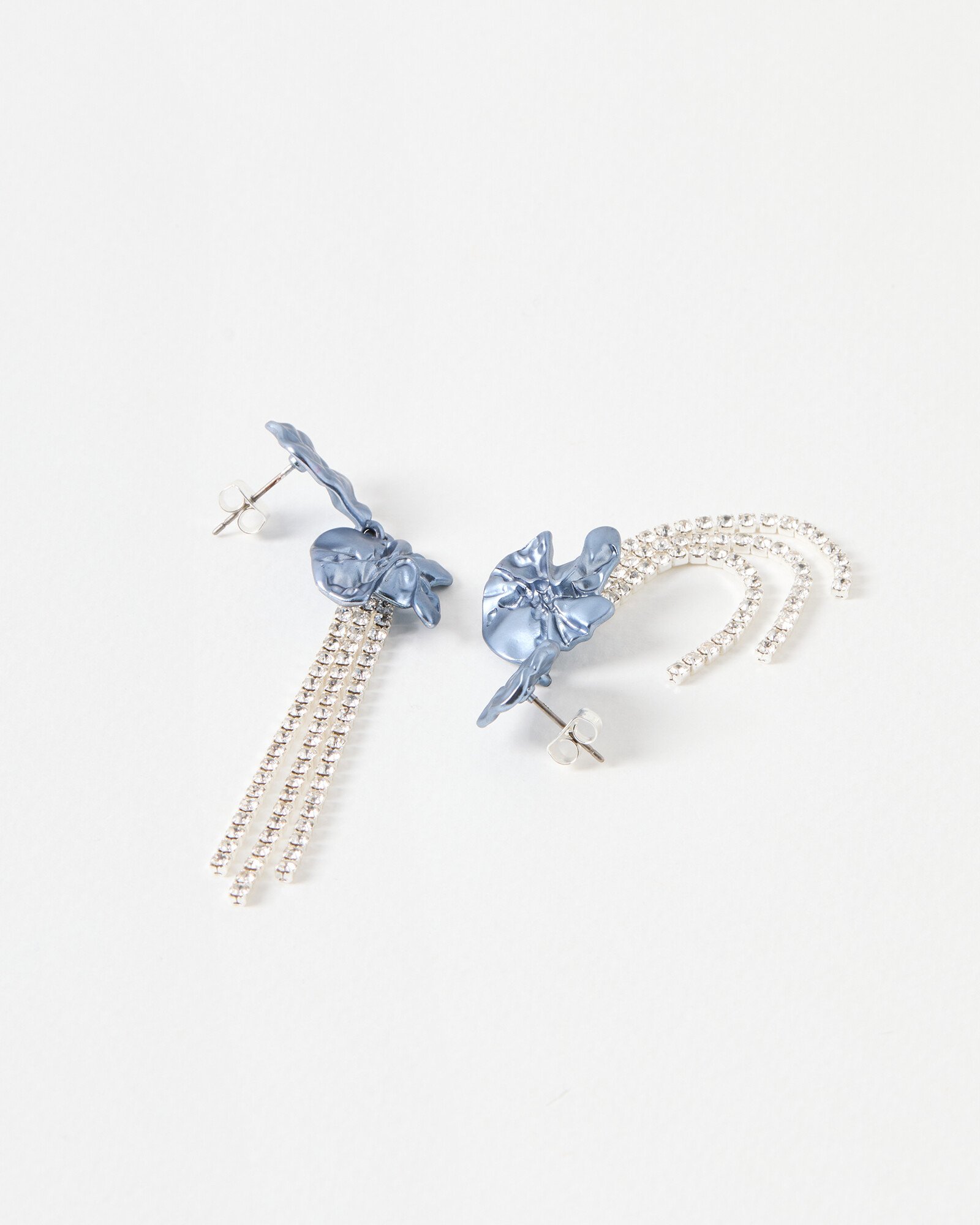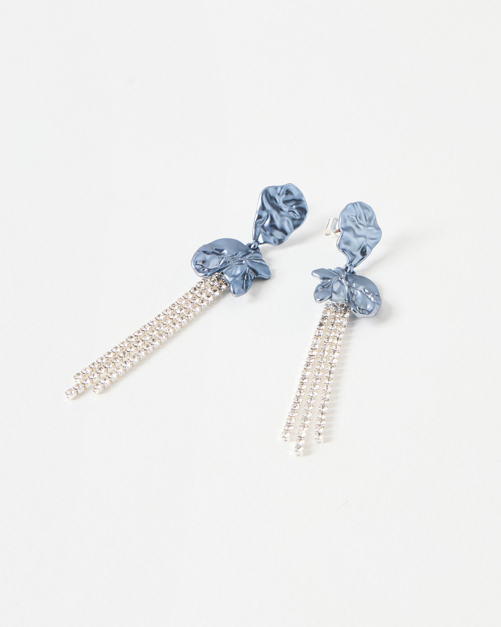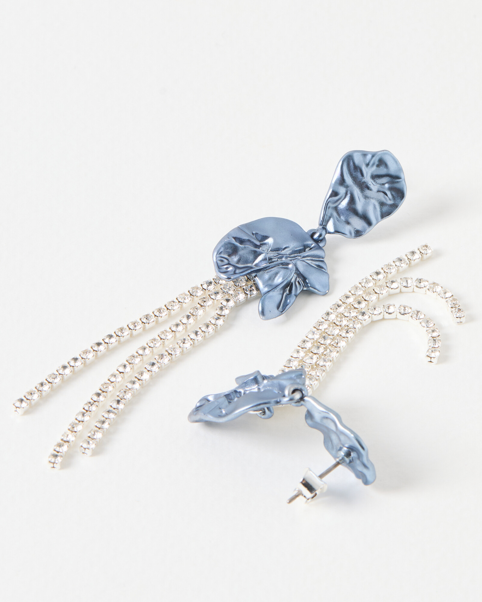 Organic shaped tassel earrings with a blue toned oval shaped stud and molten disc drop, followed by three silver gem tassels that drop towards the shoulder. Finished with a stud earring back for ease of wear.