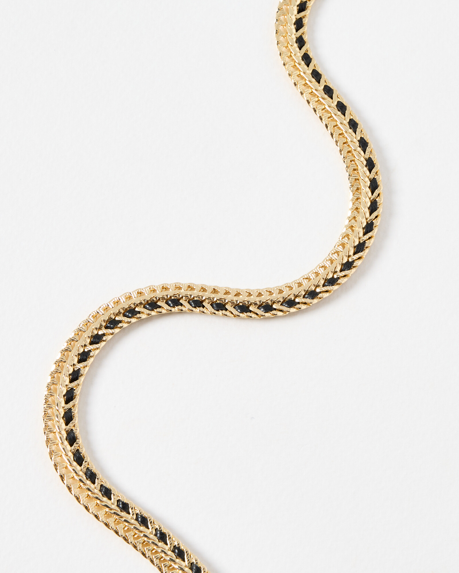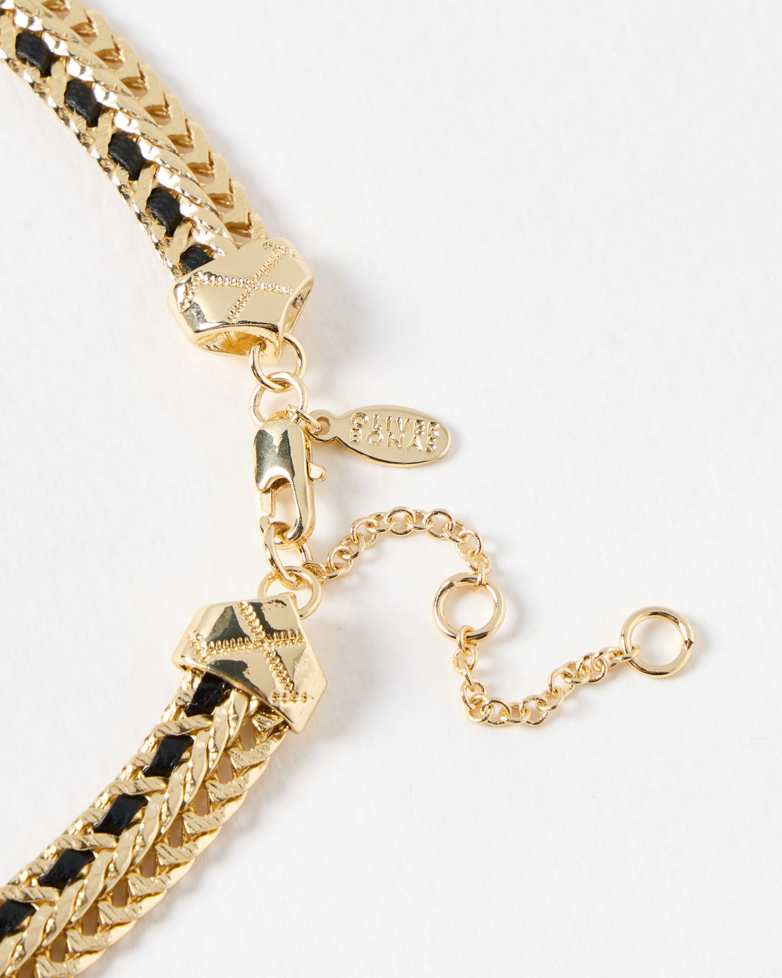 Gold tone chunky collar necklace with black PU intertwined within the chain which sits flat on your neckline. Features and adjustable lobster clasp fastening to wear at your preferred length.