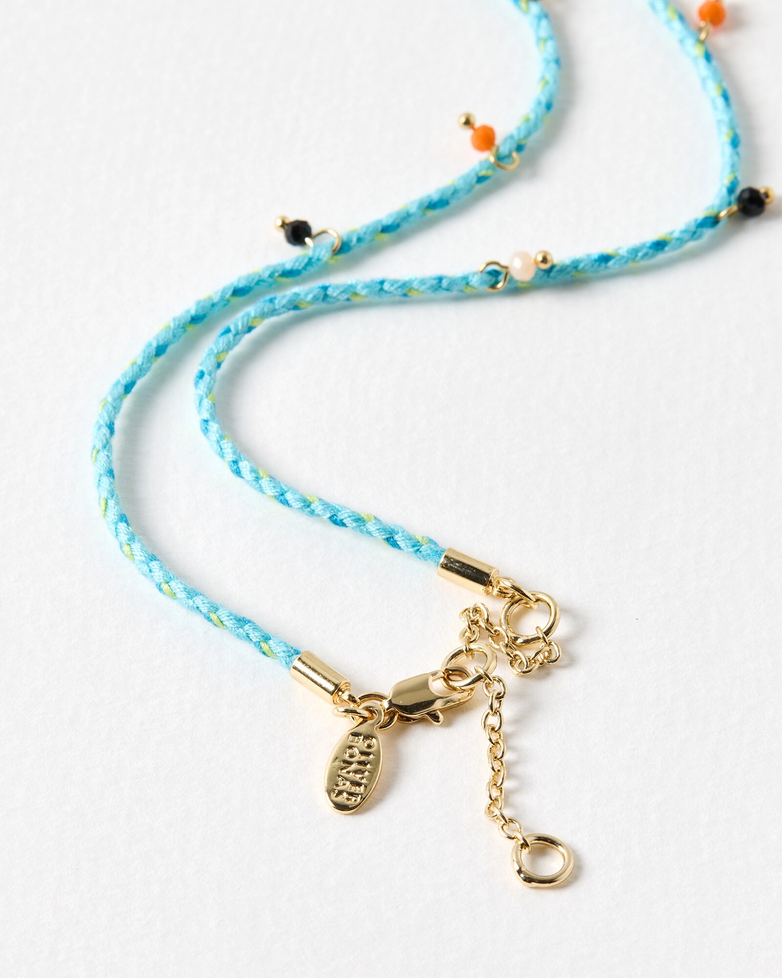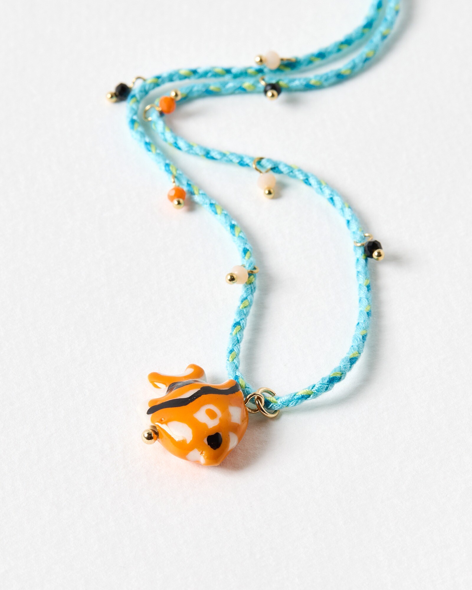 Colourful ceramic fish charm painted in orange and black hues, hung from a blue woven cord necklace with tiny bead details for a textural finish. A perfect layering necklace that can be worn either as a choker necklace or long necklace, for a colourful summer statement to wear on holiday and at the beach.