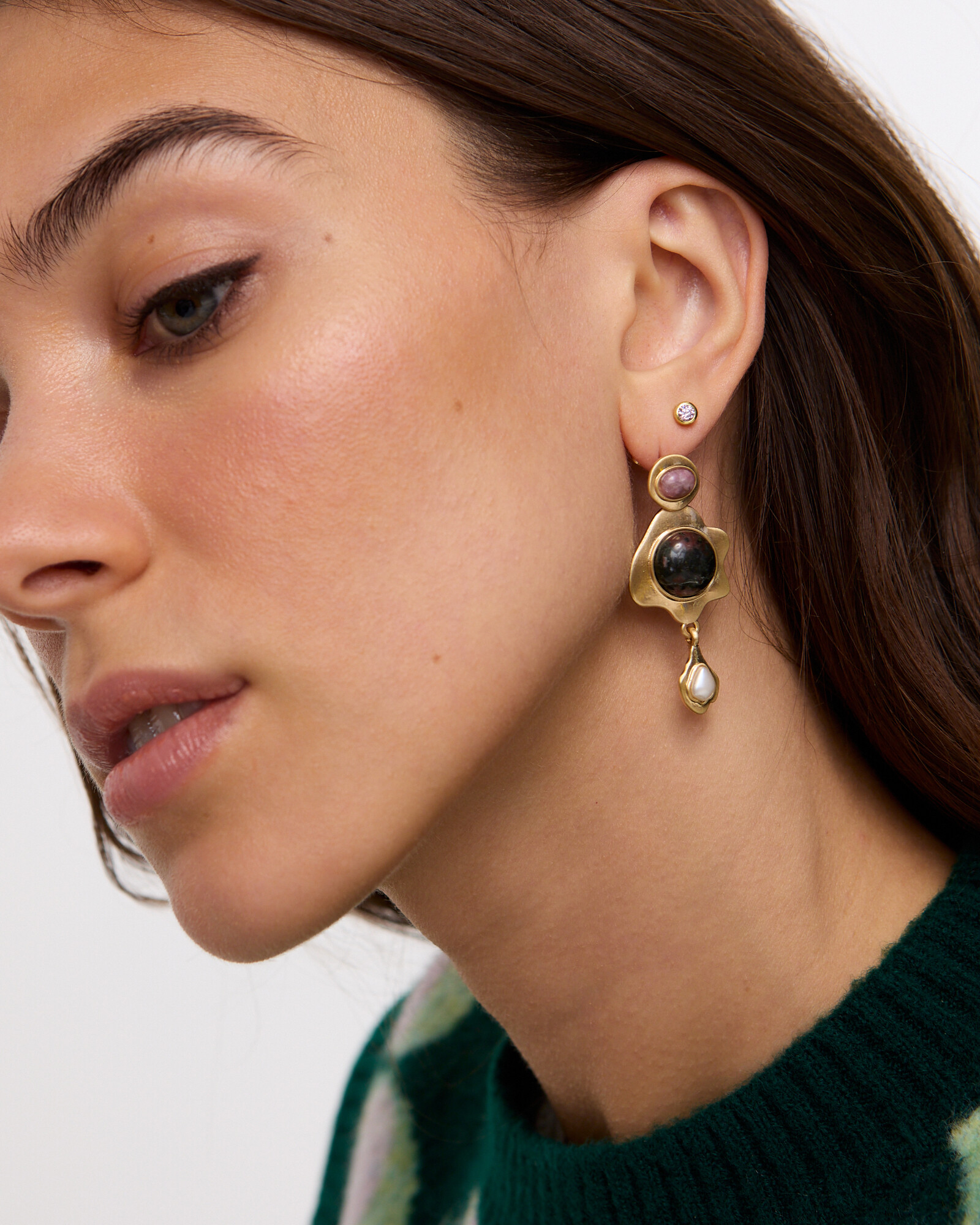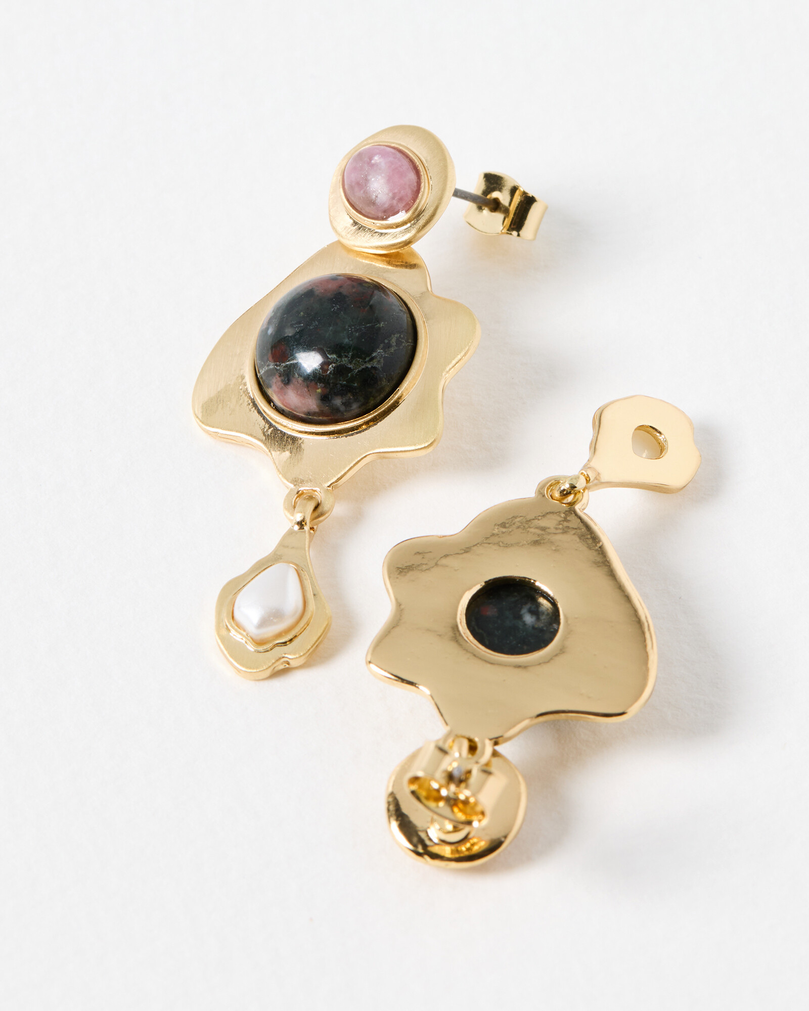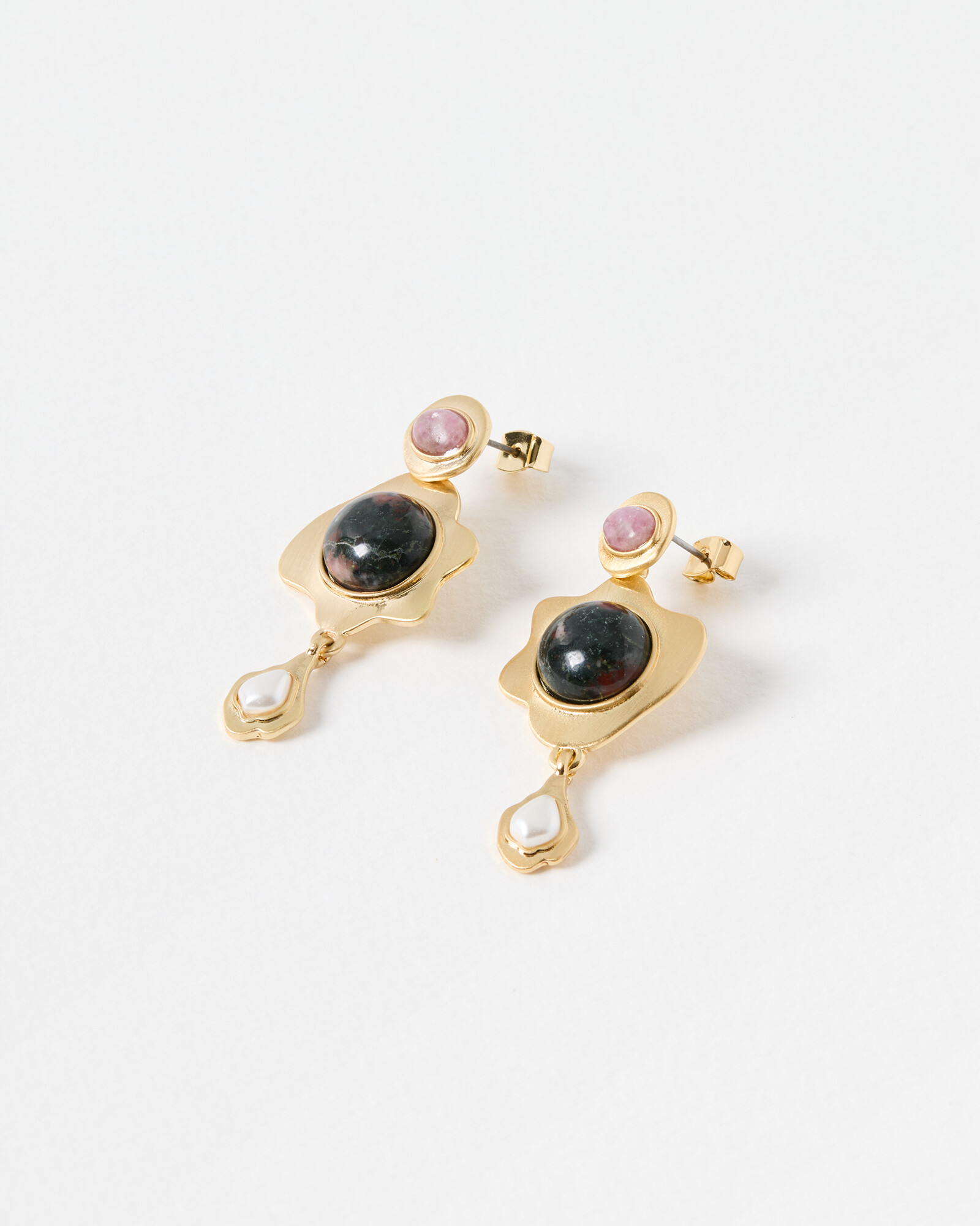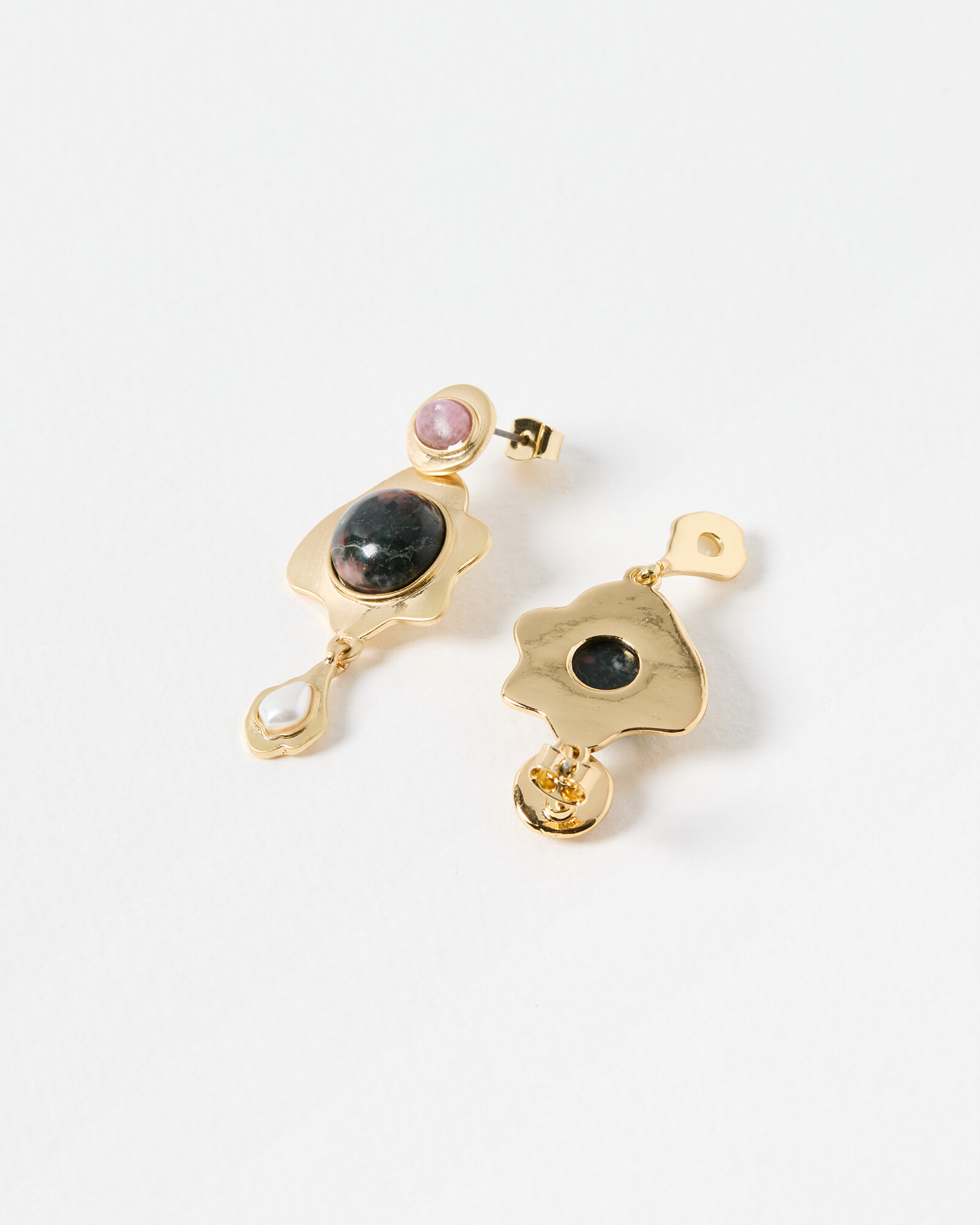 Gold tone drop earrings with a pink oval stone, organic-shaped charm and faux pearl inlay. Natural stone may exhibit slight colour variations, making each piece individual.