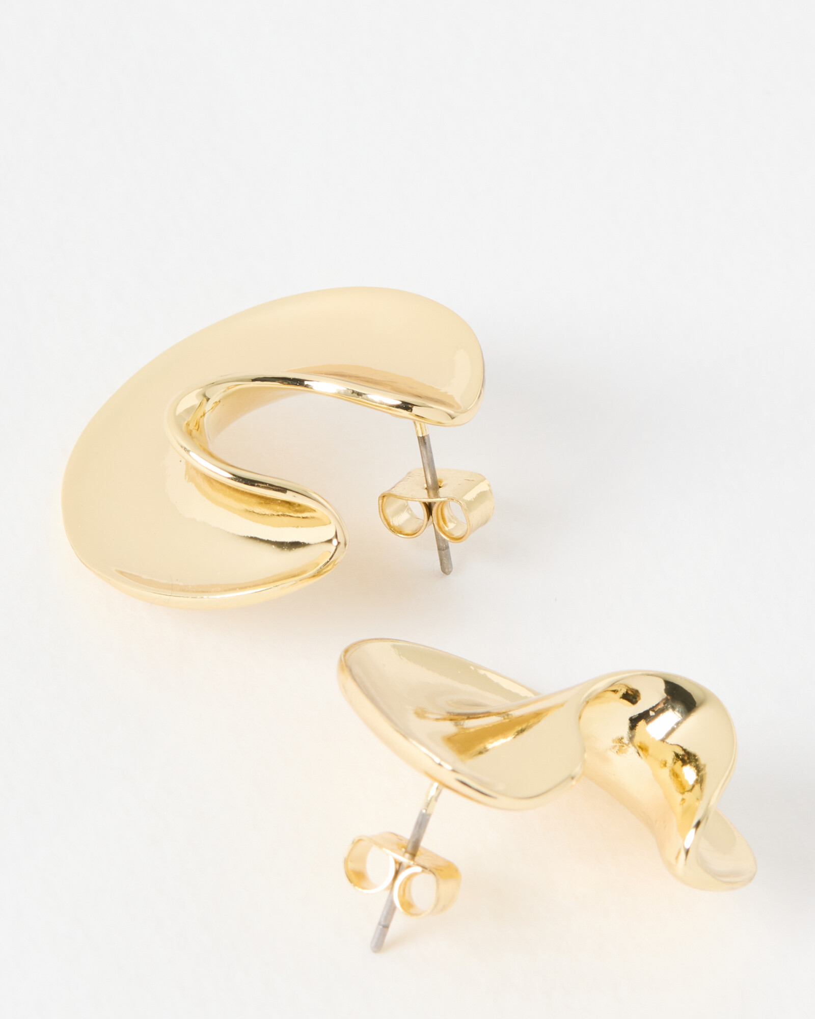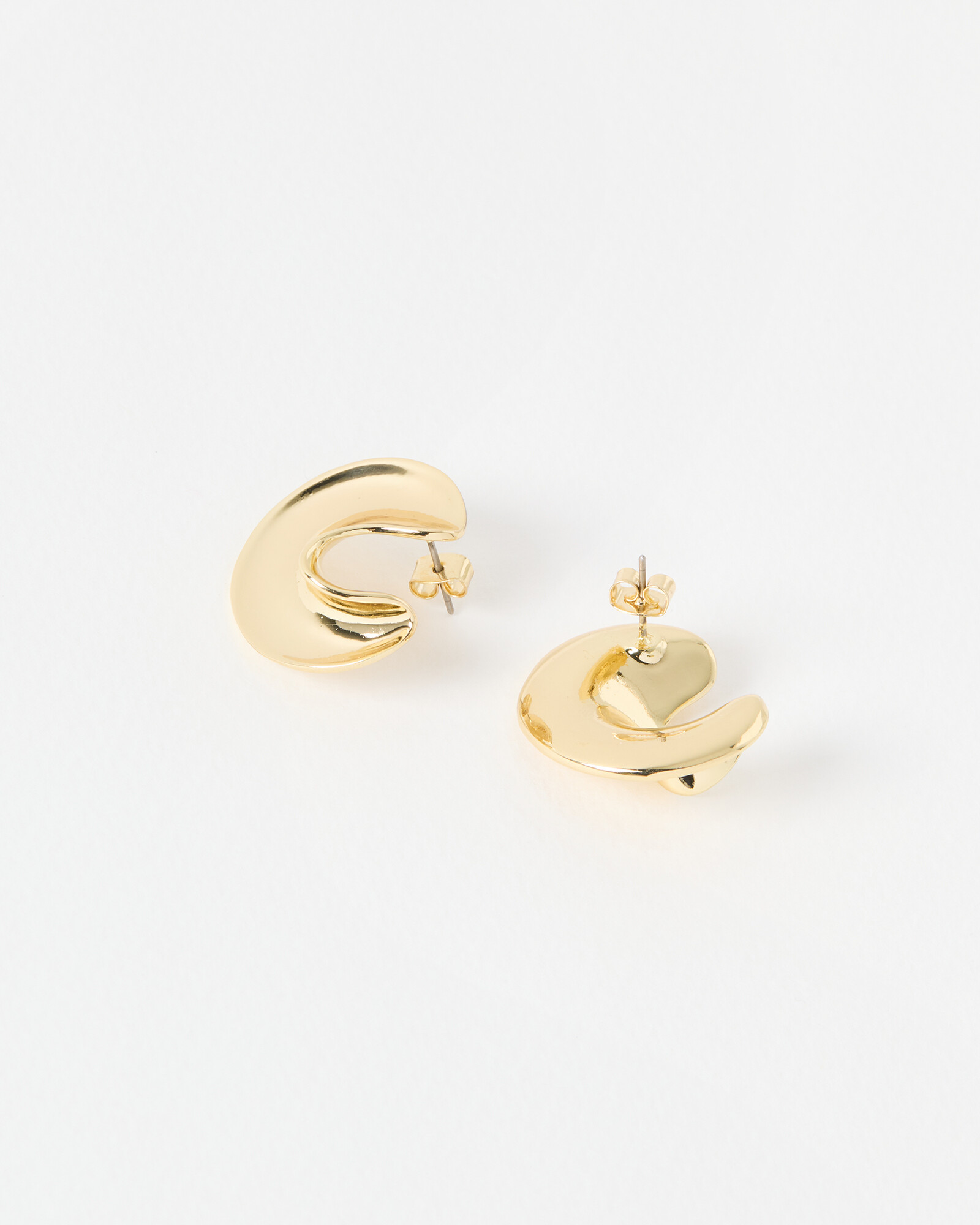 Large gold tone statement earrings with a stud back for comfortable wear. Featuring a broad, sweeping curve in a circular profile, these gold statement earrings have a high shine surface and architectural look. Perfect for evenings and events, style with a structural gold bangle and necklace for a bold, statement effect.