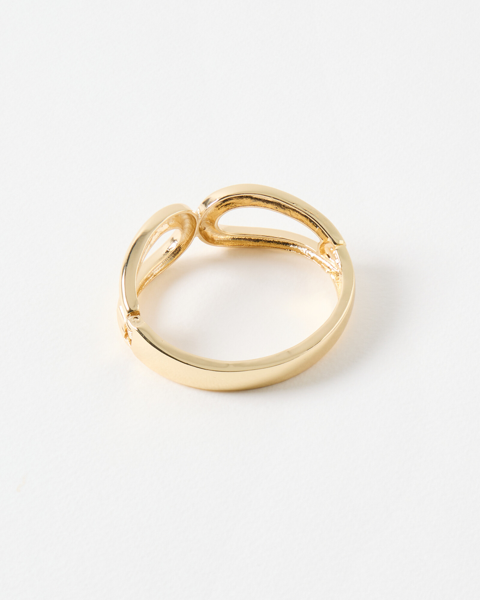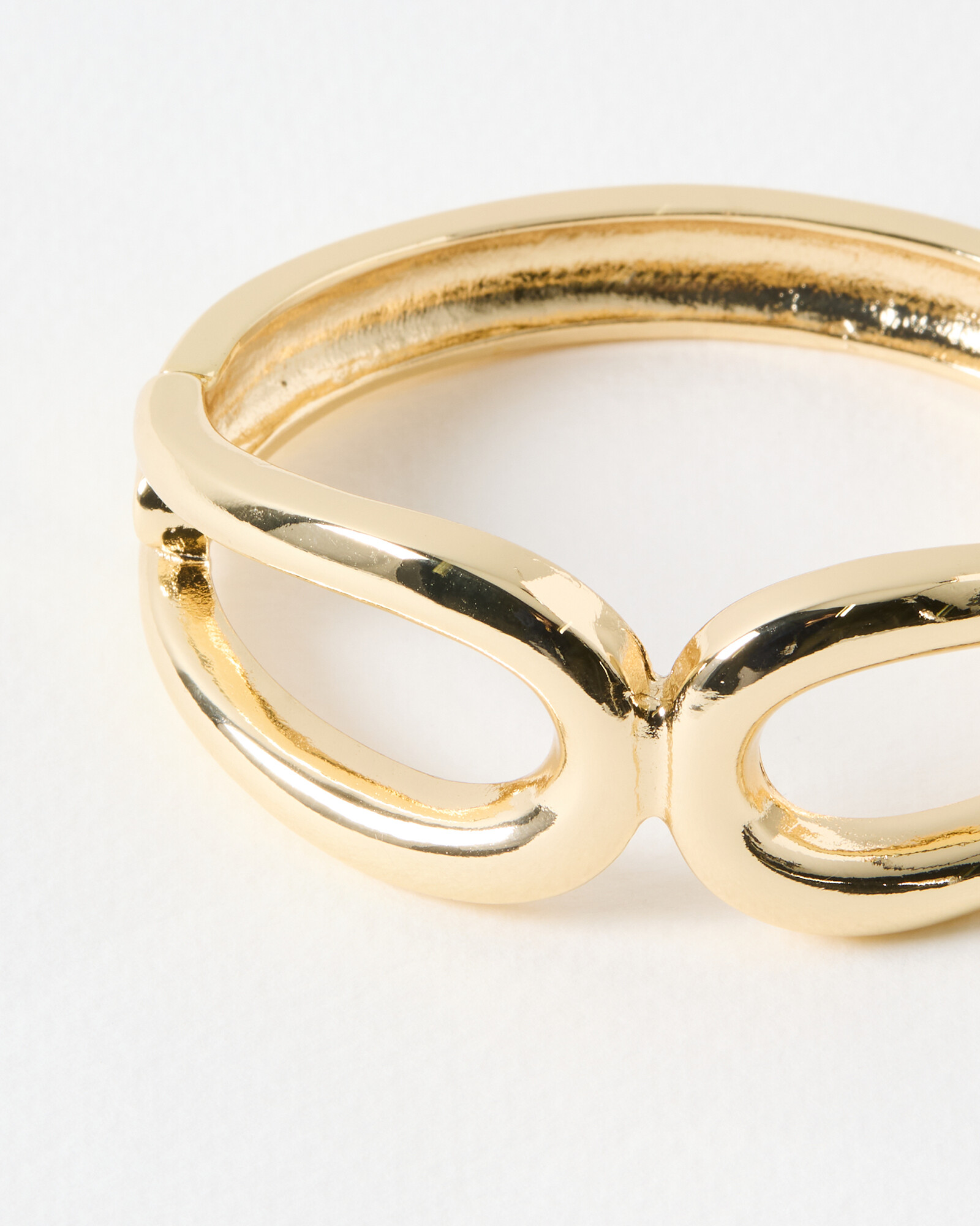 Statement gold tone bangle featuring a chunky double loop feature that joins together in a tapering finish. With a hinge closure and high-shine surface, style this statement gold bangle with matching gold jewellery pieces for summer events and evening outfits.
