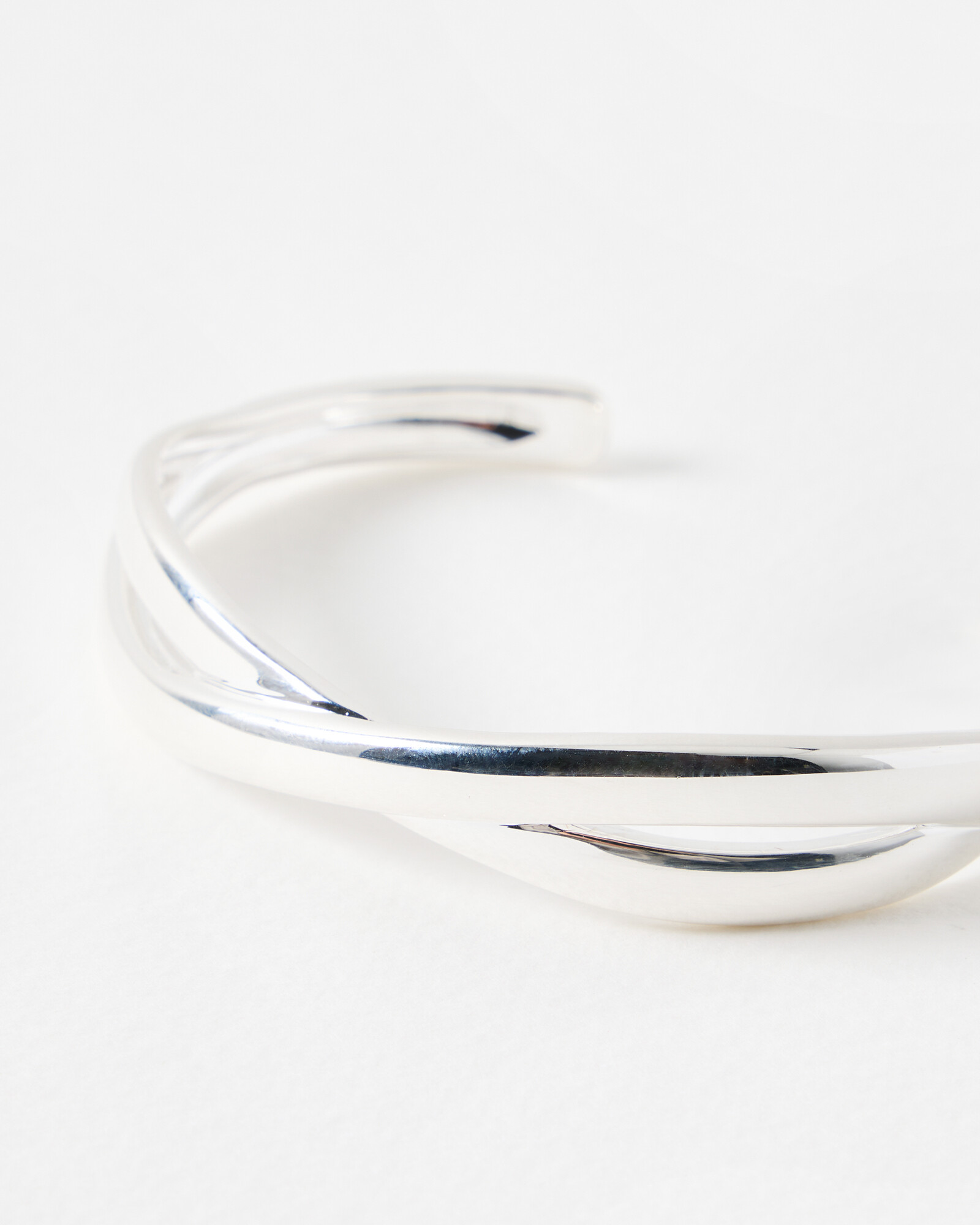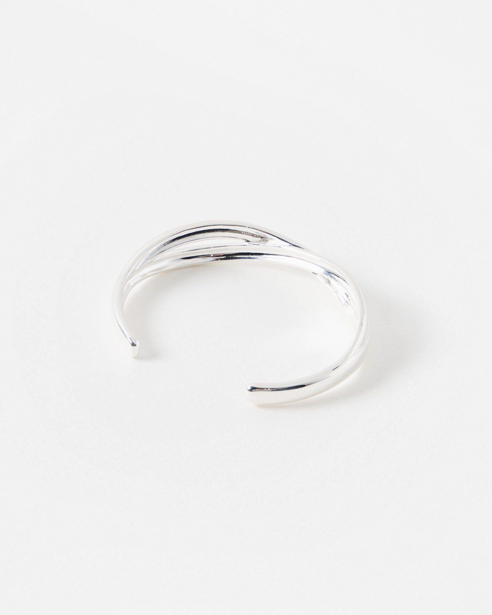 Chunky silver plated cuff bangle with two smooth interweaving strands. Finished with a polished shine, style as part of your silver bangle stack, or pair with the matching Petra Hoop Earrings and Petra Silver Ring for a stand-out look.
