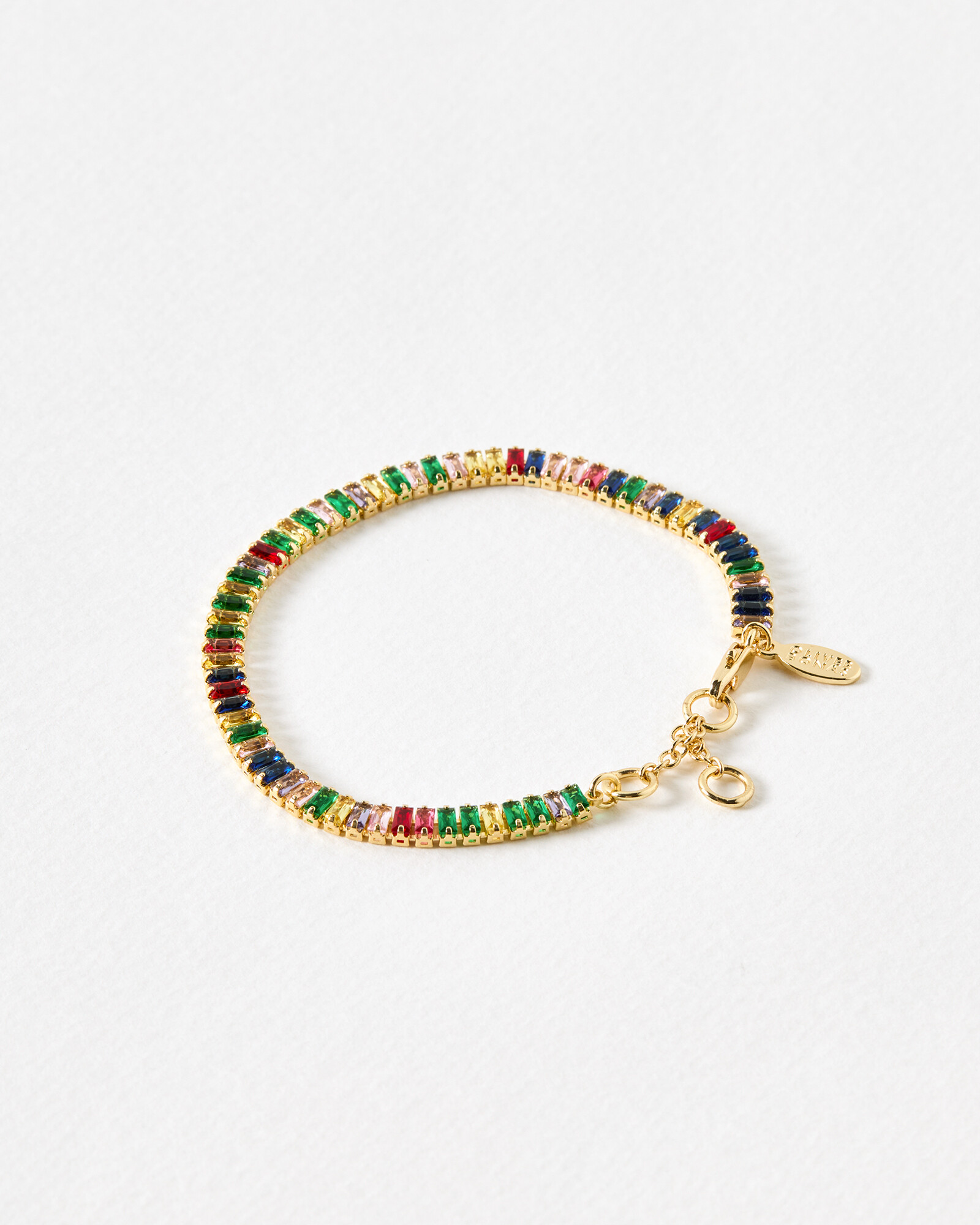 Wide chain bracelet with colourful baguette stones inlaid in a gold tone design.