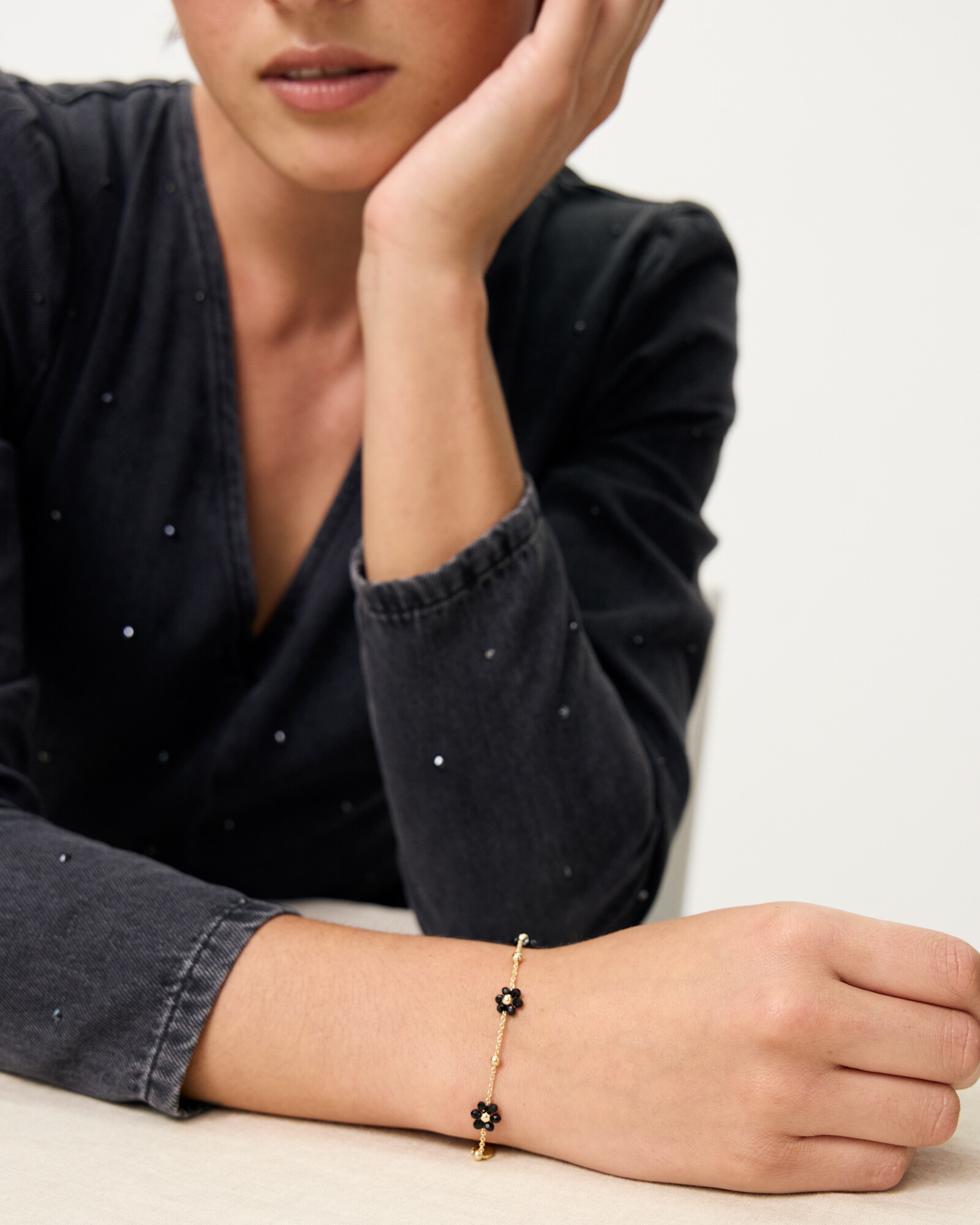 Bobble chain bracelet in a gold-toned metal with an adjustable lobster clasp for ease of wear, and four black beaded flowers set along the chain.