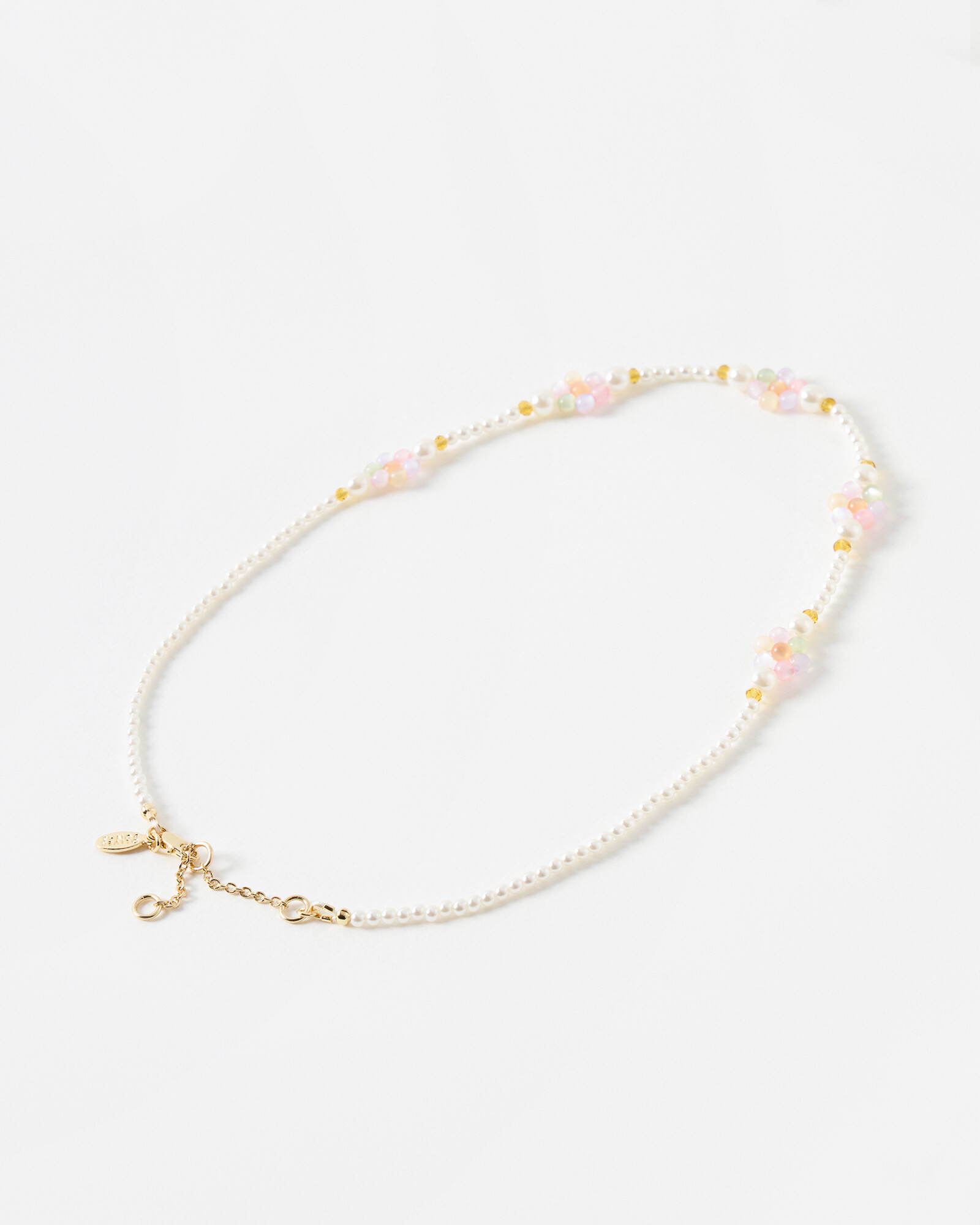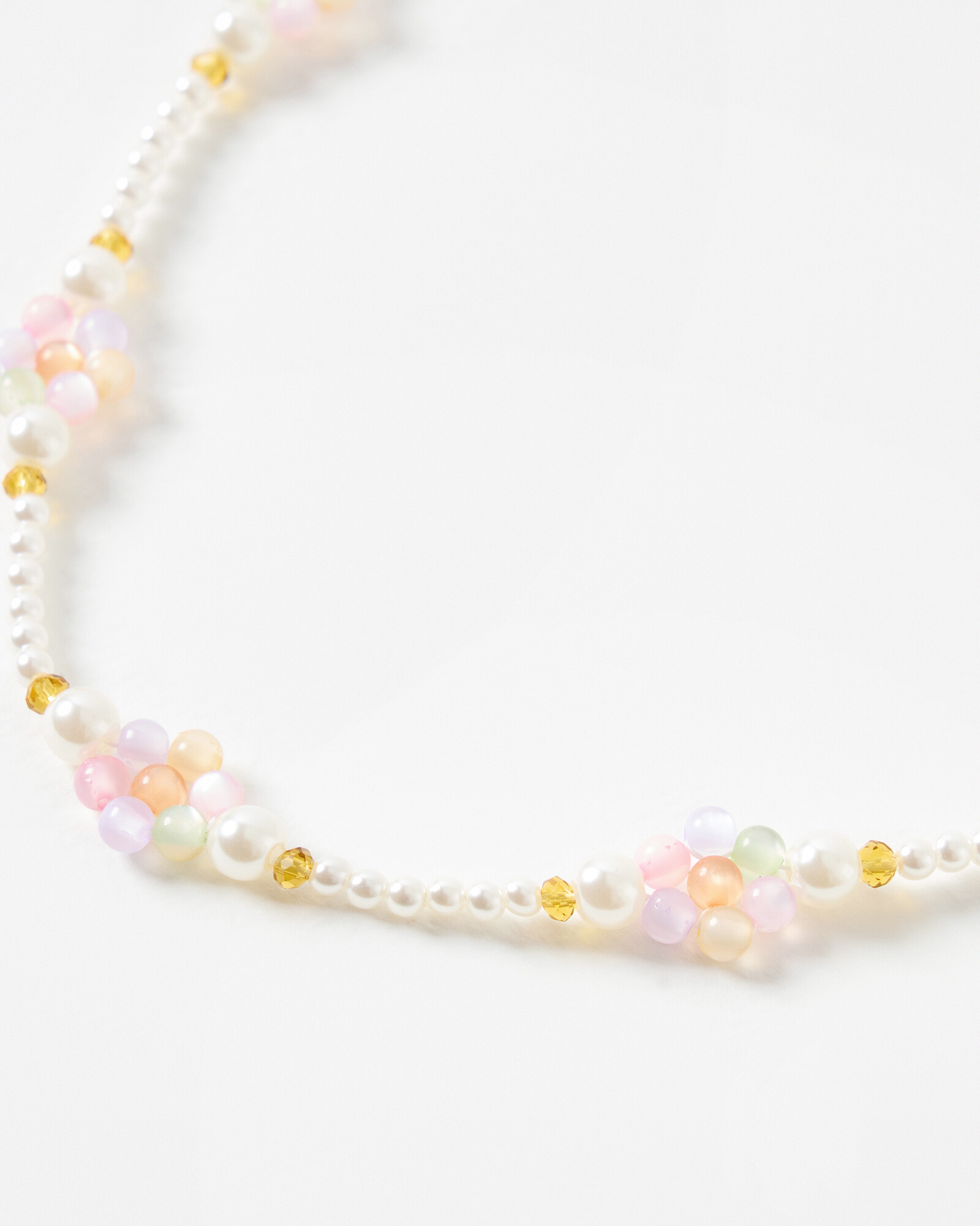 Faux pearl collar necklace with beaded flowers made from tonal pastel yellow and pink beads. Pair with the matching Rosie Flower Earrings to complete the set, or wear with pearl earrings and colourful clothing accents for playful summer styling.